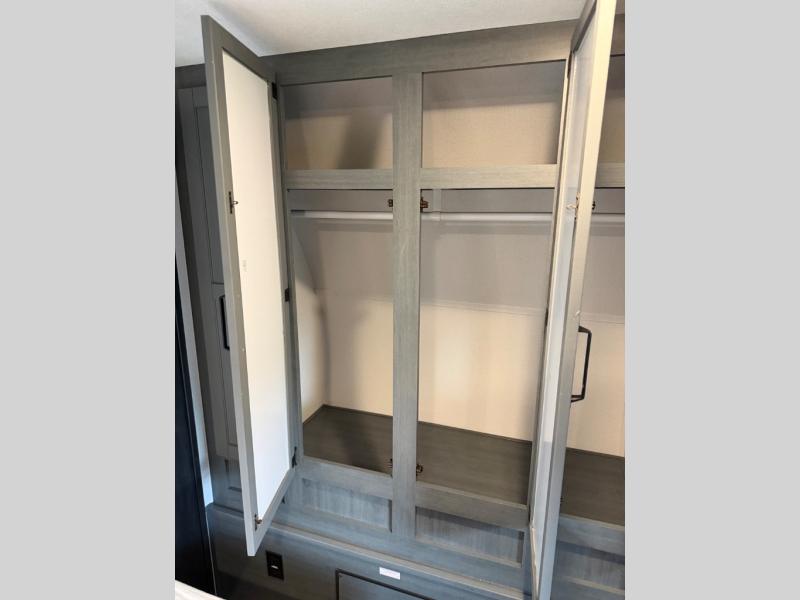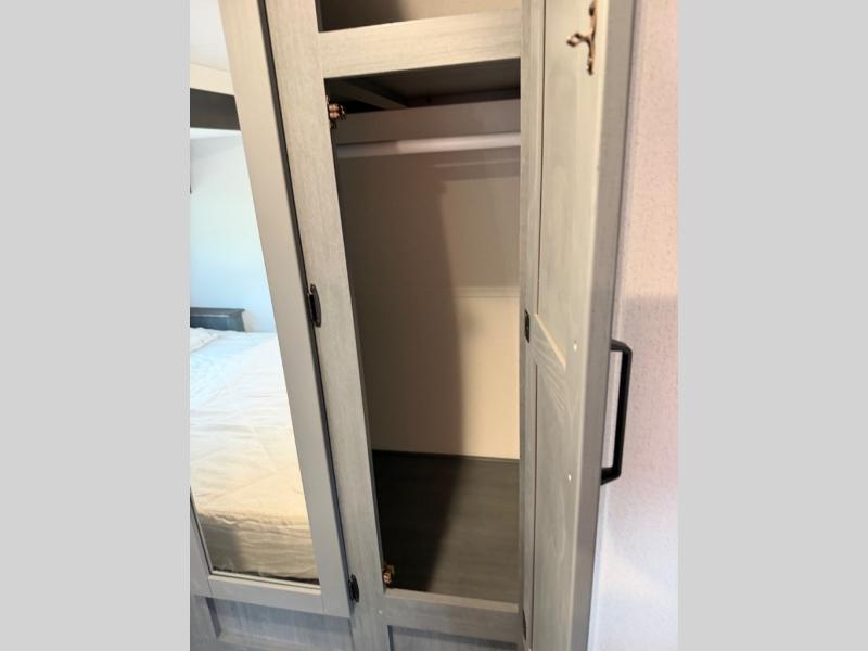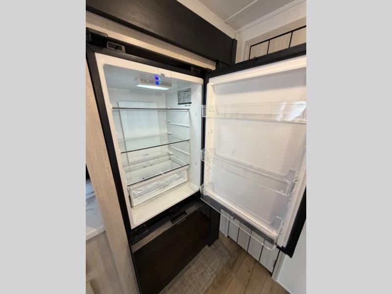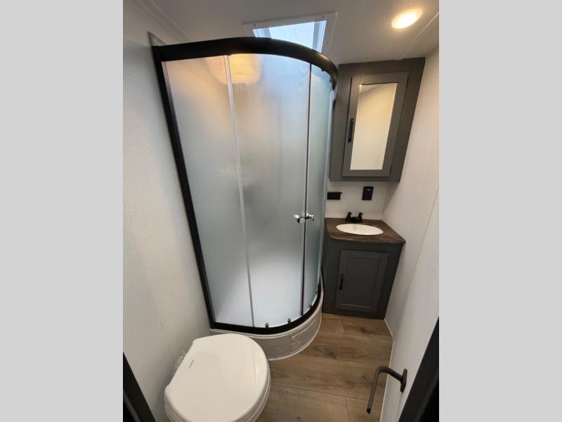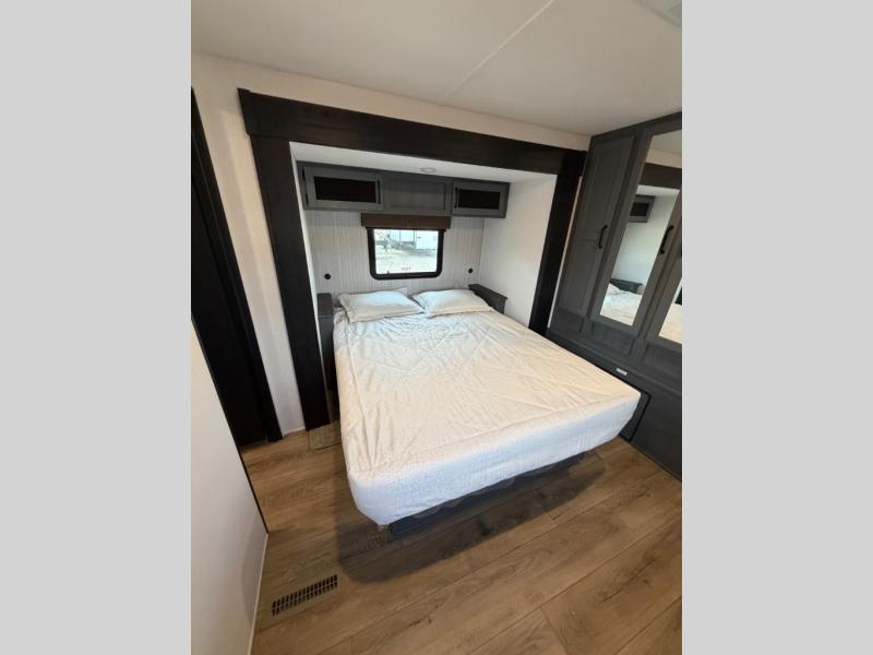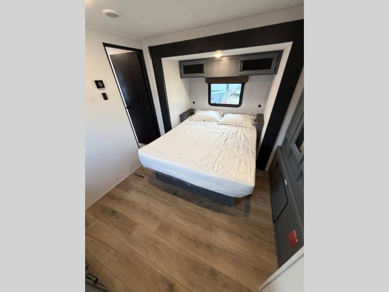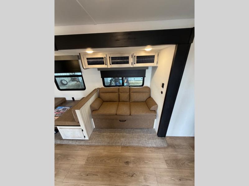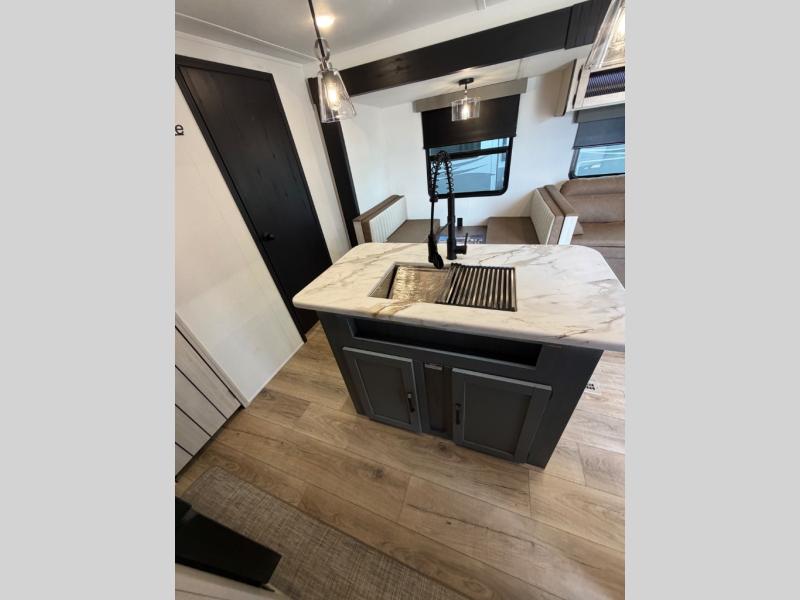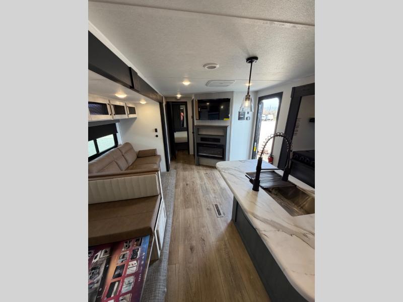 You will be the talk of the campground with this travel trailer! The front private bedroom has a queen bed slide across from a dresser and a front closet plus a second closet with washer and dryer prep. Freshen up each morning in the full bathroom with the 34" x 34" radius shower then head to the kitchen to fry up some eggs with the stainless-steel oven and range. You can enjoy your meals at the booth dinette, and the kitchen island will make your clean up easier with the sink that has a high-rise faucet and sprayer. The rear private bunkhouse has a 32" x 69" bunk above a jiffy sofa slide, a 36" x 69" bunk above a 36" x 71" bunk and a linen closet. Choose one of the outside kitchen options for even more convenience!