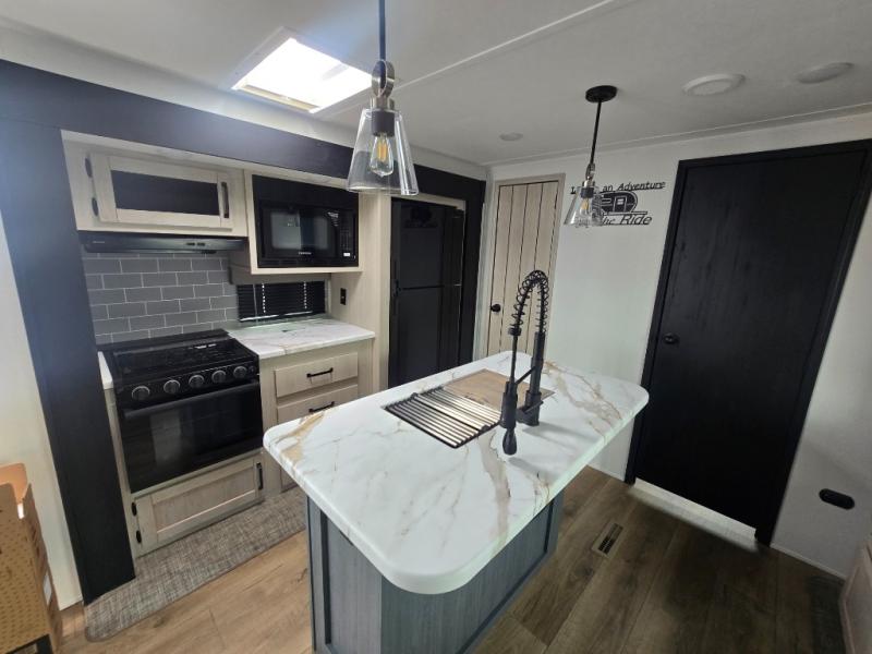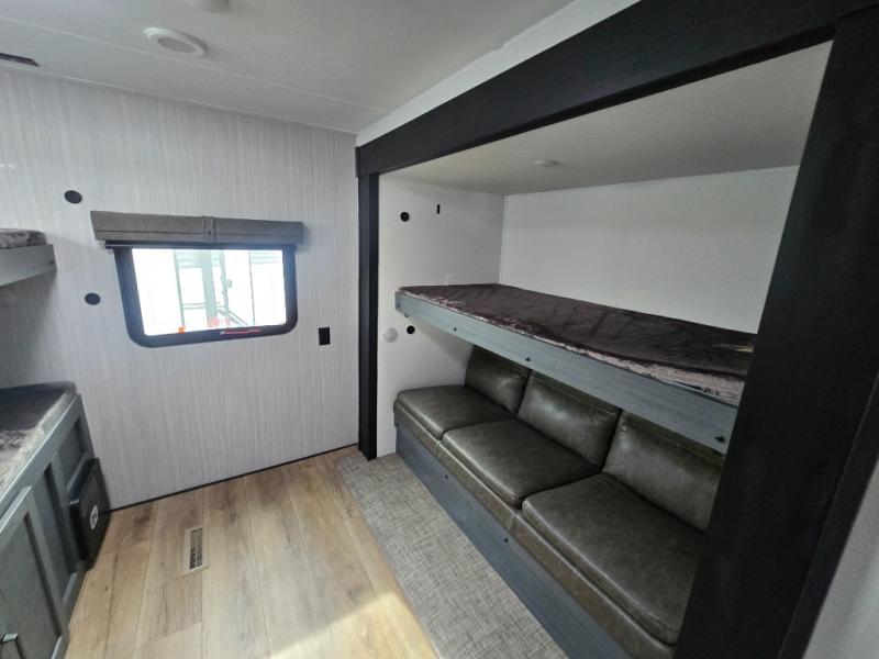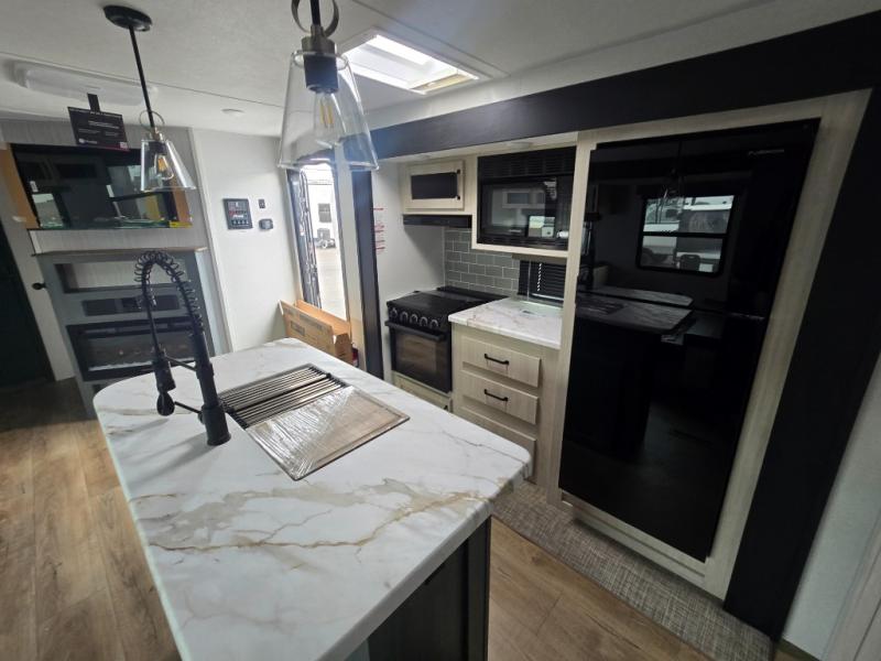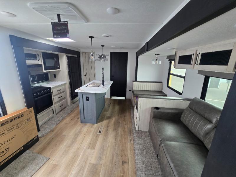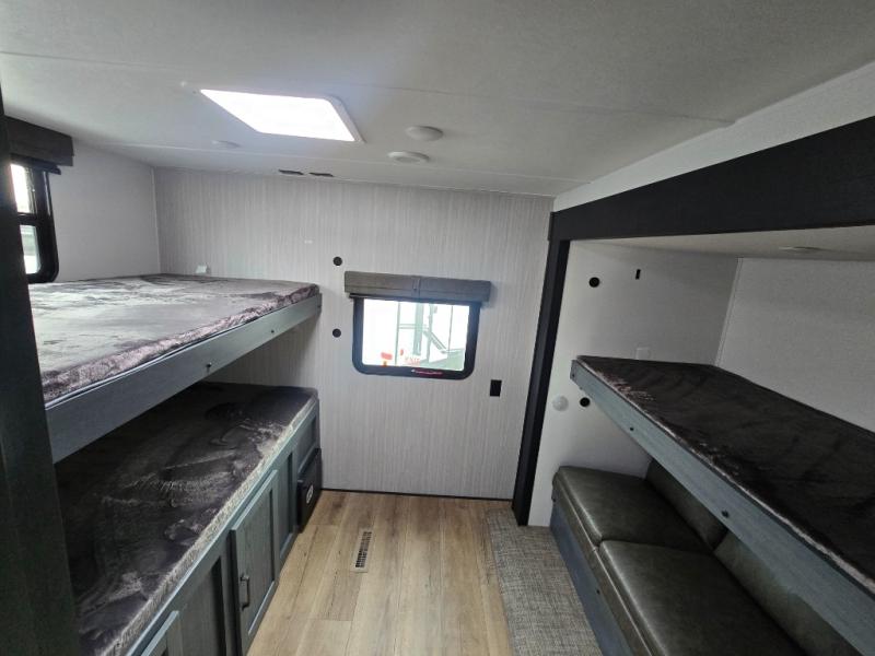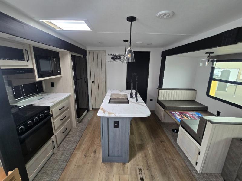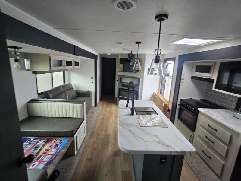 You will be the talk of the campground with this travel trailer! The front private bedroom has a queen bed slide across from a dresser and a front closet plus a second closet with washer and dryer prep. Freshen up each morning in the full bathroom with the 34" x 34" radius shower then head to the kitchen to fry up some eggs with the stainless-steel oven and range. You can enjoy your meals at the booth dinette, and the kitchen island will make your clean up easier with the sink that has a high-rise faucet and sprayer. The rear private bunkhouse has a 32" x 69" bunk above a jiffy sofa slide, a 36" x 69" bunk above a 36" x 71" bunk and a linen closet. Choose one of the outside kitchen options for even more convenience!
