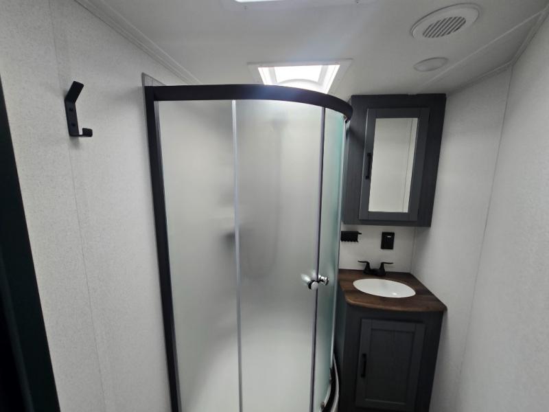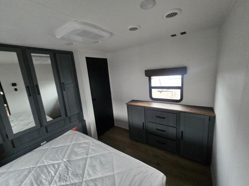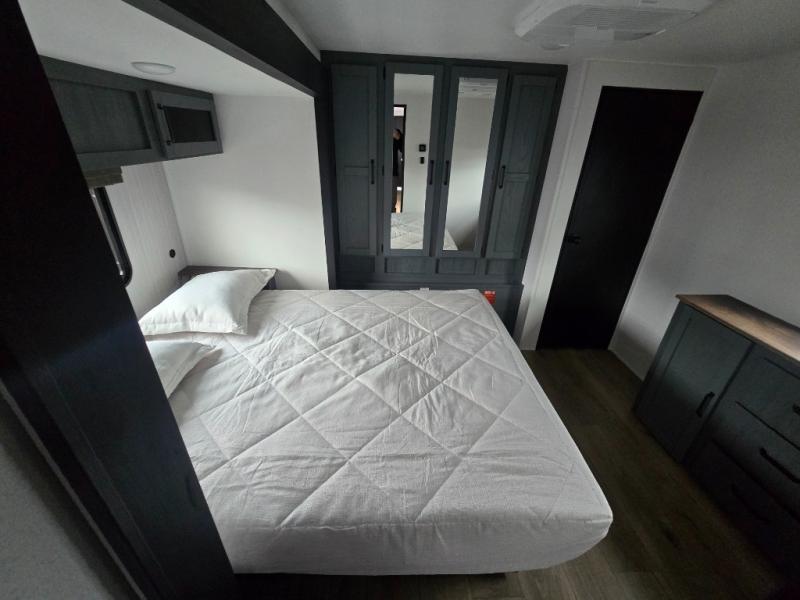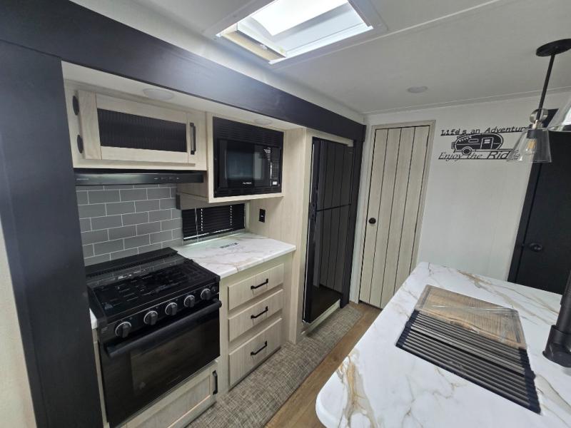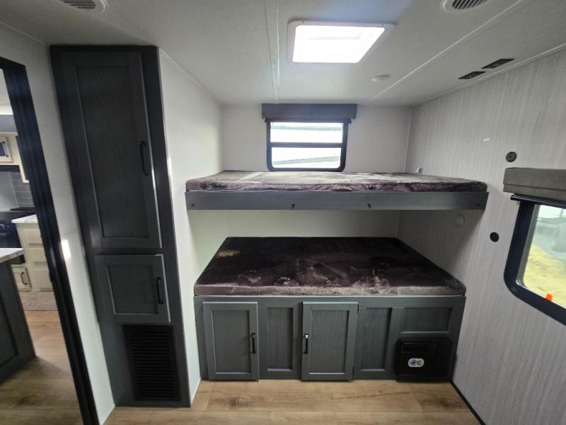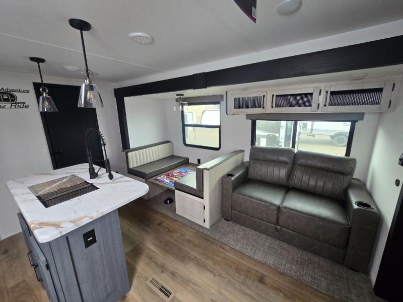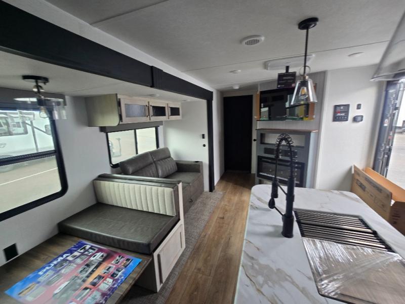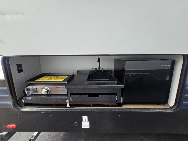 You will be the talk of the campground with this travel trailer! The front private bedroom has a queen bed slide across from a dresser and a front closet plus a second closet with washer and dryer prep. Freshen up each morning in the full bathroom with the 34" x 34" radius shower then head to the kitchen to fry up some eggs with the stainless-steel oven and range. You can enjoy your meals at the booth dinette, and the kitchen island will make your clean up easier with the sink that has a high-rise faucet and sprayer. The rear private bunkhouse has a 32" x 69" bunk above a jiffy sofa slide, a 36" x 69" bunk above a 36" x 71" bunk and a linen closet. Choose one of the outside kitchen options for even more convenience!