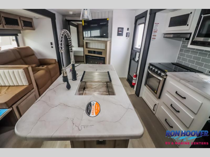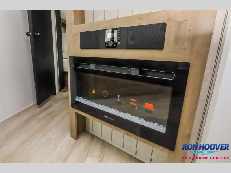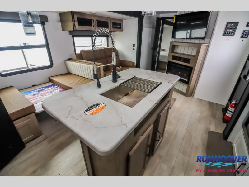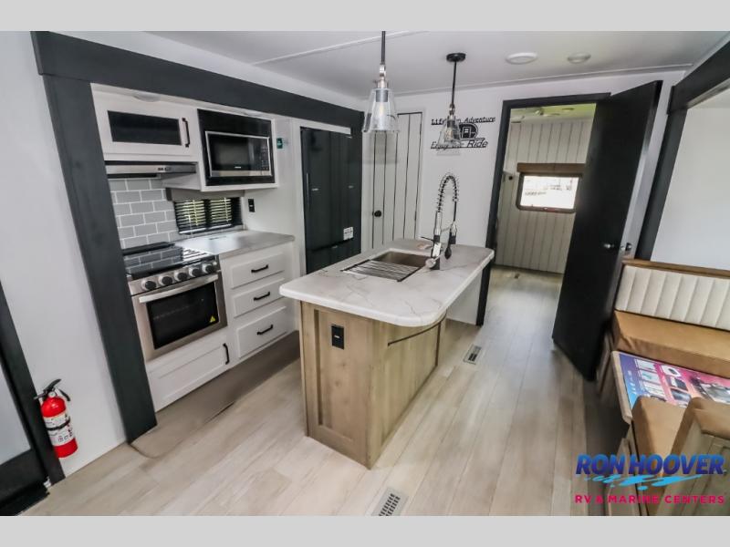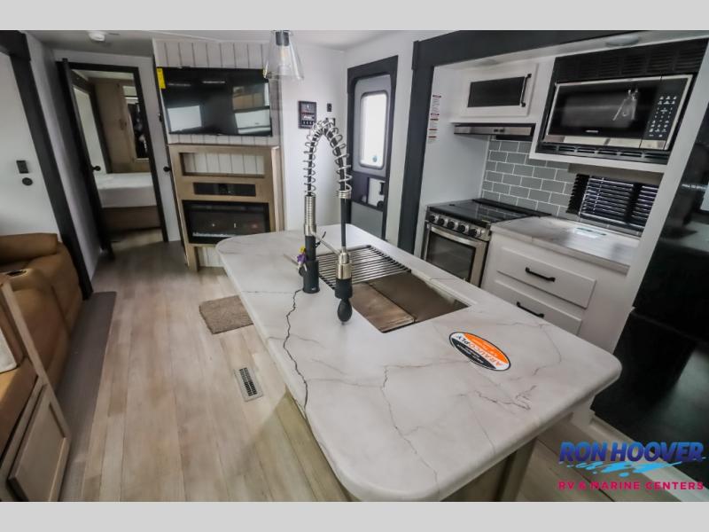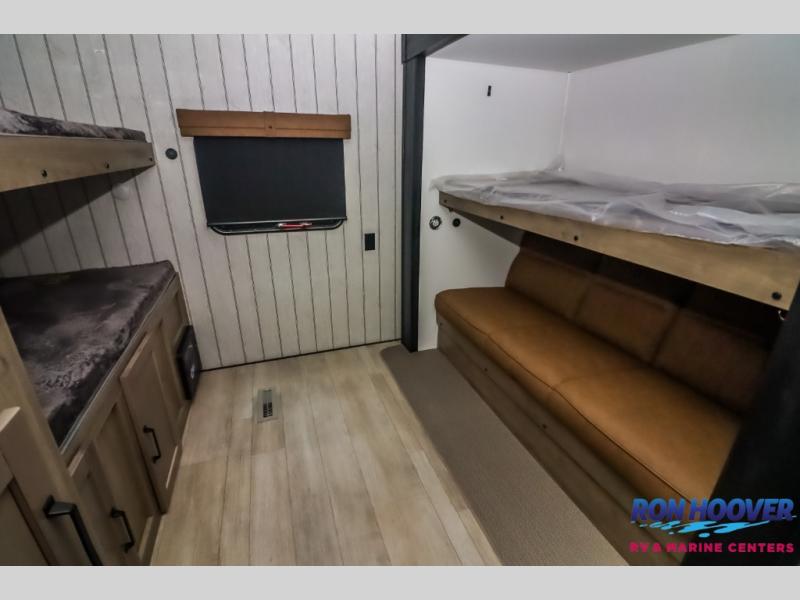 With dual entry doors and a bath and a half, you will have the ultimate in convenience with this travel trailer! The bedroom also has a front closet to keep your clothes looking their best and a queen bed slide for you to sleep your best. Everyone can freshen up in the full bathroom with the 34" x 34" radius shower and fill their bellies with scrambled eggs cooked with the stainless steel oven and range. Enjoy your meals, play games, and even sleep at the booth dinette or relax on the sofa while watching a movie with the entertainment center and fireplace. And your guests will love the rear private bunkhouse with three bunks, a jiffy sofa, and a slide out for more space! This model also includes an optional outside mini kitchen with a griddle!