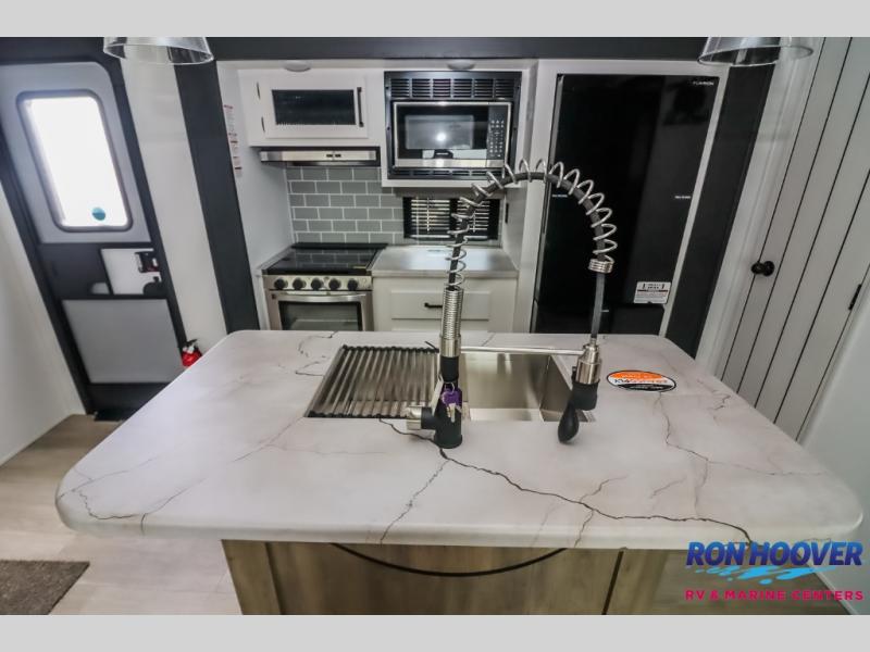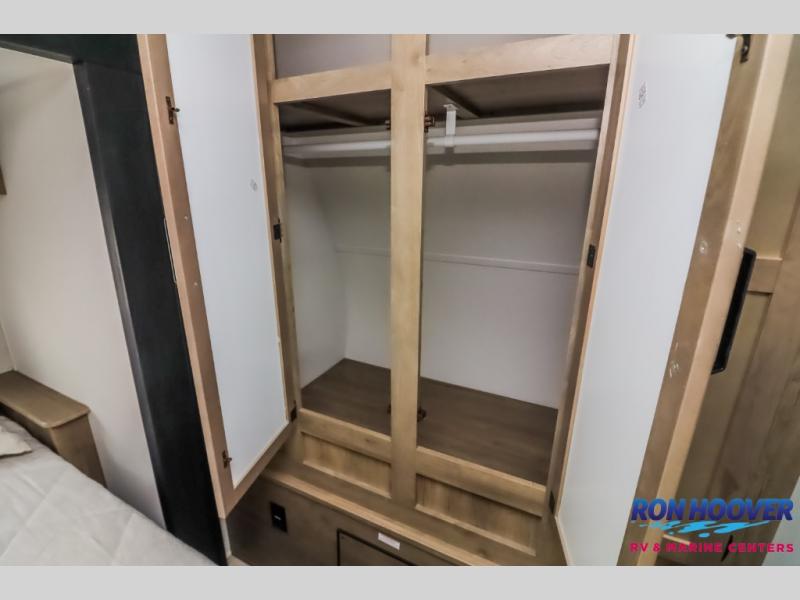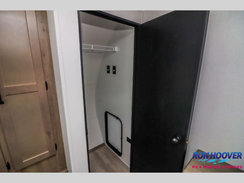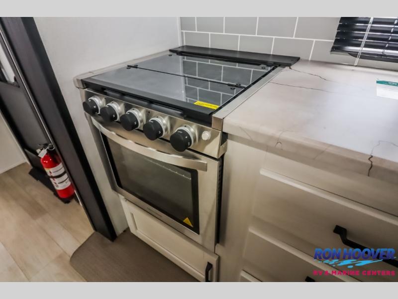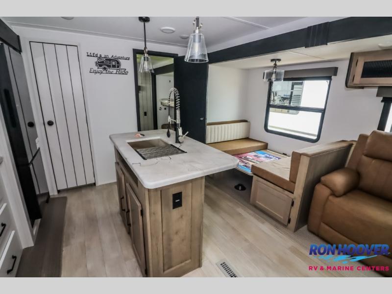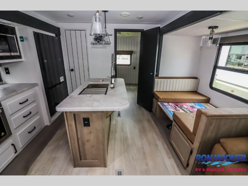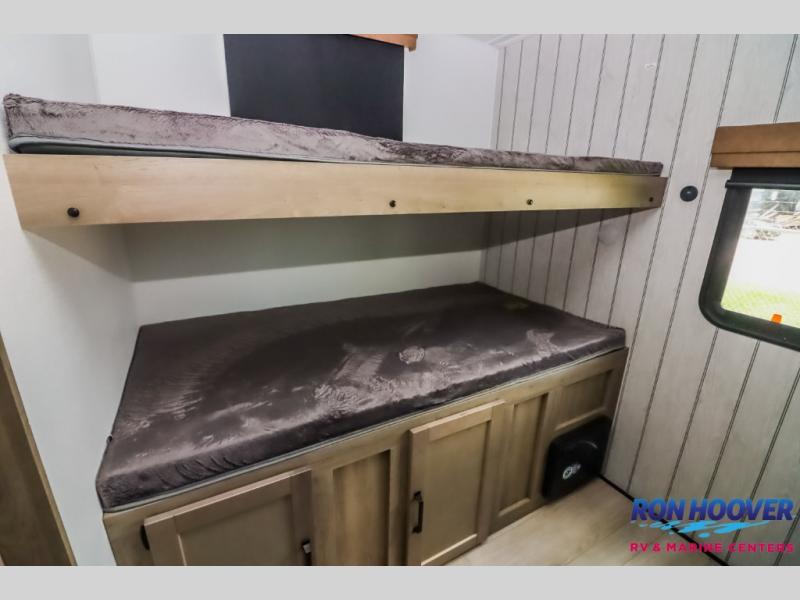 With dual entry doors and a bath and a half, you will have the ultimate in convenience with this travel trailer! The bedroom also has a front closet to keep your clothes looking their best and a queen bed slide for you to sleep your best. Everyone can freshen up in the full bathroom with the 34" x 34" radius shower and fill their bellies with scrambled eggs cooked with the stainless steel oven and range. Enjoy your meals, play games, and even sleep at the booth dinette or relax on the sofa while watching a movie with the entertainment center and fireplace. And your guests will love the rear private bunkhouse with three bunks, a jiffy sofa, and a slide out for more space! This model also includes an optional outside mini kitchen with a griddle!