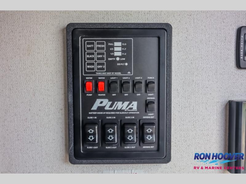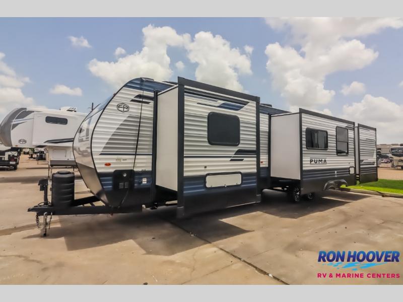 If you're looking for family-fun adventures then you need one of these Palomino Puma fifth wheels or travel trailers! They are built rugged, easy to tow, and jam packed with features. The Darco wrapped underbelly will protect your units vitals and the AlphaPly roofing membrane covers it. They also have new aluminum wheels and a powder coated steel I-beam frame. Inside, the Congoleum linoleum will be easy to keep clean, and the night roller shades will provide privacy when it's time to turn in. You'll also enjoy an electric awning with an LED light strip plus an AM/FM/Bluetooth stereo and two outside speakers to keep the party going!