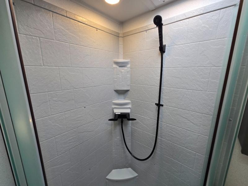 - Full bathroom near the bunkhouse with a walk-in shower, vanity, and toilet.