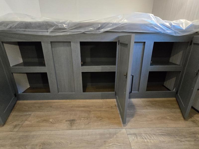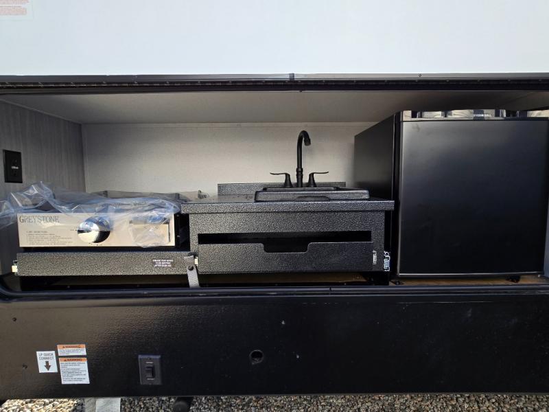 - Includes a mini fridge, griddle, and sink for outdoor cooking and dining.