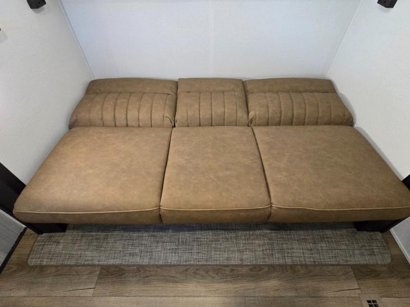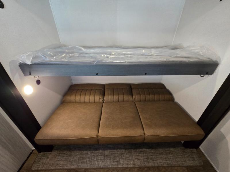 - Rear private bunkhouse with three sleeping spaces, including bunks and a cube sofa that converts to a bed.