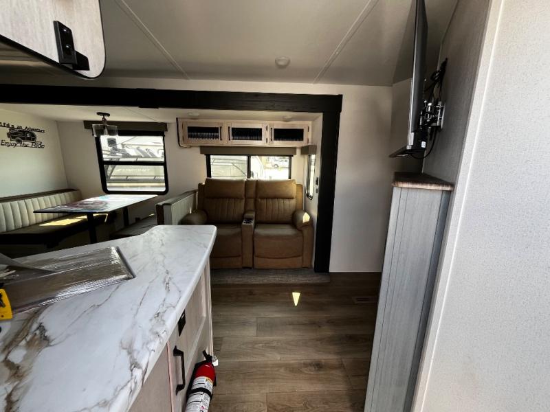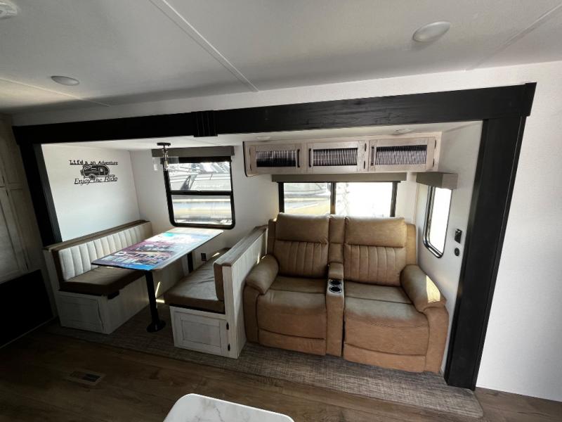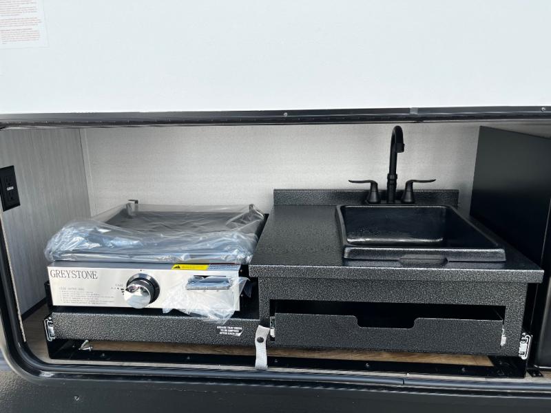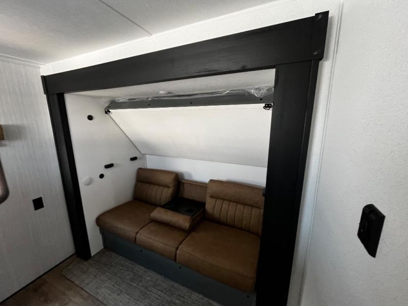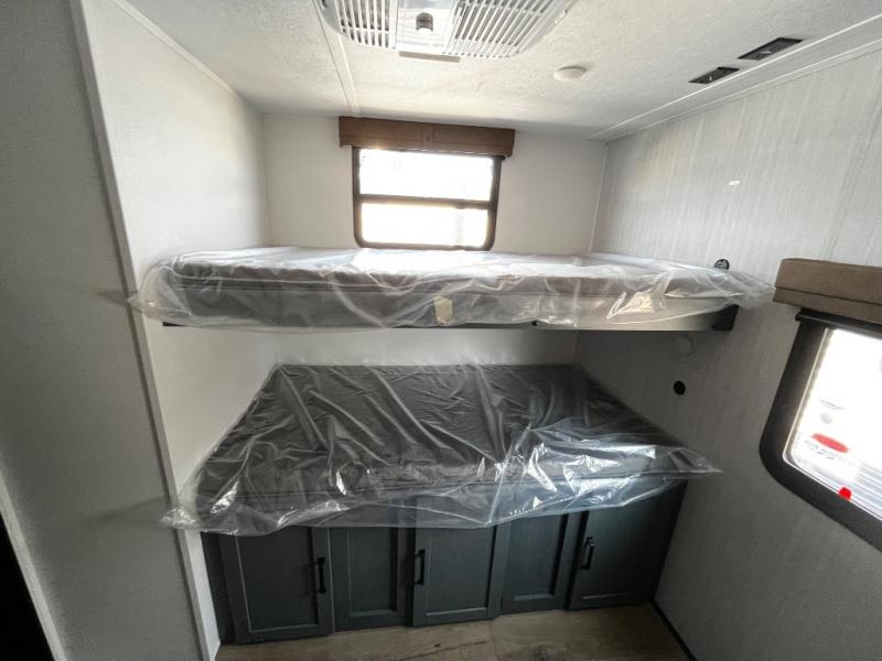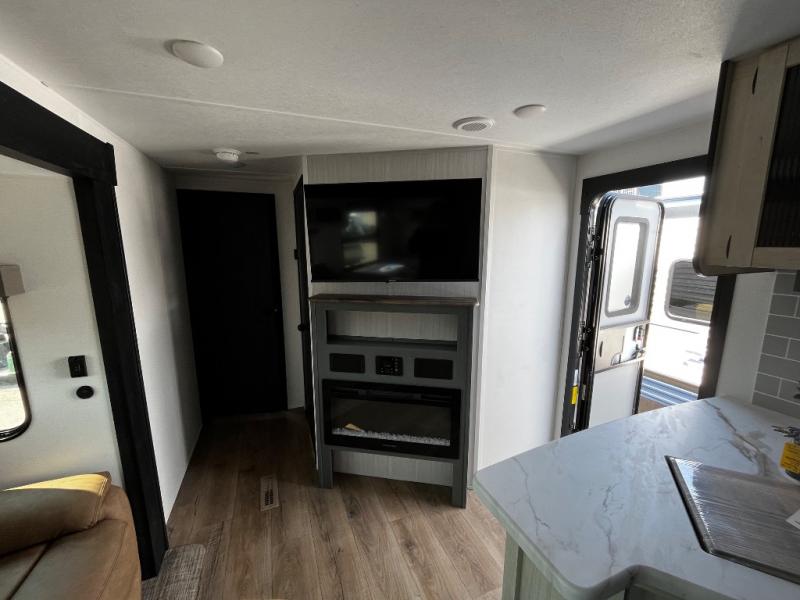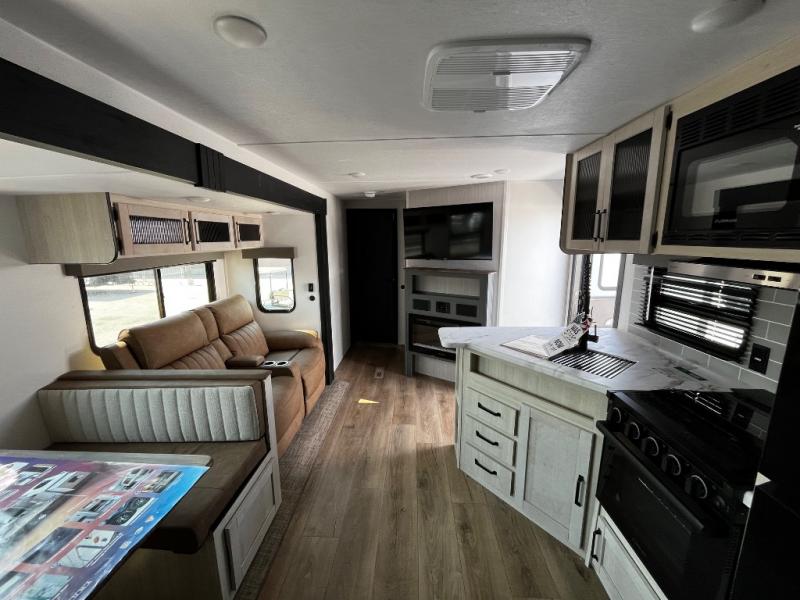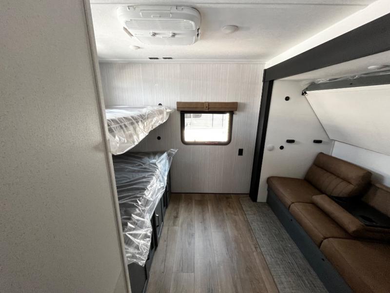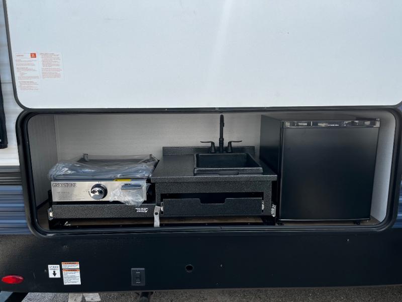 With dual entry doors and a bath and a half, you will have the ultimate in convenience with this travel trailer! The bedroom also has a front closet to keep your clothes looking their best and a queen bed slide for you to sleep your best. Everyone can freshen up in the full bathroom with the 34" x 34" radius shower and fill their bellies with scrambled eggs cooked with the stainless steel oven and range. Enjoy your meals, play games, and even sleep at the booth dinette or relax on the sofa while watching a movie with the entertainment center and fireplace. And your guests will love the rear private bunkhouse with three bunks, a jiffy sofa, and a slide out for more space! This model also includes an optional outside mini kitchen with a griddle!