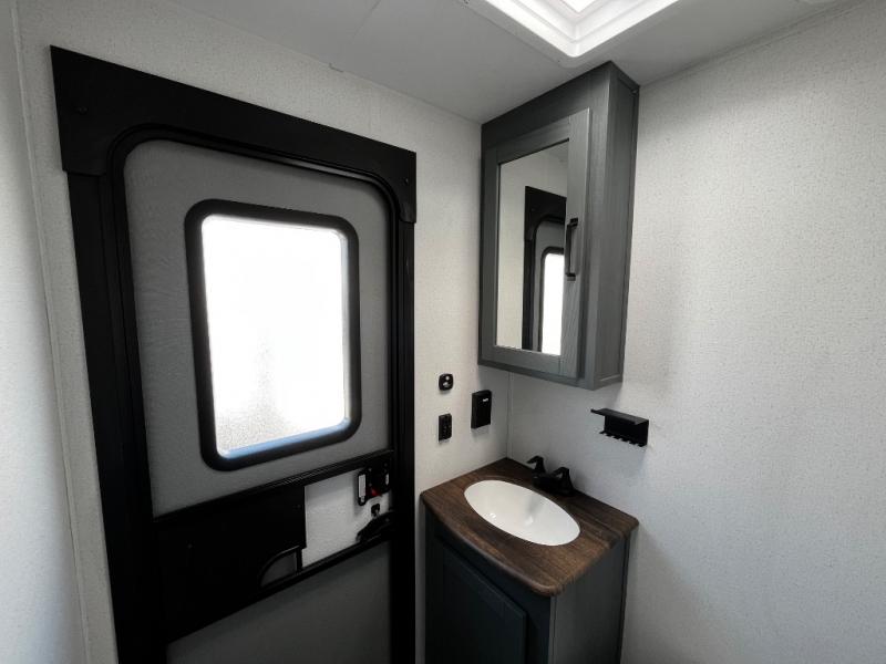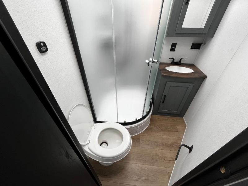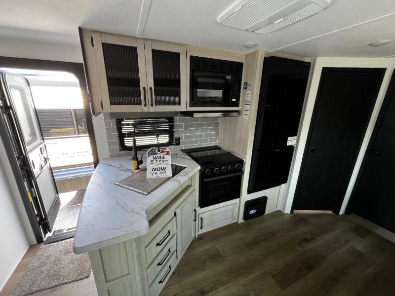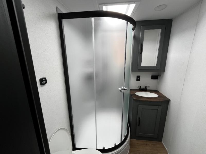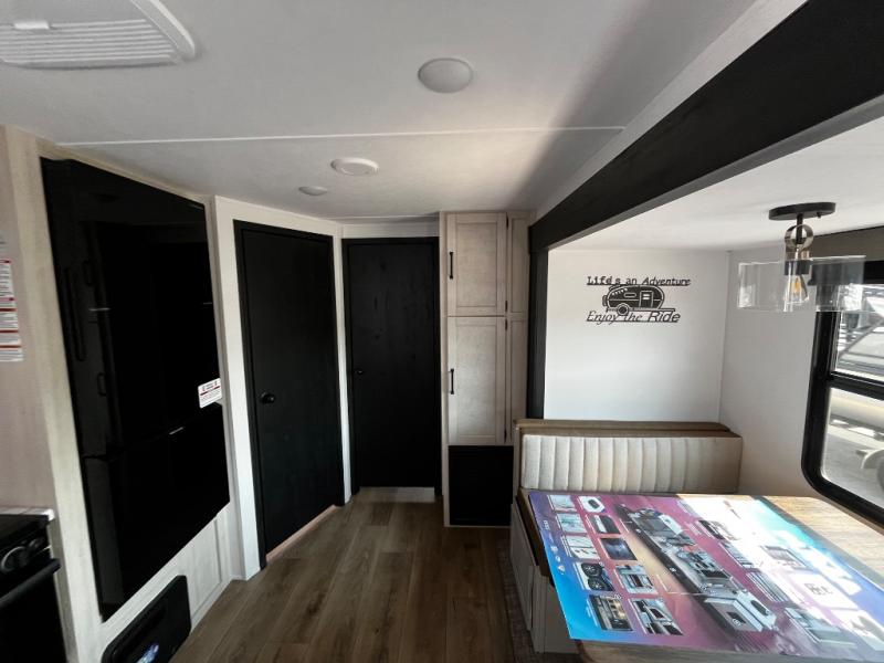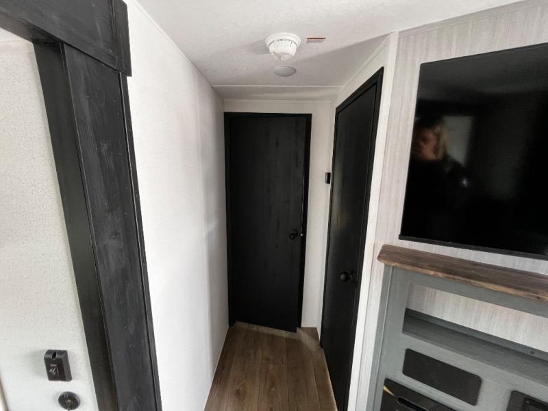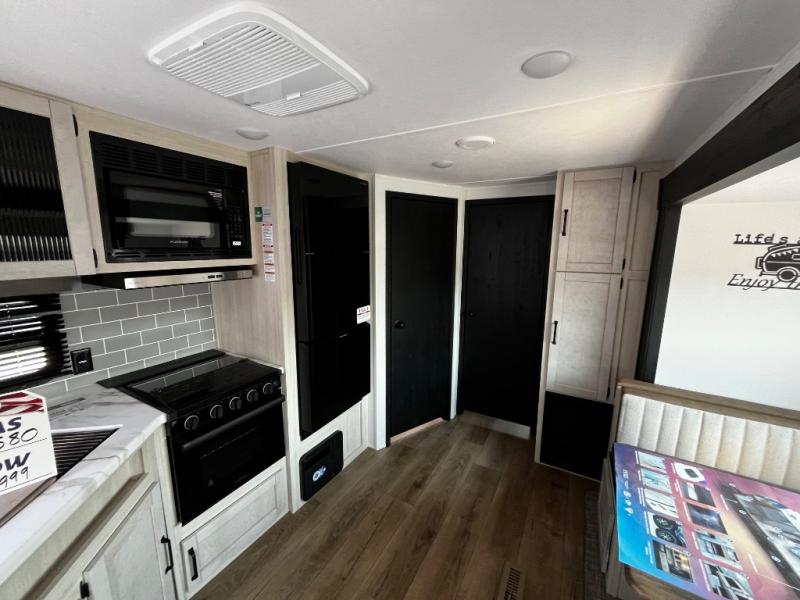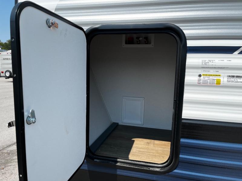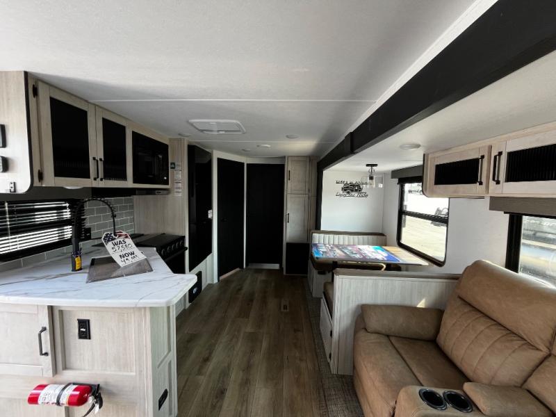 With dual entry doors and a bath and a half, you will have the ultimate in convenience with this travel trailer! The bedroom also has a front closet to keep your clothes looking their best and a queen bed slide for you to sleep your best. Everyone can freshen up in the full bathroom with the 34" x 34" radius shower and fill their bellies with scrambled eggs cooked with the stainless steel oven and range. Enjoy your meals, play games, and even sleep at the booth dinette or relax on the sofa while watching a movie with the entertainment center and fireplace. And your guests will love the rear private bunkhouse with three bunks, a jiffy sofa, and a slide out for more space! This model also includes an optional outside mini kitchen with a griddle!