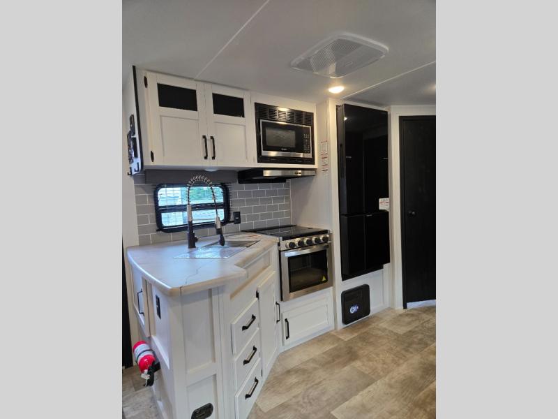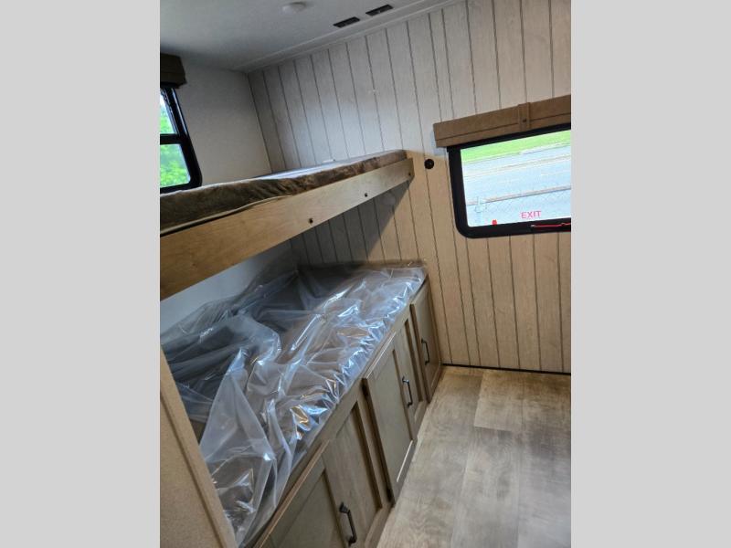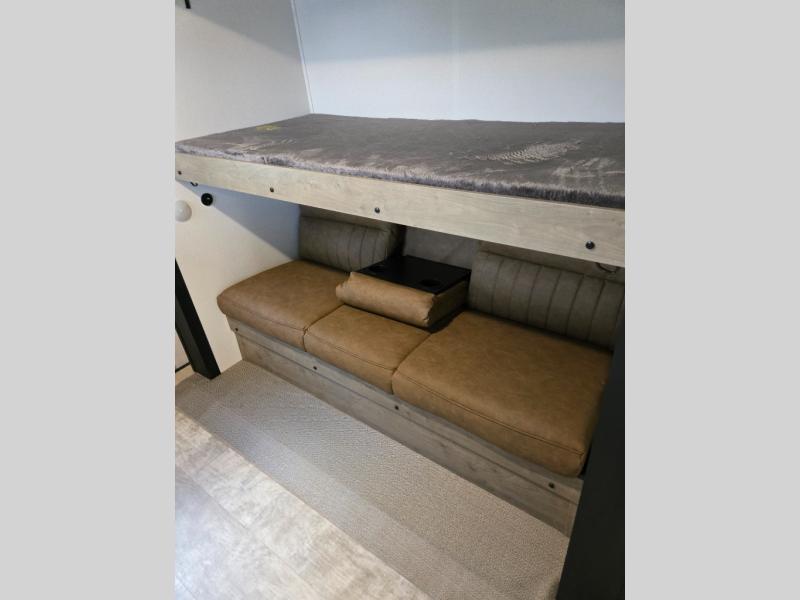 With dual entry doors and a bath and a half, you will have the ultimate in convenience with this travel trailer! The bedroom also has a front closet to keep your clothes looking their best and a queen bed slide for you to sleep your best. Everyone can freshen up in the full bathroom with the 34" x 34" radius shower and fill their bellies with scrambled eggs cooked with the stainless steel oven and range. Enjoy your meals, play games, and even sleep at the booth dinette or relax on the sofa while watching a movie with the entertainment center and fireplace. And your guests will love the rear private bunkhouse with three bunks, a jiffy sofa, and a slide out for more space! This model also includes an optional outside mini kitchen with a griddle!