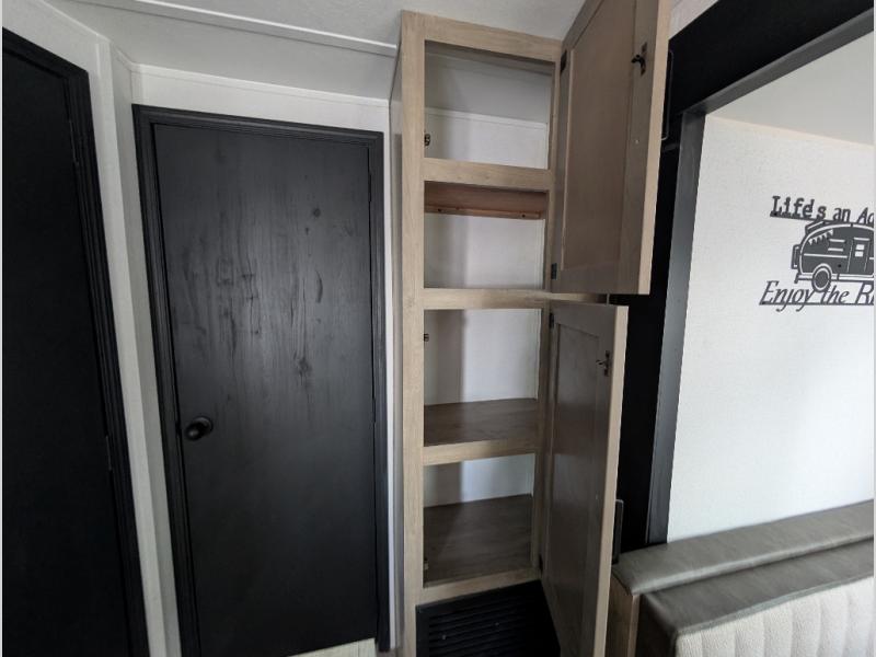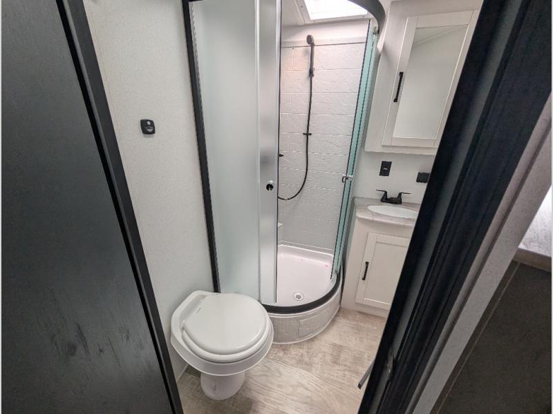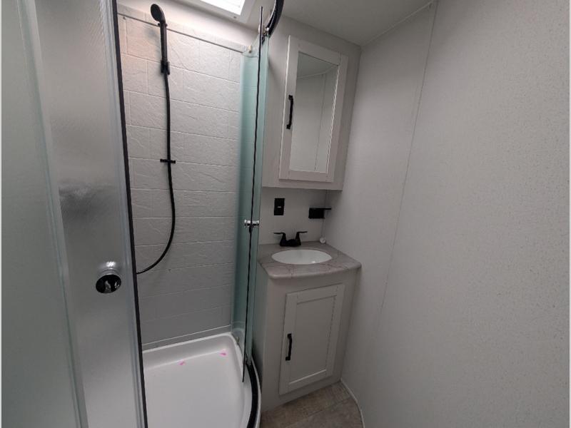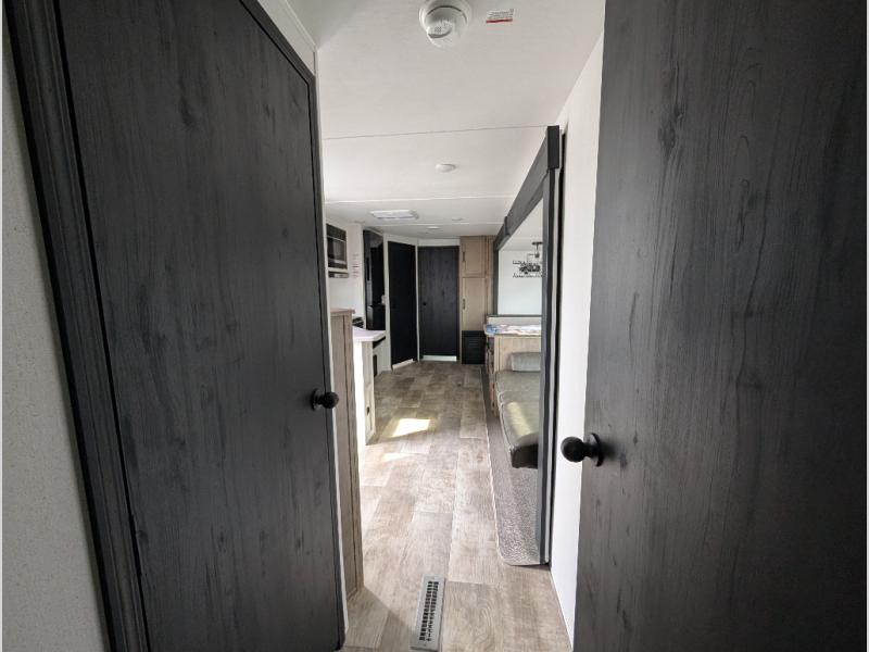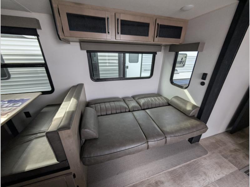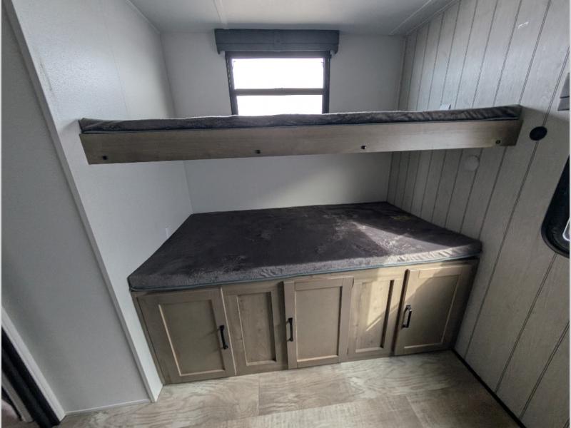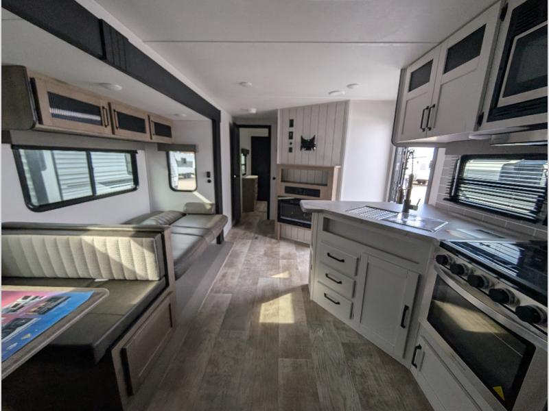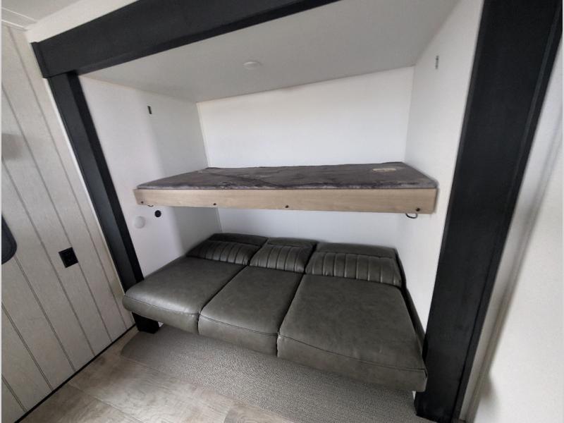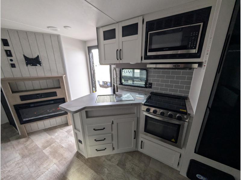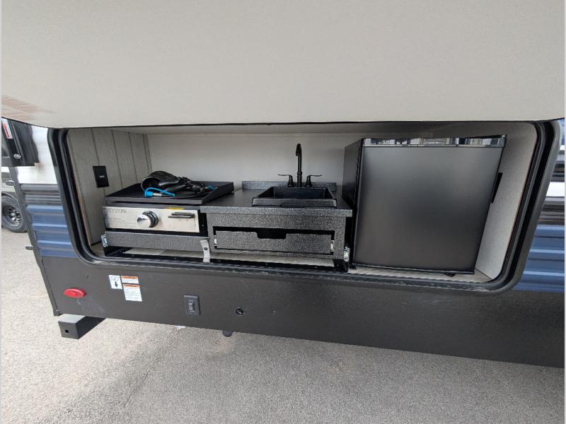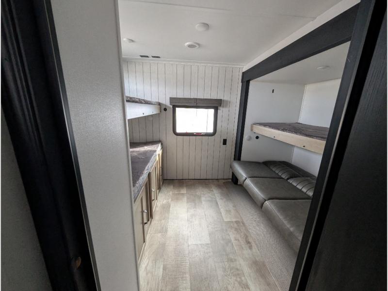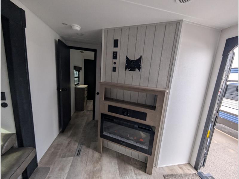 With dual entry doors and a bath and a half, you will have the ultimate in convenience with this travel trailer! The bedroom also has a front closet to keep your clothes looking their best and a queen bed slide for you to sleep your best. Everyone can freshen up in the full bathroom with the 34" x 34" radius shower and fill their bellies with scrambled eggs cooked with the stainless steel oven and range. Enjoy your meals, play games, and even sleep at the booth dinette or relax on the sofa while watching a movie with the entertainment center and fireplace. And your guests will love the rear private bunkhouse with three bunks, a jiffy sofa, and a slide out for more space! This model also includes an optional outside mini kitchen with a griddle!