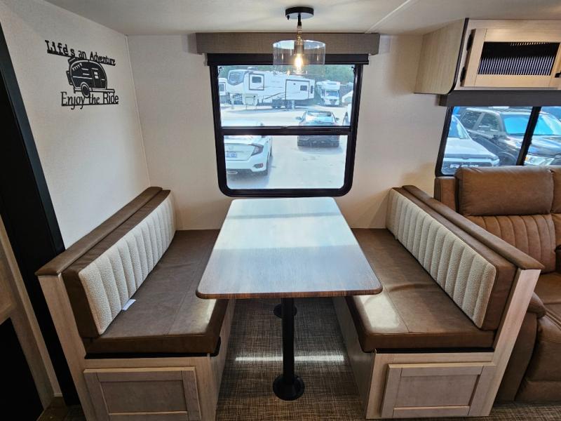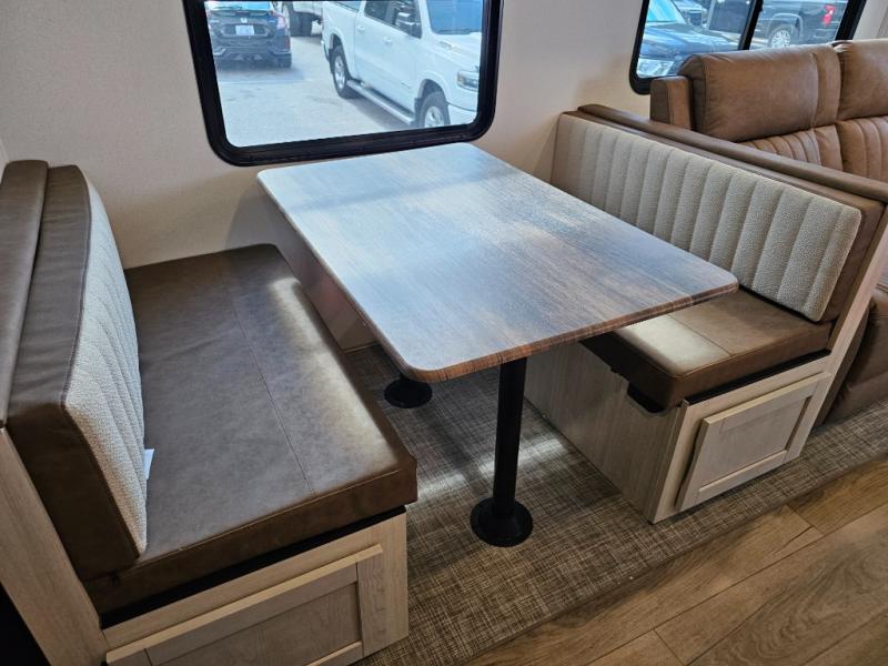Booth dinette and theater seating provide additional space for lounging or overnight guests