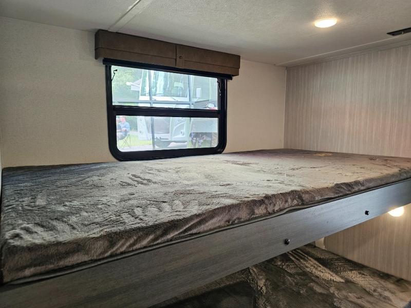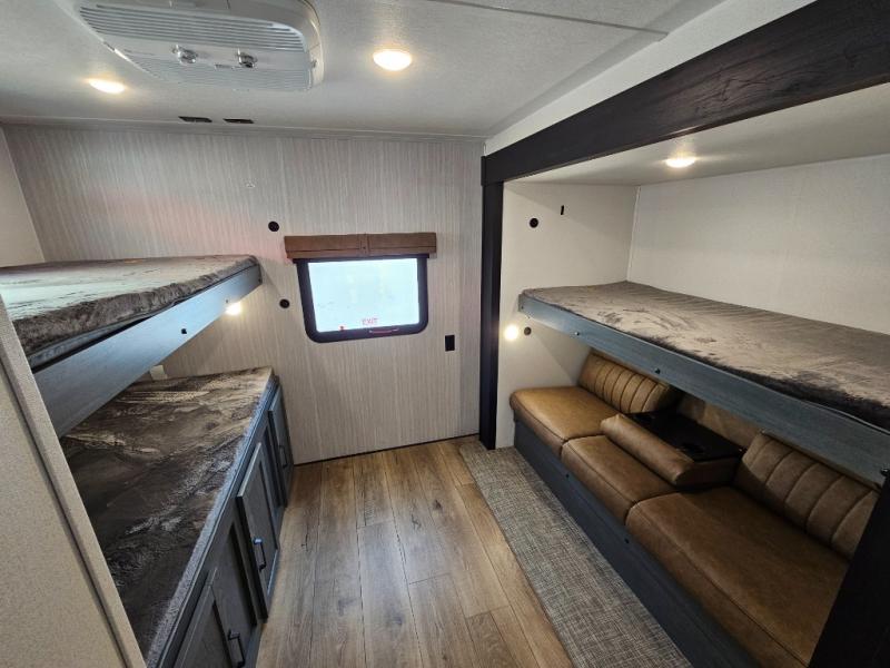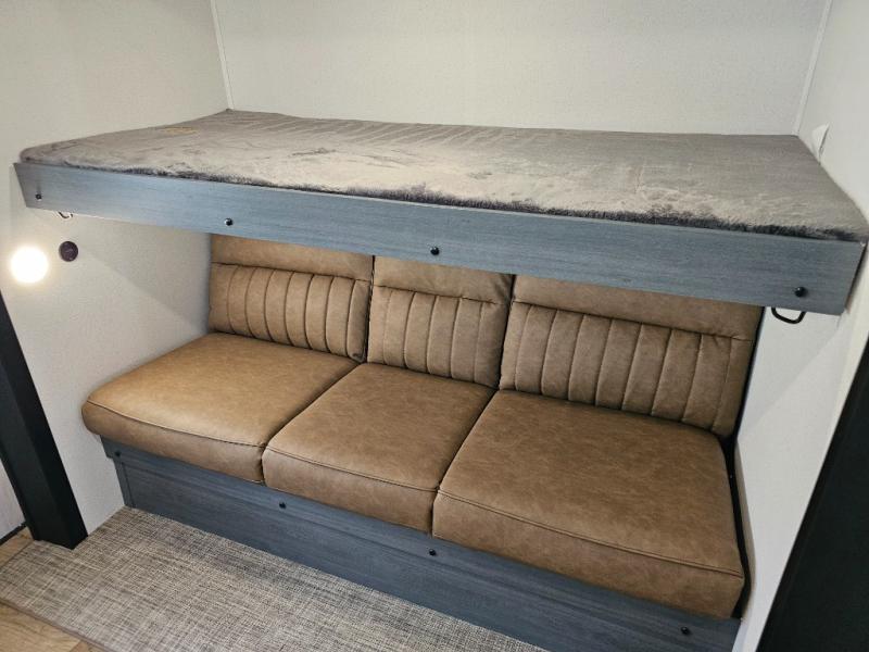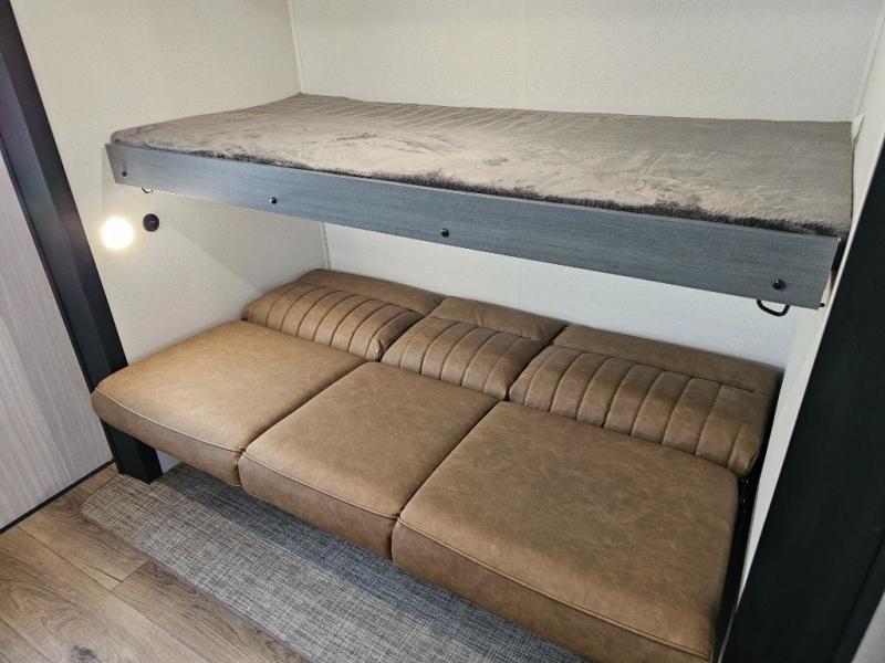 Rear private bunkhouse with three bunks, a jiffy sofa, and slide-out space