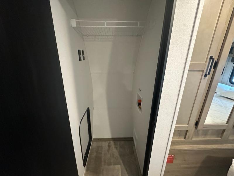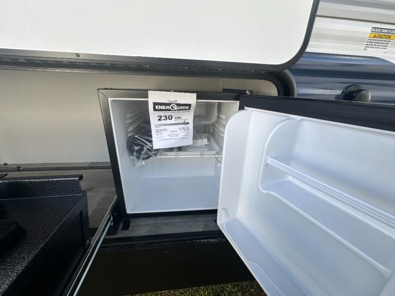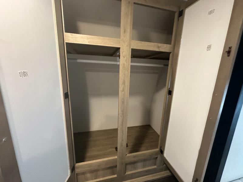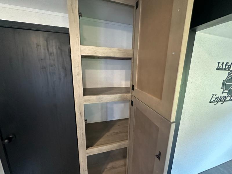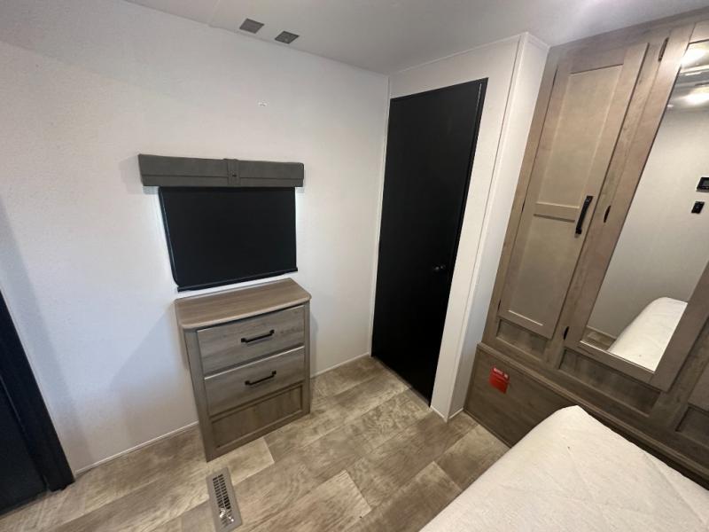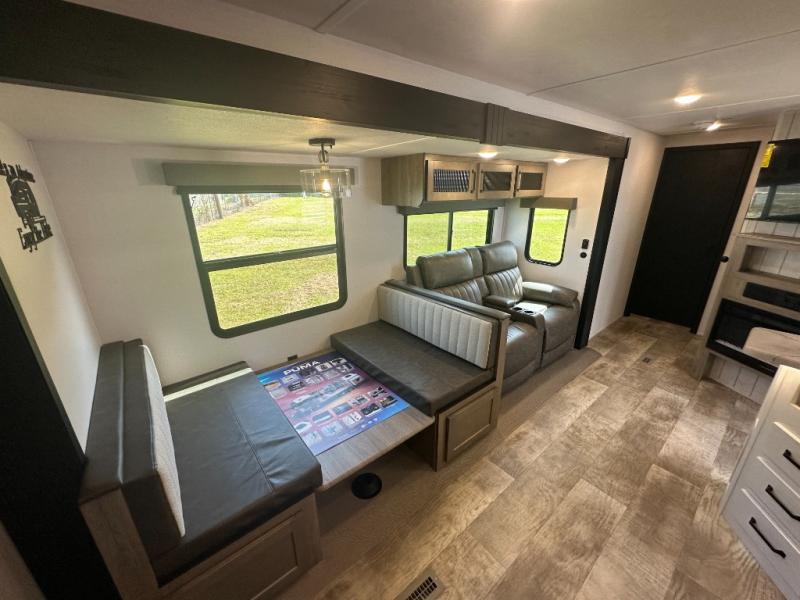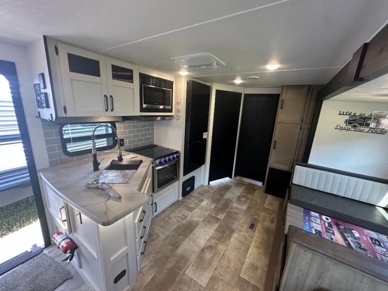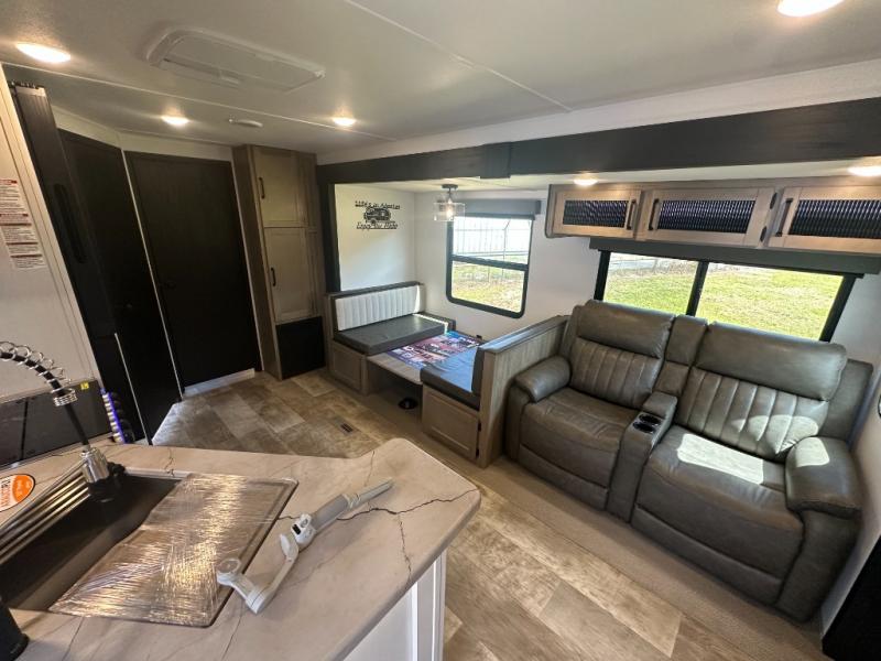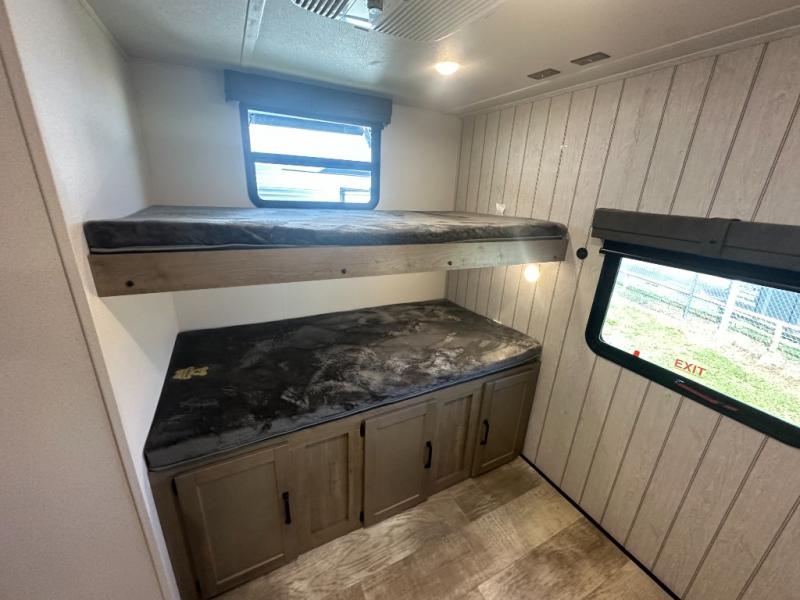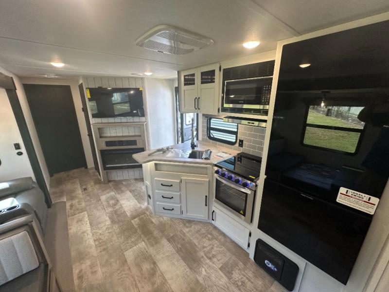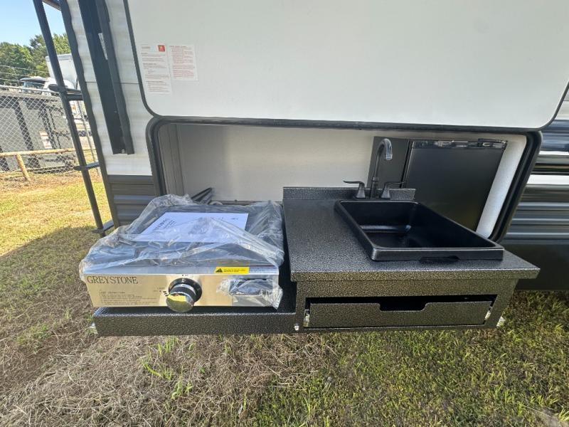 With dual entry doors and a bath and a half, you will have the ultimate in convenience with this travel trailer! The bedroom also has a front closet to keep your clothes looking their best and a queen bed slide for you to sleep your best. Everyone can freshen up in the full bathroom with the 34" x 34" radius shower and fill their bellies with scrambled eggs cooked with the stainless steel oven and range. Enjoy your meals, play games, and even sleep at the booth dinette or relax on the sofa while watching a movie with the entertainment center and fireplace. And your guests will love the rear private bunkhouse with three bunks, a jiffy sofa, and a slide out for more space! This model also includes an optional outside mini kitchen with a griddle!