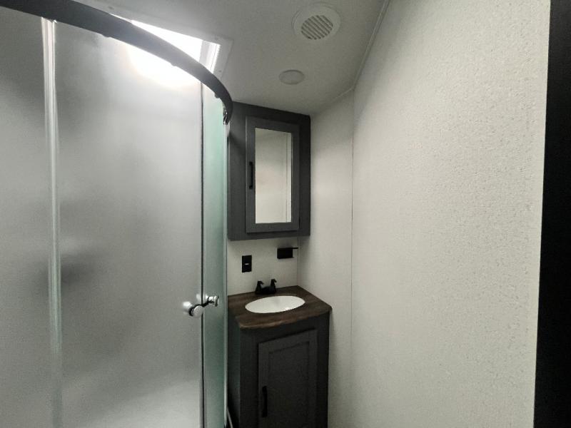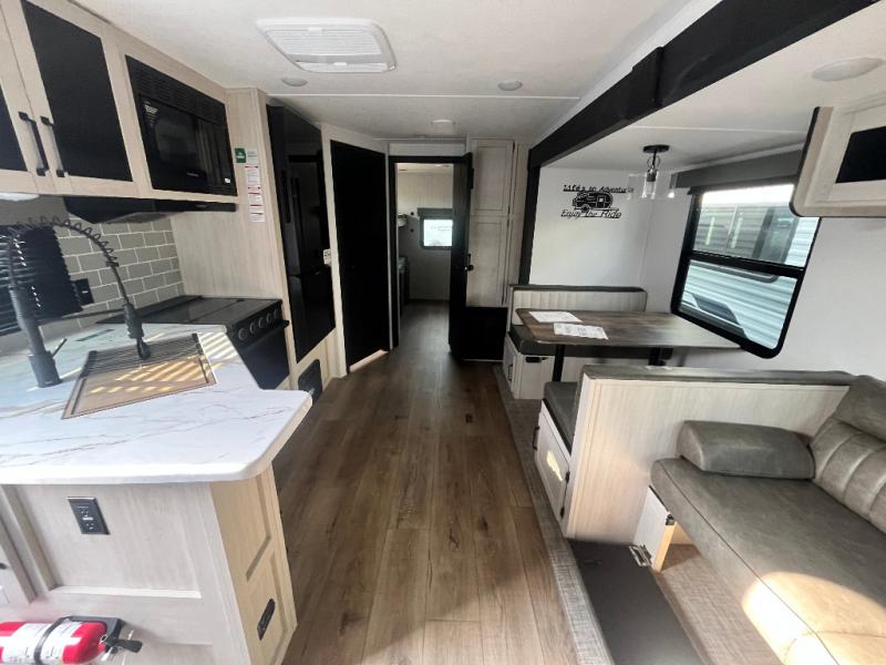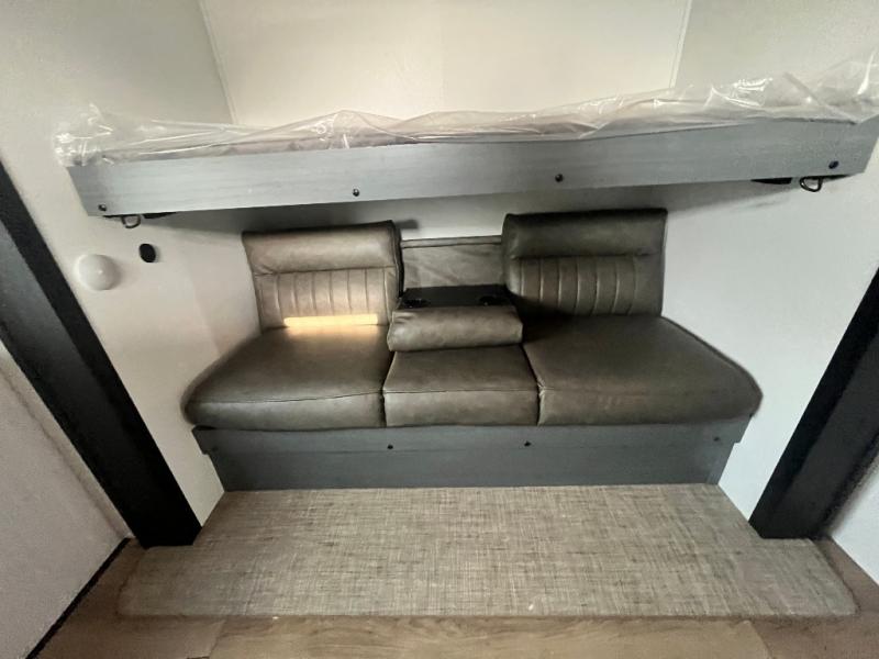 With dual entry doors and a bath and a half, you will have the ultimate in convenience with this travel trailer! The bedroom also has a front closet to keep your clothes looking their best and a queen bed slide for you to sleep your best. Everyone can freshen up in the full bathroom with the 34" x 34" radius shower and fill their bellies with scrambled eggs cooked with the stainless steel oven and range. Enjoy your meals, play games, and even sleep at the booth dinette or relax on the sofa while watching a movie with the entertainment center and fireplace. And your guests will love the rear private bunkhouse with three bunks, a jiffy sofa, and a slide out for more space! This model also includes an optional outside mini kitchen with a griddle!