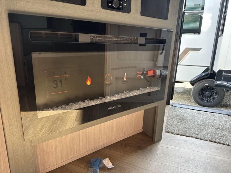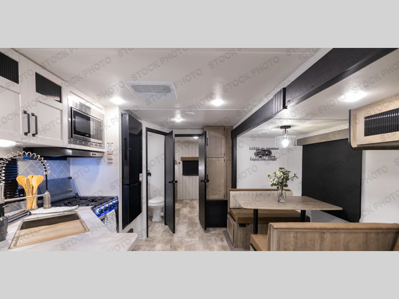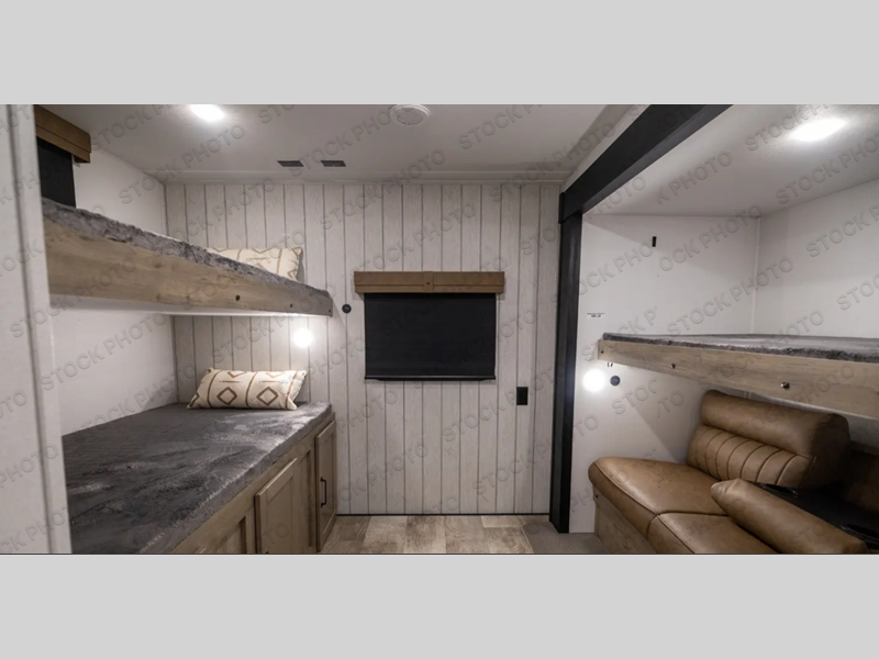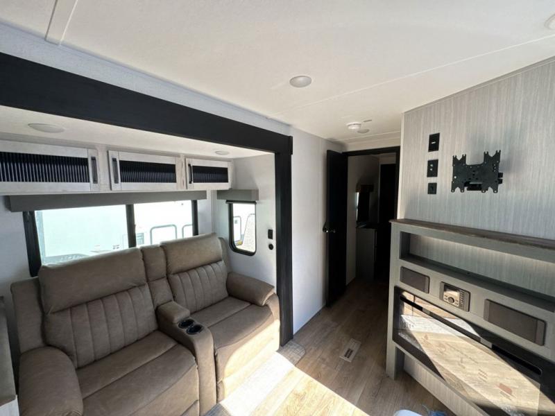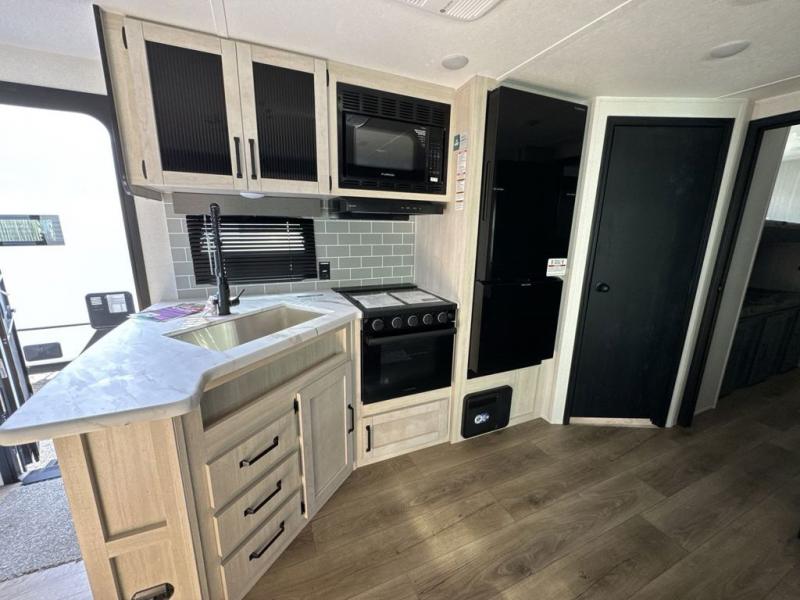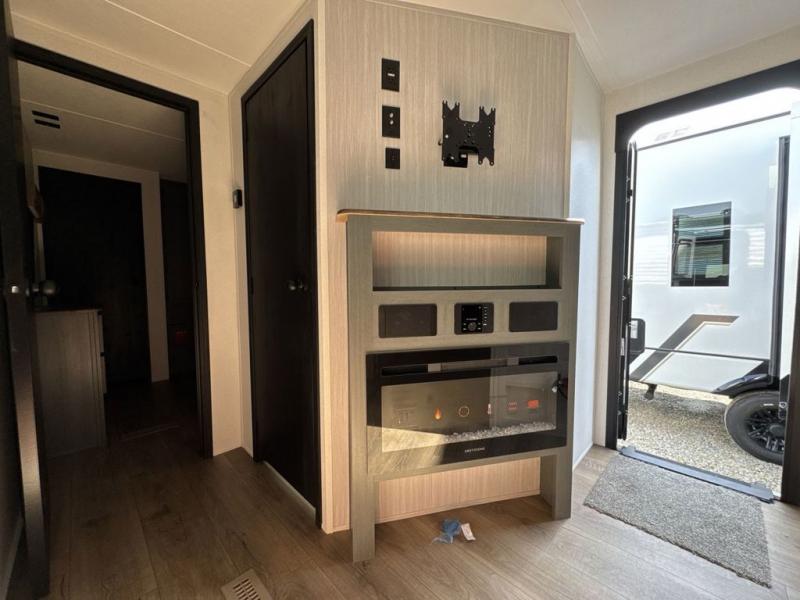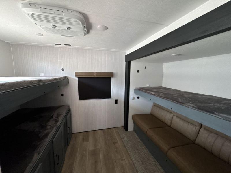 With dual entry doors and a bath and a half, you will have the ultimate in convenience with this travel trailer! The bedroom also has a front closet to keep your clothes looking their best and a queen bed slide for you to sleep your best. Everyone can freshen up in the full bathroom with the 34" x 34" radius shower and fill their bellies with scrambled eggs cooked with the stainless steel oven and range. Enjoy your meals, play games, and even sleep at the booth dinette or relax on the sofa while watching a movie with the entertainment center and fireplace. And your guests will love the rear private bunkhouse with three bunks, a jiffy sofa, and a slide out for more space! This model also includes an optional outside mini kitchen with a griddle!