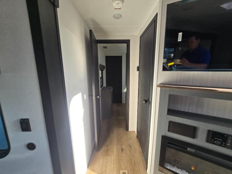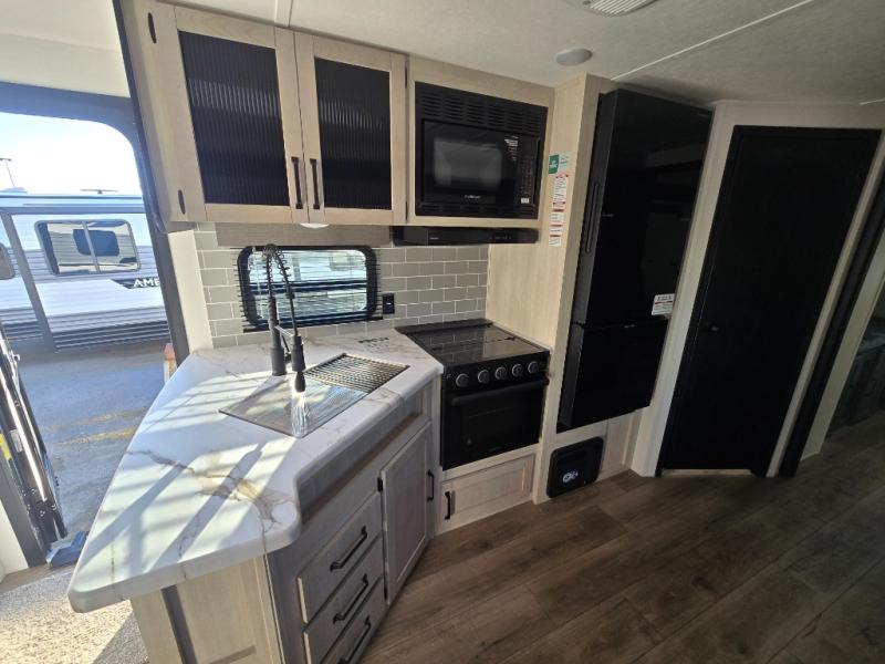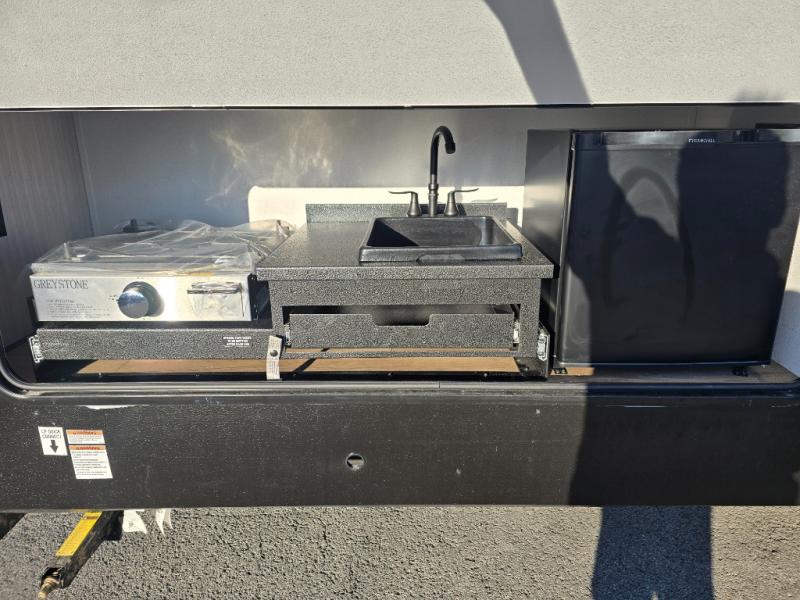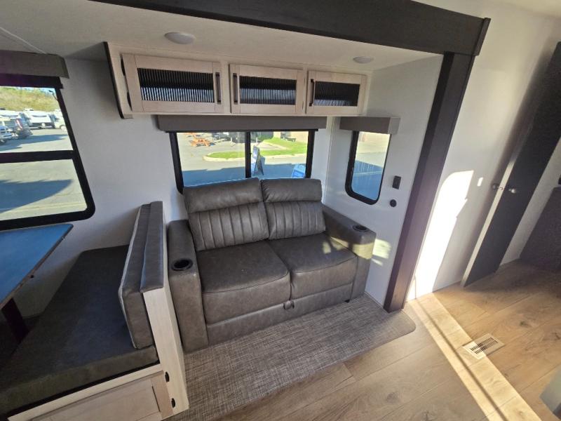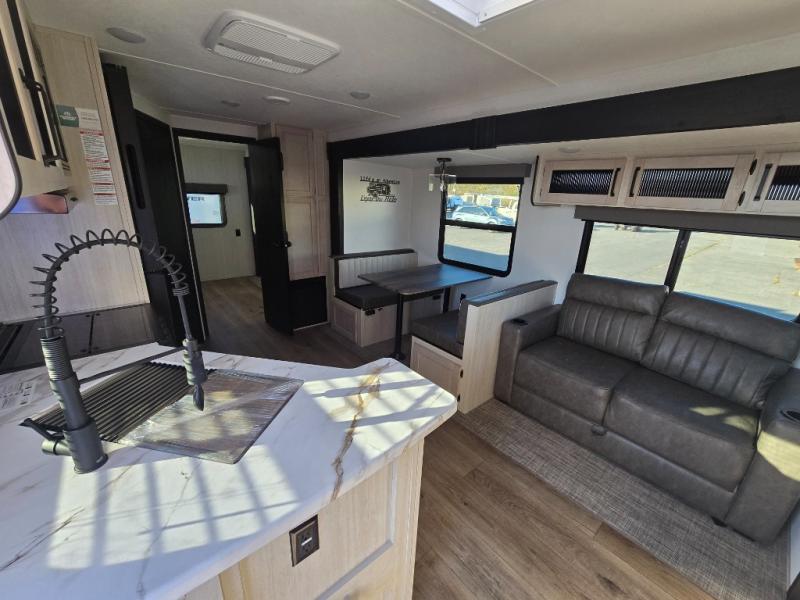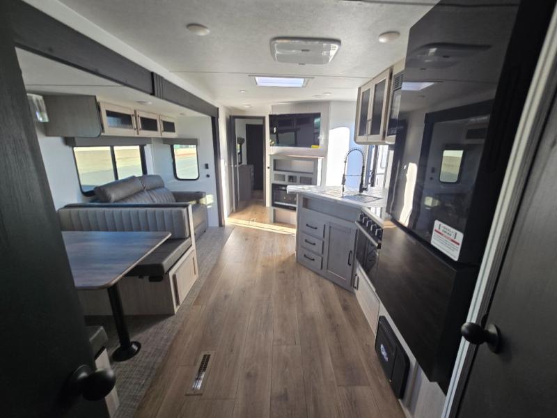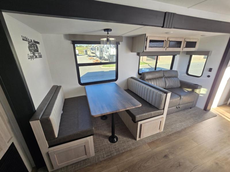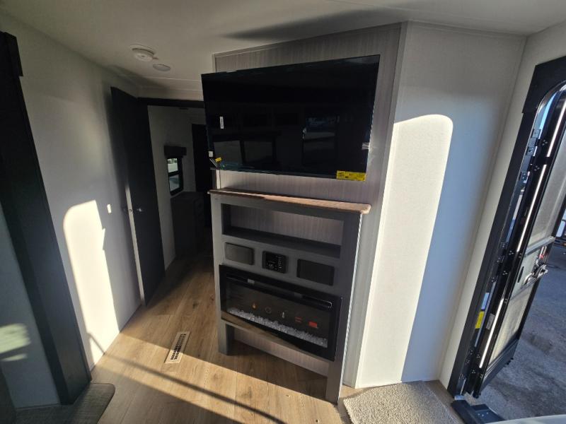 With dual entry doors and a bath and a half, you will have the ultimate in convenience with this travel trailer! The bedroom also has a front closet to keep your clothes looking their best and a queen bed slide for you to sleep your best. Everyone can freshen up in the full bathroom with the 34" x 34" radius shower and fill their bellies with scrambled eggs cooked with the stainless steel oven and range. Enjoy your meals, play games, and even sleep at the booth dinette or relax on the sofa while watching a movie with the entertainment center and fireplace. And your guests will love the rear private bunkhouse with three bunks, a jiffy sofa, and a slide out for more space! This model also includes an optional outside mini kitchen with a griddle!