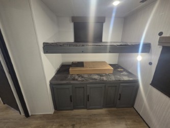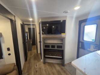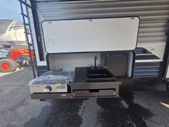 With dual entry doors and a bath and a half, you will have the ultimate in convenience with this travel trailer! The bedroom also has a front closet to keep your clothes looking their best and a queen bed slide for you to sleep your best. Everyone can freshen up in the full bathroom with the 34" x 34" radius shower and fill their bellies with scrambled eggs cooked with the stainless steel oven and range. Enjoy your meals, play games, and even sleep at the booth dinette or relax on the sofa while watching a movie with the entertainment center and fireplace. And your guests will love the rear private bunkhouse with three bunks, a jiffy sofa, and a slide out for more space! This model also includes an optional outside mini kitchen with a griddle!