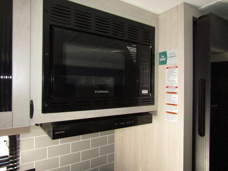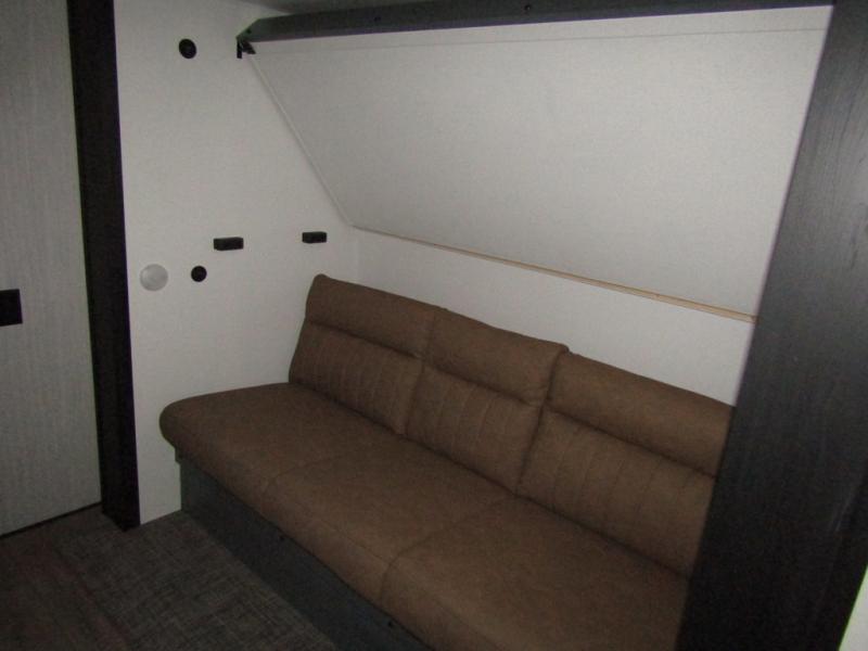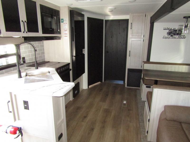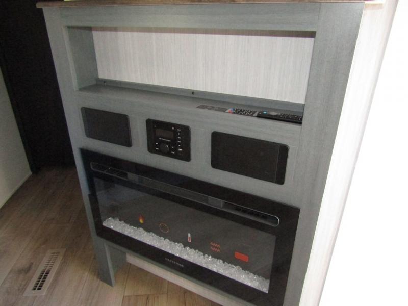 With dual entry doors and a bath and a half, you will have the ultimate in convenience with this travel trailer! The bedroom also has a front closet to keep your clothes looking their best and a queen bed slide for you to sleep your best. Everyone can freshen up in the full bathroom with the 34" x 34" radius shower and fill their bellies with scrambled eggs cooked with the stainless steel oven and range. Enjoy your meals, play games, and even sleep at the booth dinette or relax on the sofa while watching a movie with the entertainment center and fireplace. And your guests will love the rear private bunkhouse with three bunks, a jiffy sofa, and a slide out for more space! This model also includes an optional outside mini kitchen with a griddle!