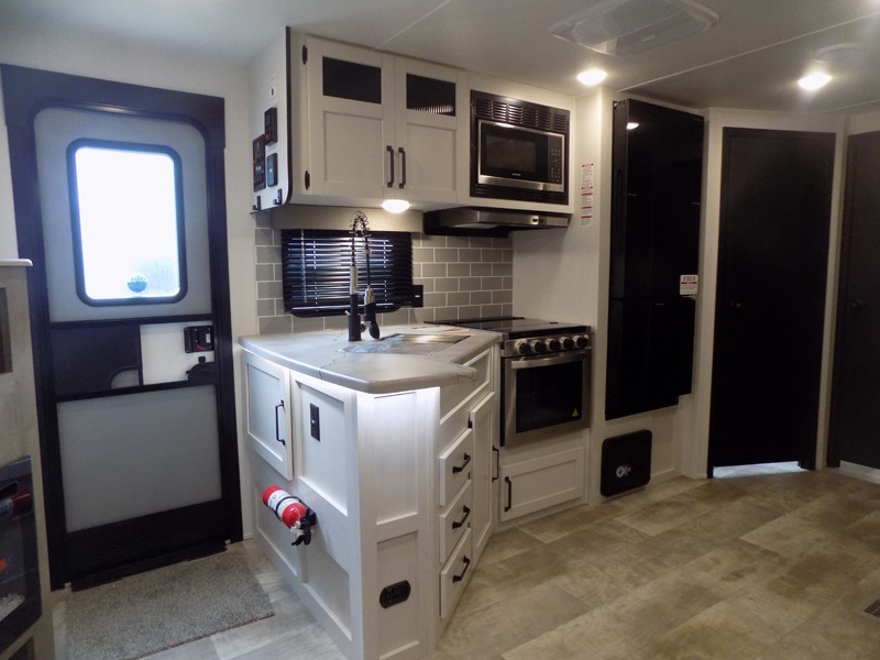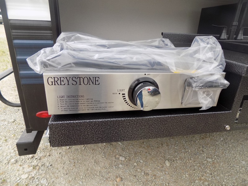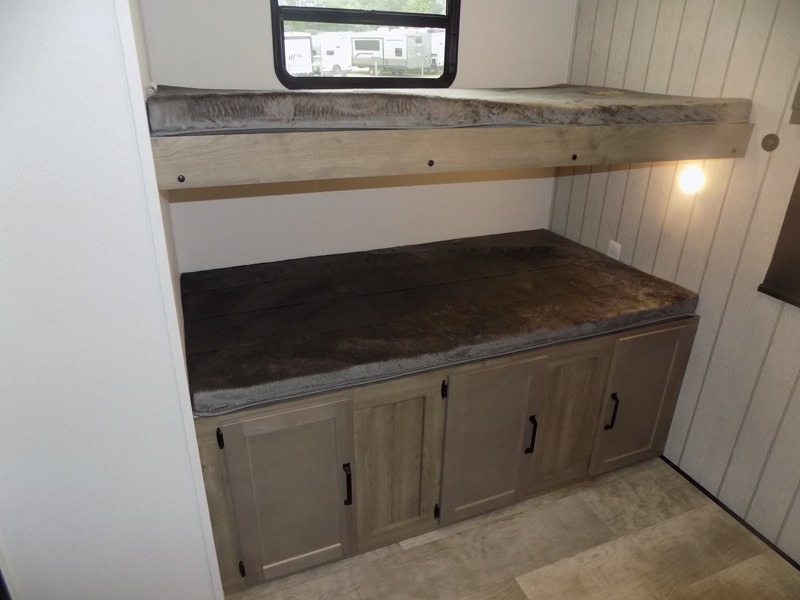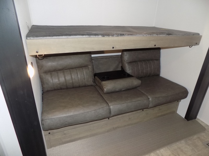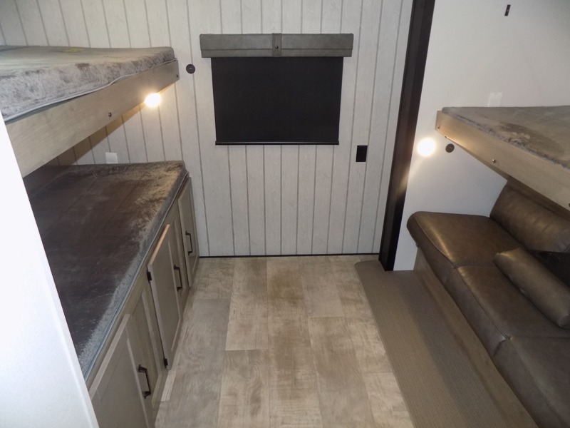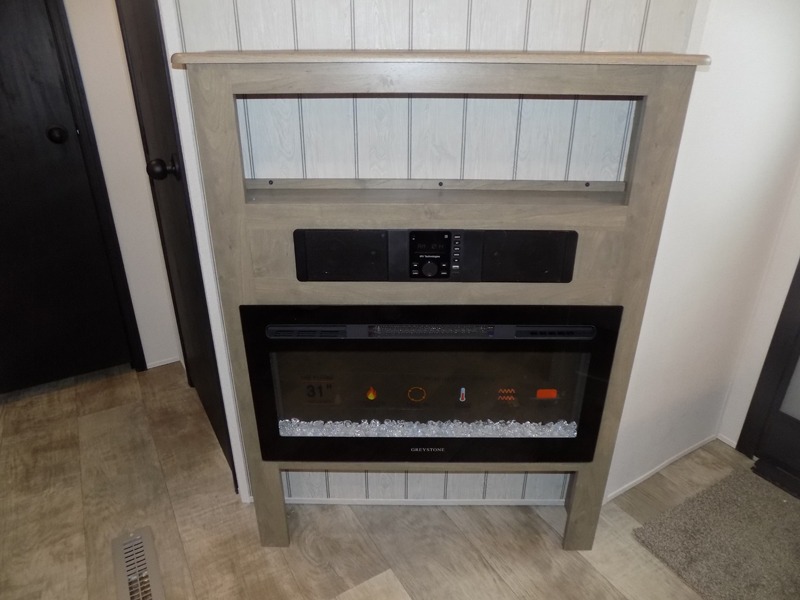 With dual entry doors and a bath and a half, you will have the ultimate in convenience with this travel trailer! The bedroom also has a front closet to keep your clothes looking their best and a queen bed slide for you to sleep your best. Everyone can freshen up in the full bathroom with the 34" x 34" radius shower and fill their bellies with scrambled eggs cooked with the stainless steel oven and range. Enjoy your meals, play games, and even sleep at the booth dinette or relax on the sofa while watching a movie with the entertainment center and fireplace. And your guests will love the rear private bunkhouse with three bunks, a jiffy sofa, and a slide out for more space! This model also includes an optional outside mini kitchen with a griddle!