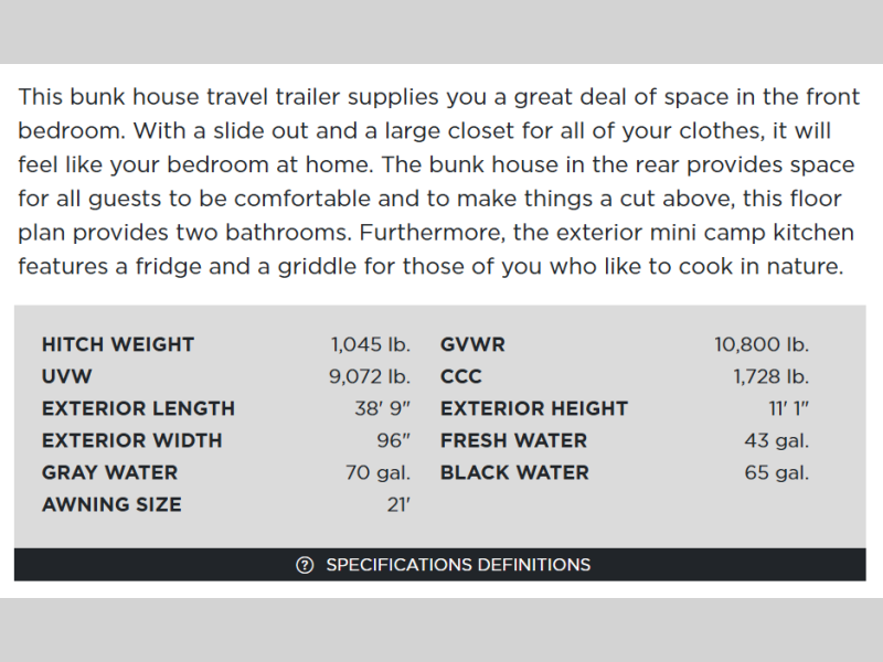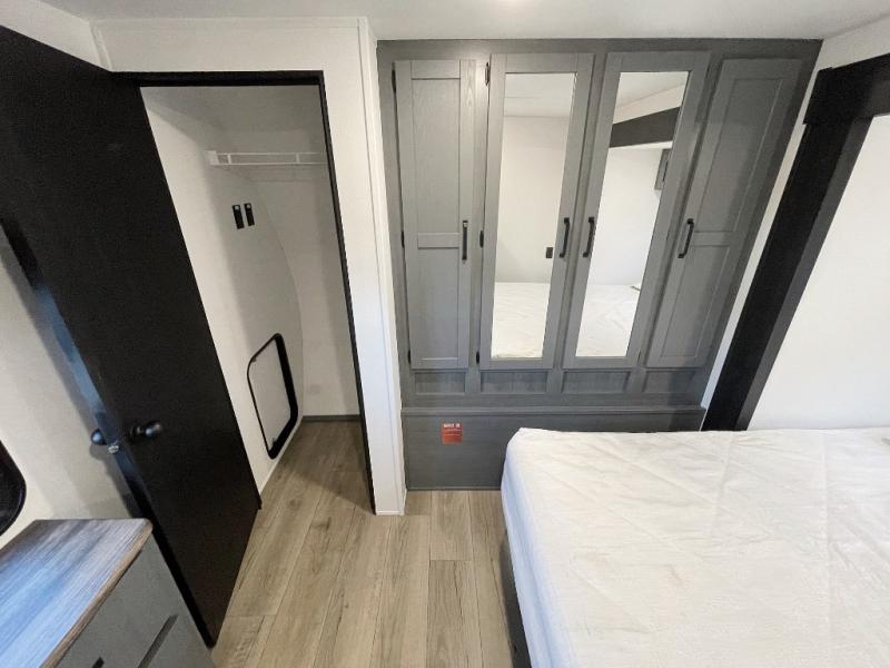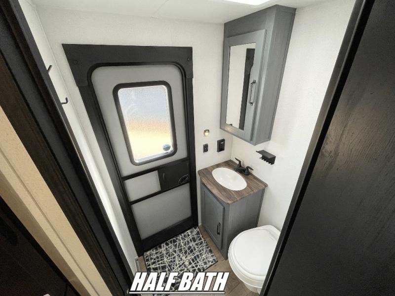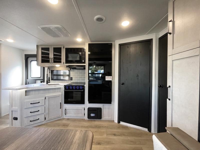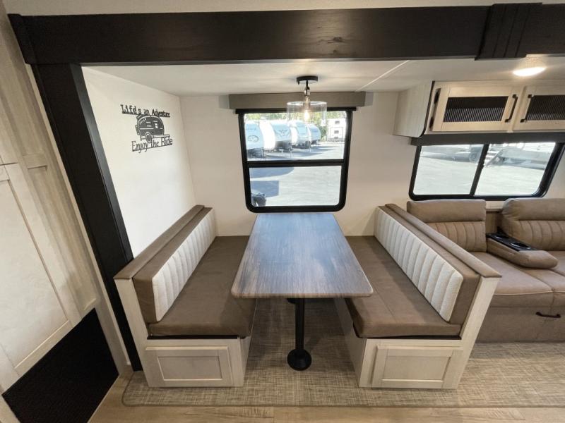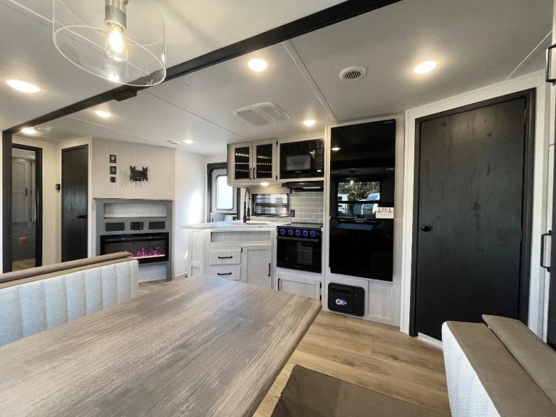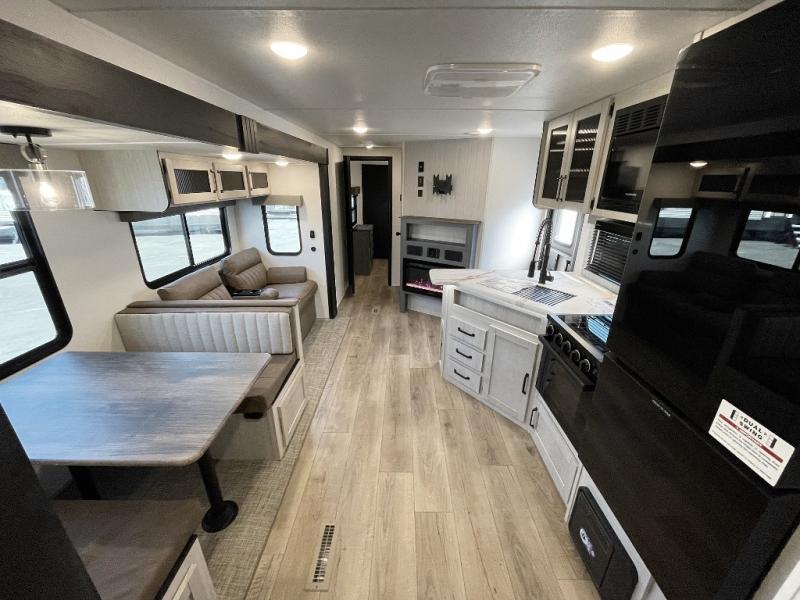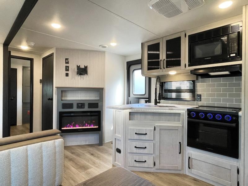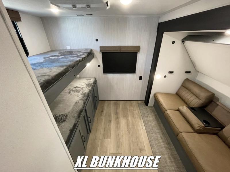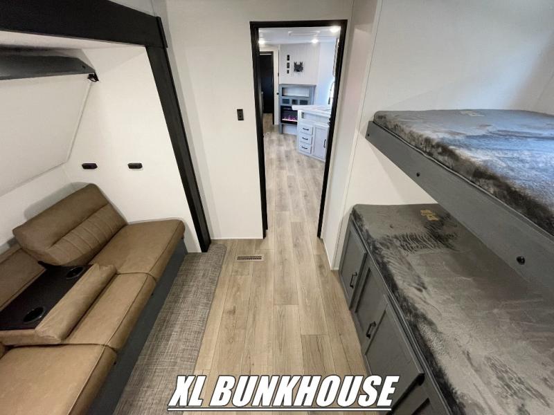 With dual entry doors and a bath and a half, you will have the ultimate in convenience with this travel trailer! The bedroom also has a front closet to keep your clothes looking their best and a queen bed slide for you to sleep your best. Everyone can freshen up in the full bathroom with the 34" x 34" radius shower and fill their bellies with scrambled eggs cooked with the stainless steel oven and range. Enjoy your meals, play games, and even sleep at the booth dinette or relax on the sofa while watching a movie with the entertainment center and fireplace. And your guests will love the rear private bunkhouse with three bunks, a jiffy sofa, and a slide out for more space! This model also includes an optional outside mini kitchen with a griddle!