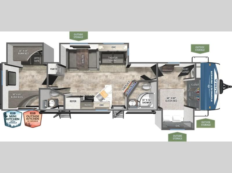 If you're looking for family-fun adventures, then you need one of these Forest River Puma travel trailers! They are built rugged, easy to tow, and jam packed with features. The Darco wrapped underbelly will help protect your unit, and the roof and side mount solar prep gives you the option to add off-grid power. Inside, the Congoleum linoleum will be easy to keep clean, and the night roller shades will provide privacy when it's time to turn in. You'll also enjoy an electric awning with an LED light strip plus an AM/FM/Bluetooth stereo and two outside speakers to keep the party going!