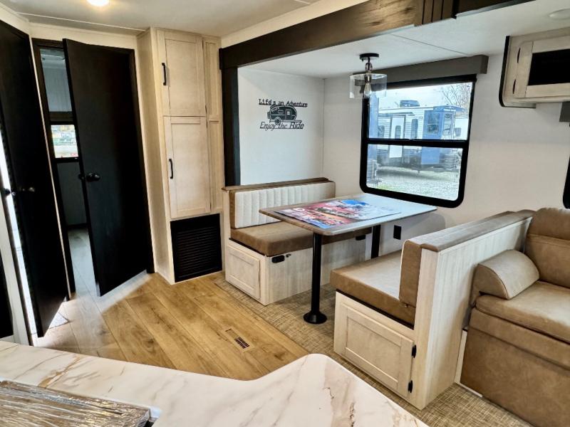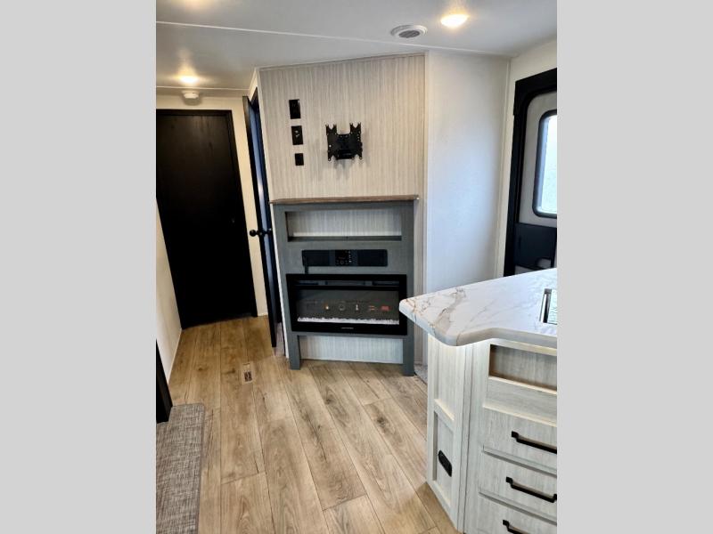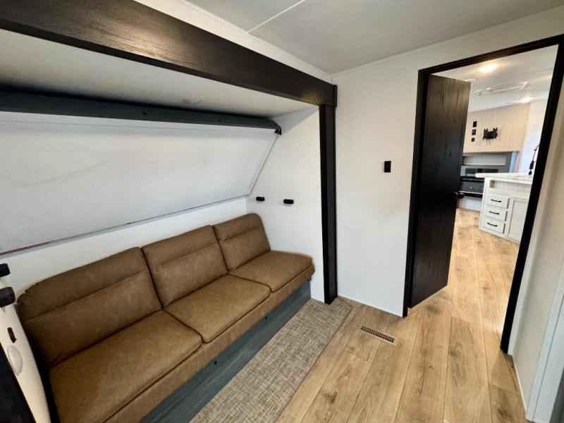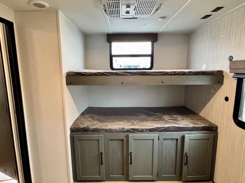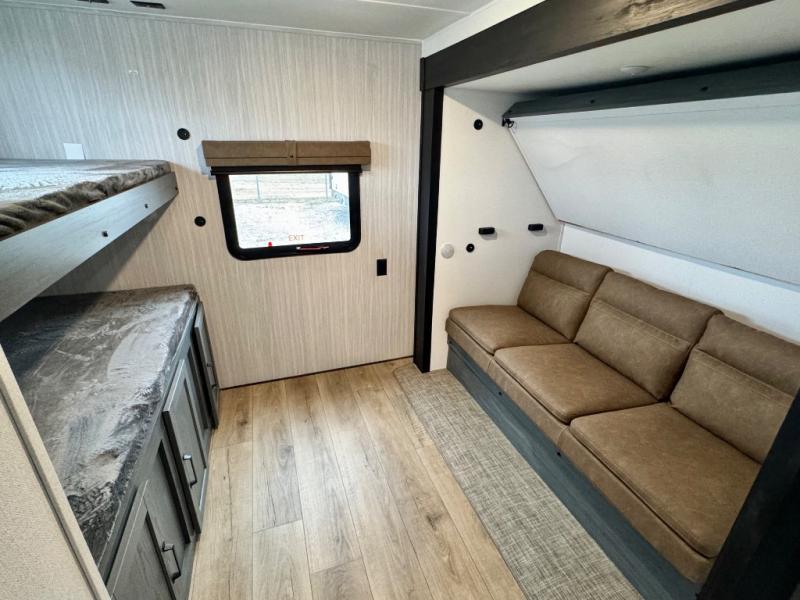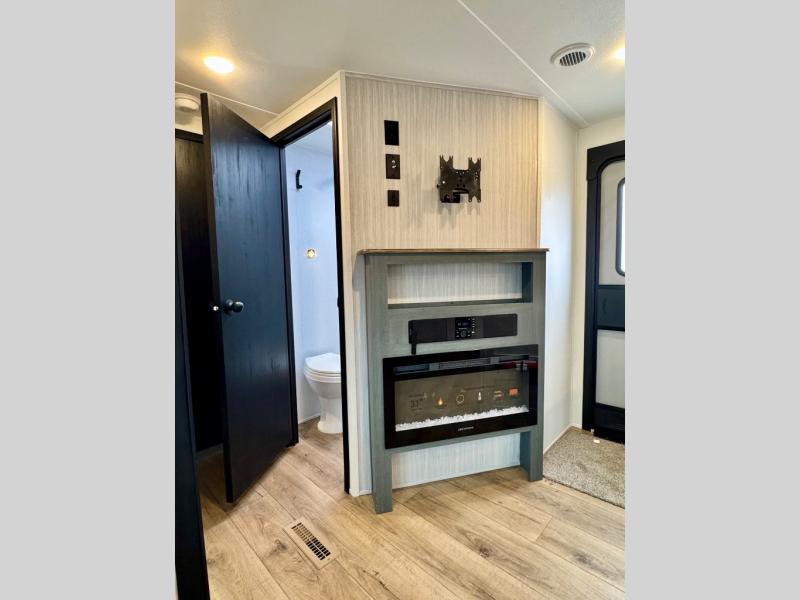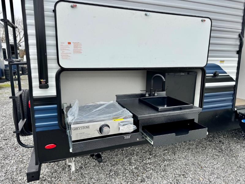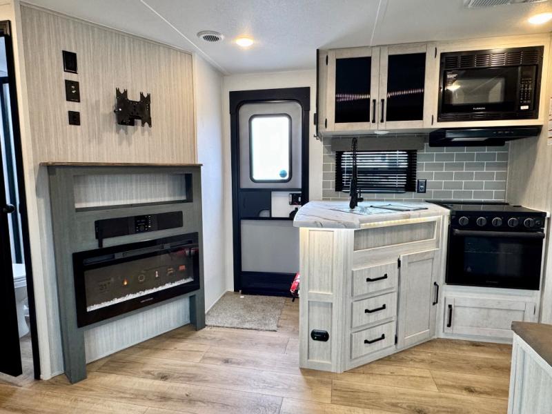 With dual entry doors and a bath and a half, you will have the ultimate in convenience with this travel trailer! The bedroom also has a front closet to keep your clothes looking their best and a queen bed slide for you to sleep your best. Everyone can freshen up in the full bathroom with the 34" x 34" radius shower and fill their bellies with scrambled eggs cooked with the stainless steel oven and range. Enjoy your meals, play games, and even sleep at the booth dinette or relax on the sofa while watching a movie with the entertainment center and fireplace. And your guests will love the rear private bunkhouse with three bunks, a jiffy sofa, and a slide out for more space! This model also includes an optional outside mini kitchen with a griddle!