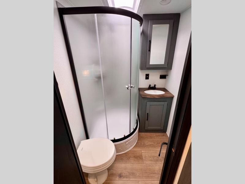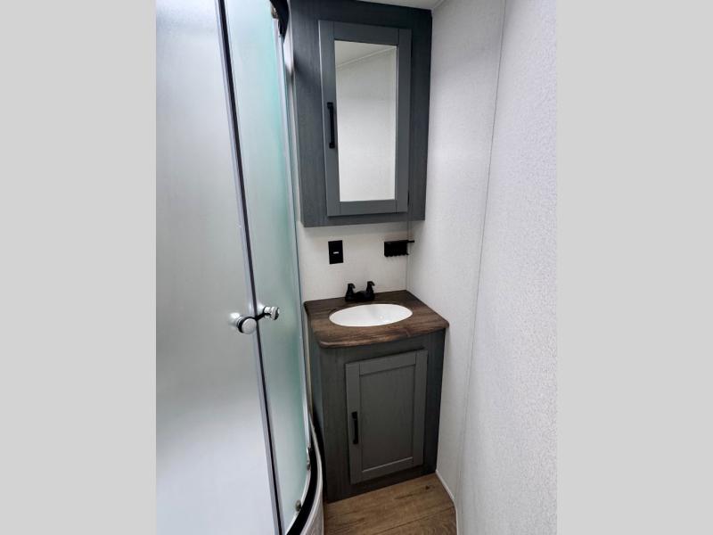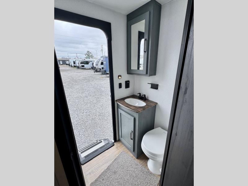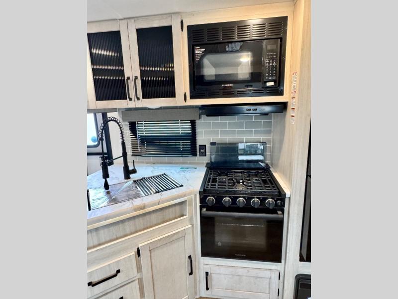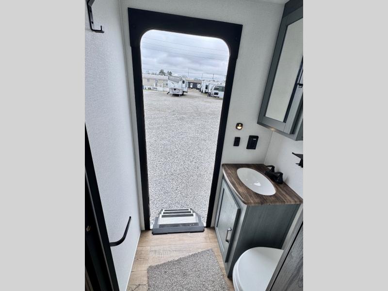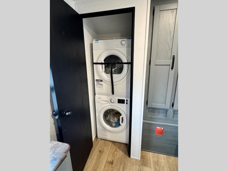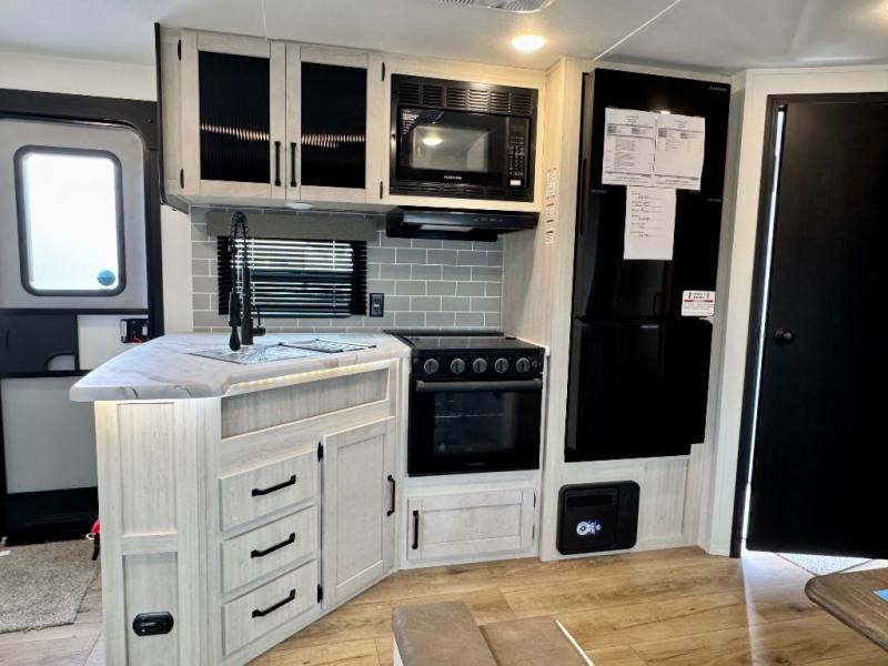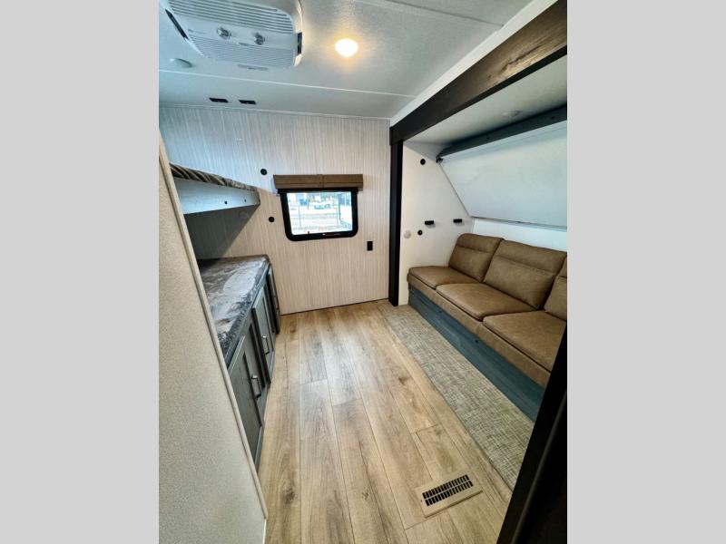 With dual entry doors and a bath and a half, you will have the ultimate in convenience with this travel trailer! The bedroom also has a front closet to keep your clothes looking their best and a queen bed slide for you to sleep your best. Everyone can freshen up in the full bathroom with the 34" x 34" radius shower and fill their bellies with scrambled eggs cooked with the stainless steel oven and range. Enjoy your meals, play games, and even sleep at the booth dinette or relax on the sofa while watching a movie with the entertainment center and fireplace. And your guests will love the rear private bunkhouse with three bunks, a jiffy sofa, and a slide out for more space! This model also includes an optional outside mini kitchen with a griddle!