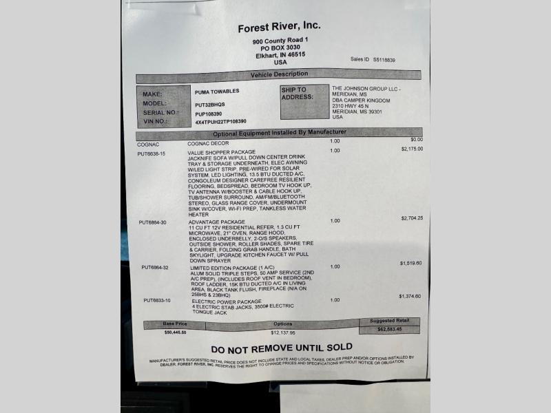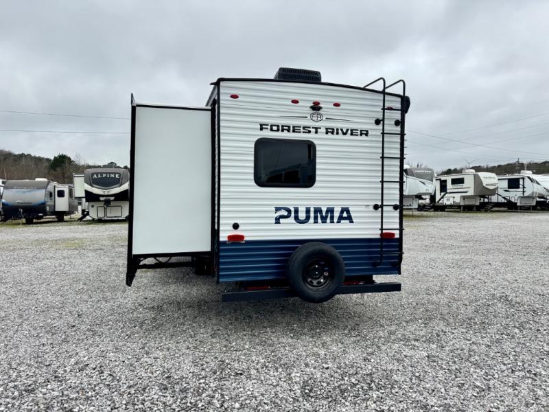 If you're looking for family-fun adventures, then you need one of these Forest River Puma travel trailers! They are built rugged, easy to tow, and jam packed with features. The Darco wrapped underbelly will help protect your unit, and the roof and side mount solar prep gives you the option to add off-grid power. Inside, the Congoleum linoleum will be easy to keep clean, and the night roller shades will provide privacy when it's time to turn in. You'll also enjoy an electric awning with an LED light strip plus an AM/FM/Bluetooth stereo and two outside speakers to keep the party going!