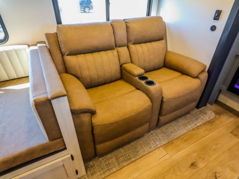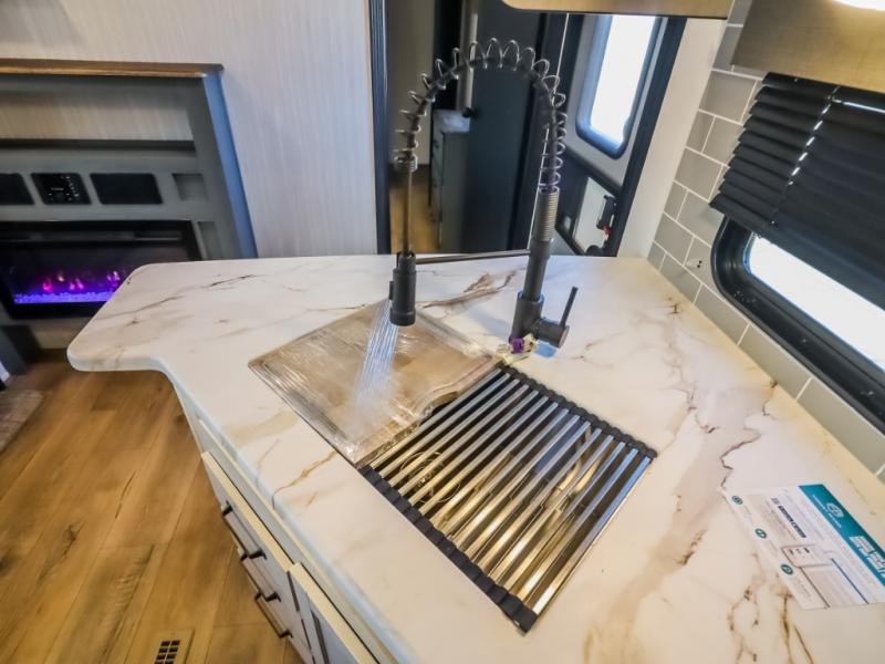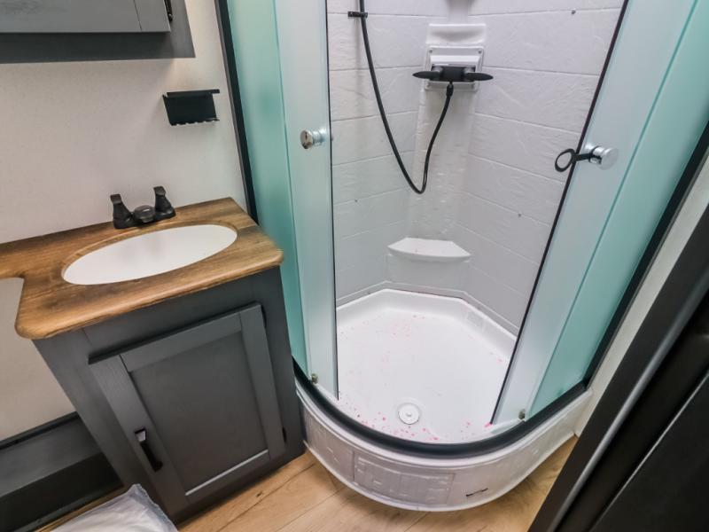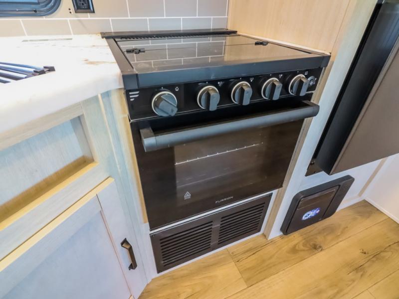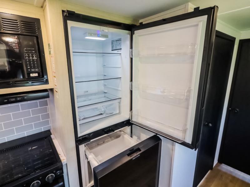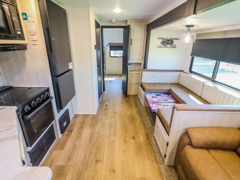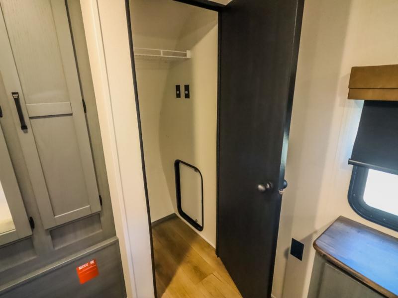 The whole family will love camping in this travel trailer! The kids will have their own privacy with the rear private bunkhouse which has a 32" x 69" bunk above a jiffy sofa slide and a 38" x 76" bunk above an entertainment center to keep them occupied on those rainy days. And you will have your own privacy with the front private bedroom that has a queen bed slide across from a dresser and a front closet. There is even a second closet with washer and dryer prep if you choose to add those appliances. Everyone can stay clean in the full bathroom with the 34" x 34" radius shower and their bellies full with the full kitchen. And you can choose between two outside kitchen options for even more convenience!