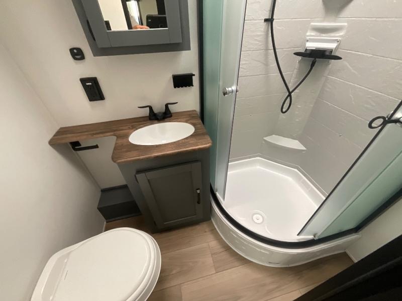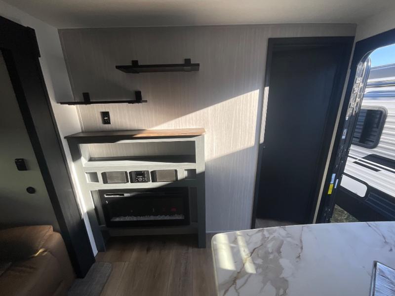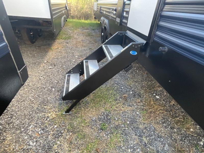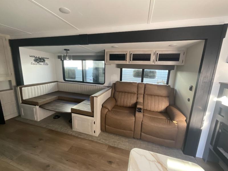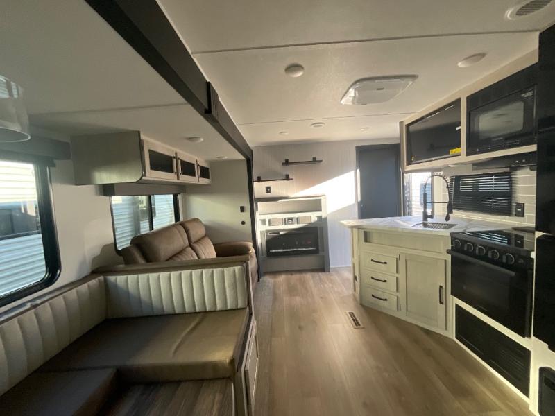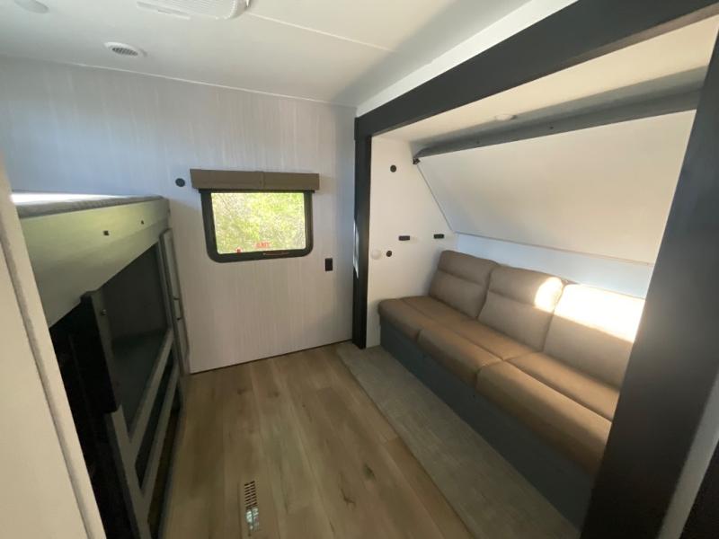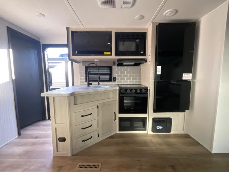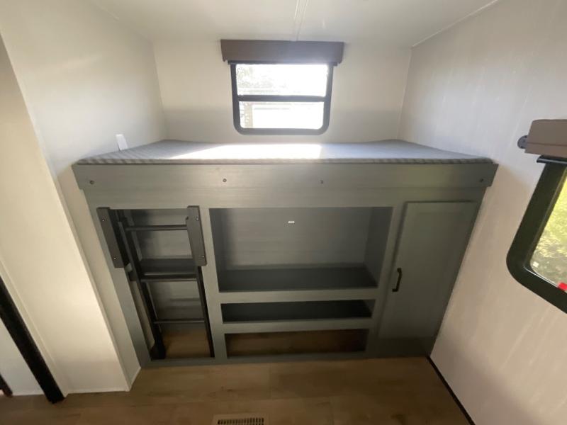 The whole family will love camping in this travel trailer! The kids will have their own privacy with the rear private bunkhouse which has a 32" x 69" bunk above a jiffy sofa slide and a 38" x 76" bunk above an entertainment center to keep them occupied on those rainy days. And you will have your own privacy with the front private bedroom that has a queen bed slide across from a dresser and a front closet. There is even a second closet with washer and dryer prep if you choose to add those appliances. Everyone can stay clean in the full bathroom with the 34" x 34" radius shower and their bellies full with the full kitchen. And you can choose between two outside kitchen options for even more convenience!