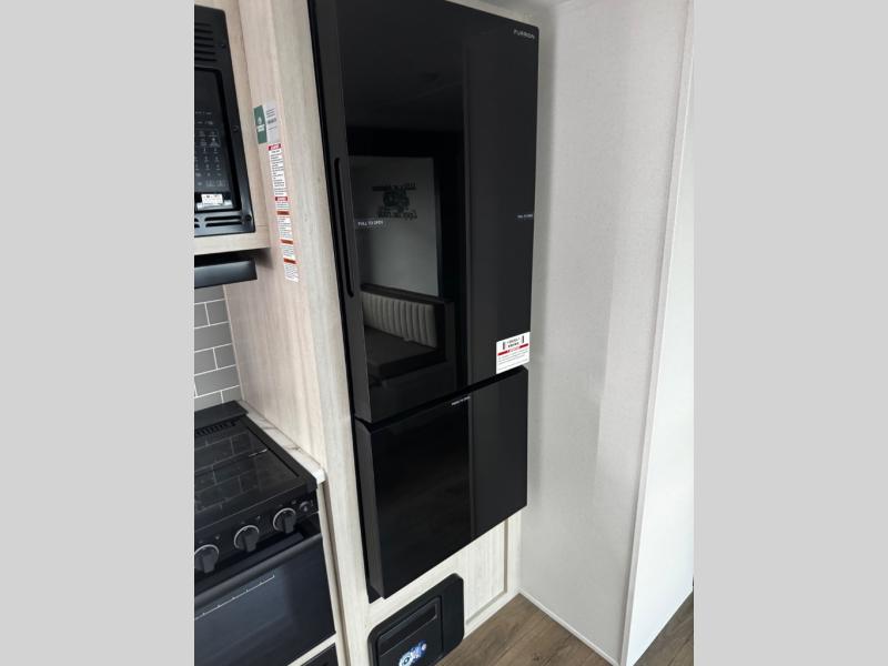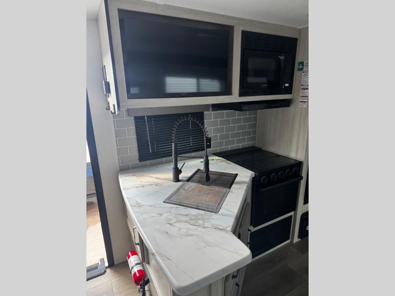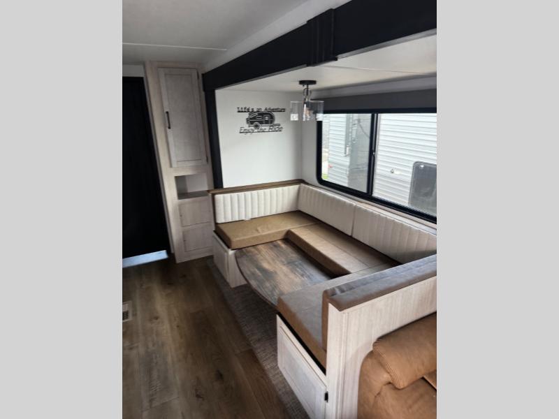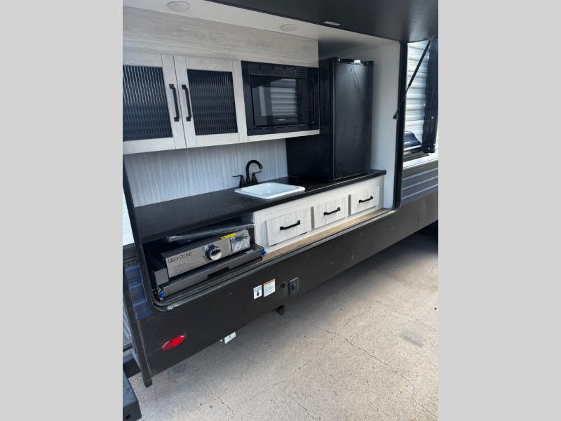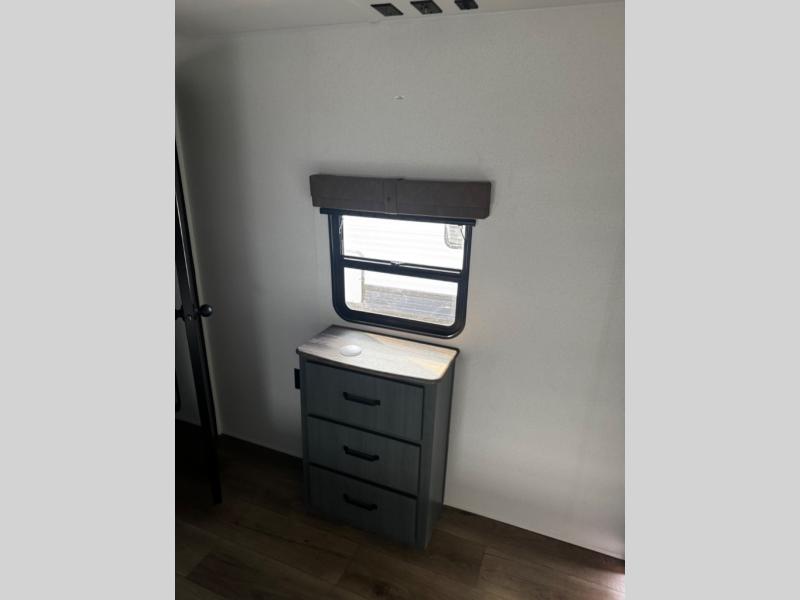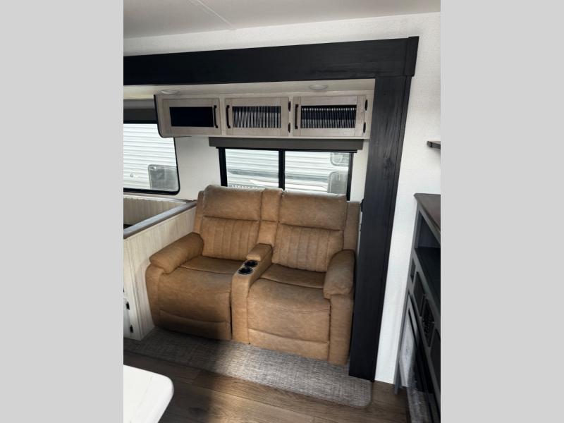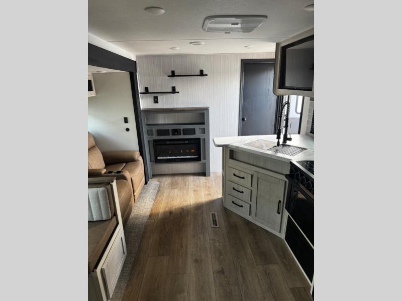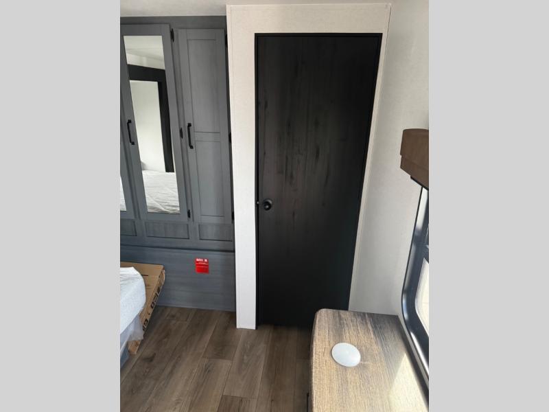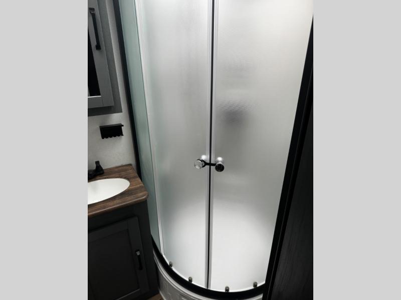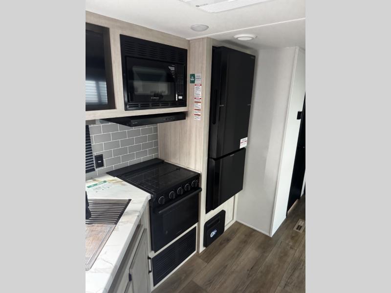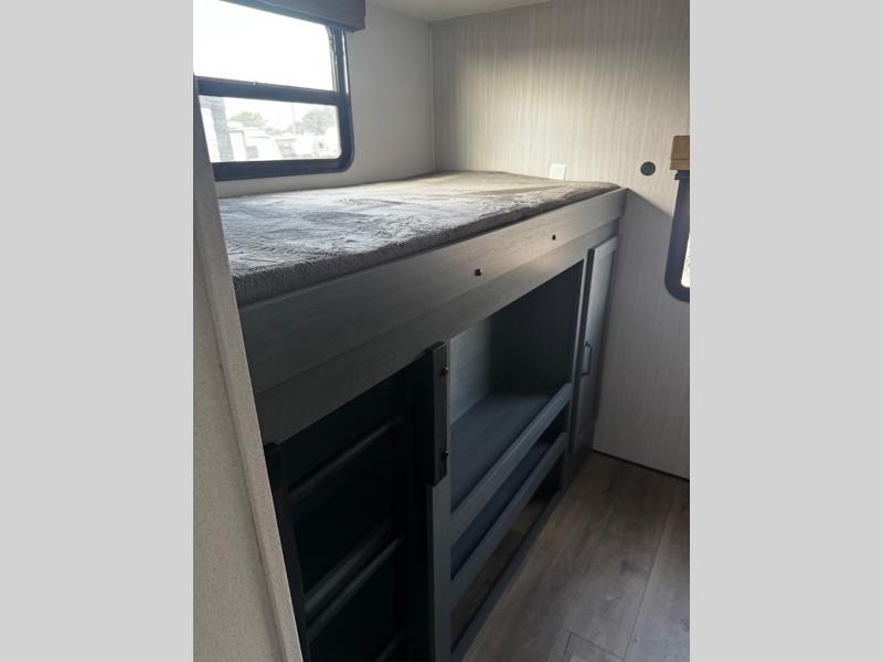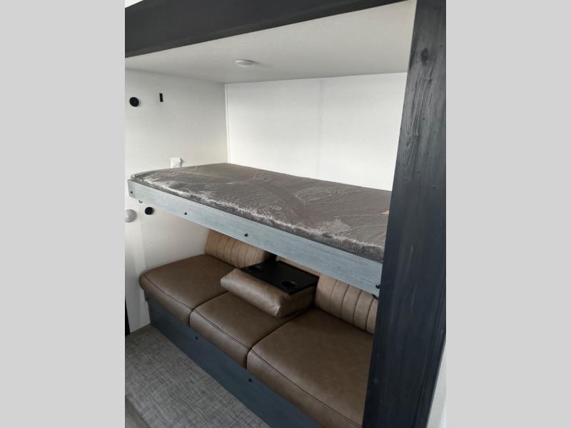 The whole family will love camping in this travel trailer! The kids will have their own privacy with the rear private bunkhouse which has a 32" x 69" bunk above a jiffy sofa slide and a 38" x 76" bunk above an entertainment center to keep them occupied on those rainy days. And you will have your own privacy with the front private bedroom that has a queen bed slide across from a dresser and a front closet. There is even a second closet with washer and dryer prep if you choose to add those appliances. Everyone can stay clean in the full bathroom with the 34" x 34" radius shower and their bellies full with the full kitchen. And you can choose between two outside kitchen options for even more convenience!