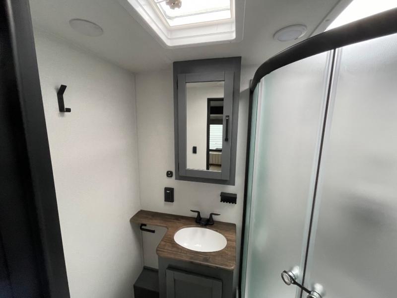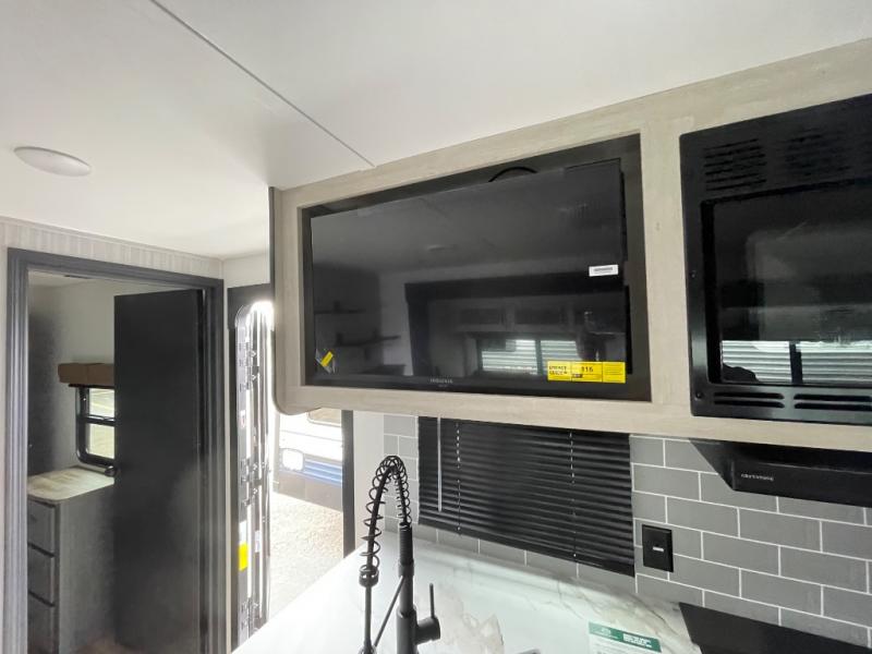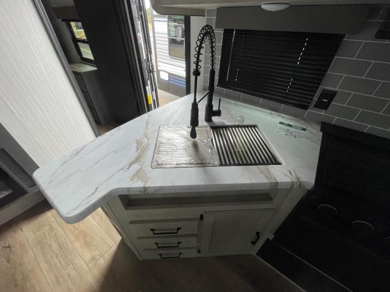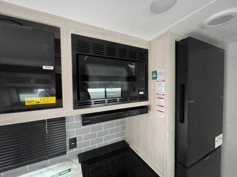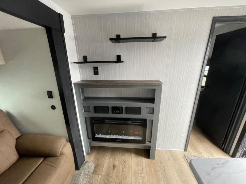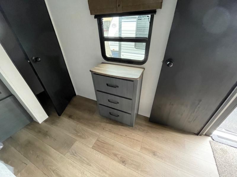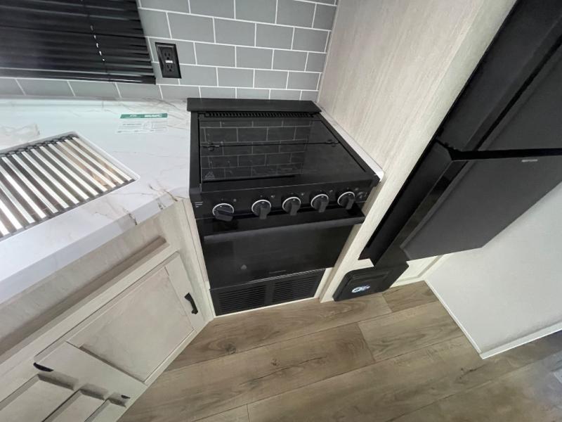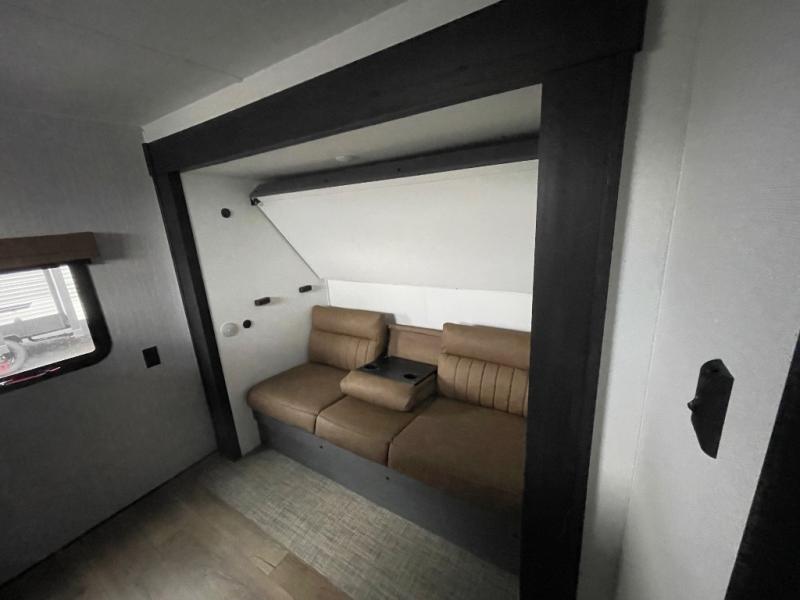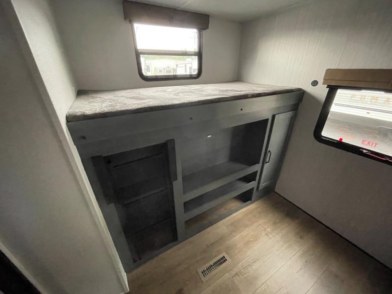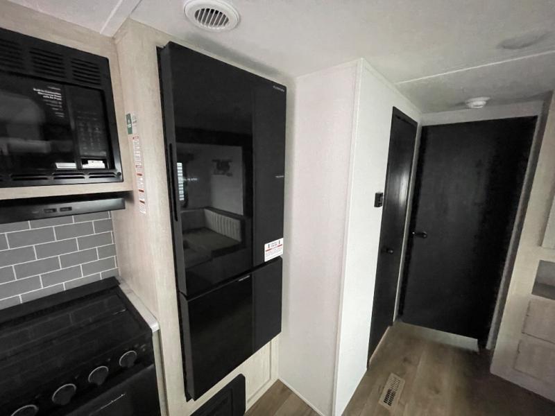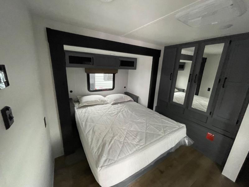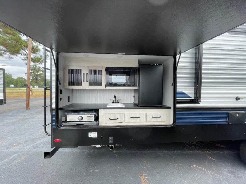 The whole family will love camping in this travel trailer! The kids will have their own privacy with the rear private bunkhouse which has a 32" x 69" bunk above a jiffy sofa slide and a 38" x 76" bunk above an entertainment center to keep them occupied on those rainy days. And you will have your own privacy with the front private bedroom that has a queen bed slide across from a dresser and a front closet. There is even a second closet with washer and dryer prep if you choose to add those appliances. Everyone can stay clean in the full bathroom with the 34" x 34" radius shower and their bellies full with the full kitchen. And you can choose between two outside kitchen options for even more convenience!