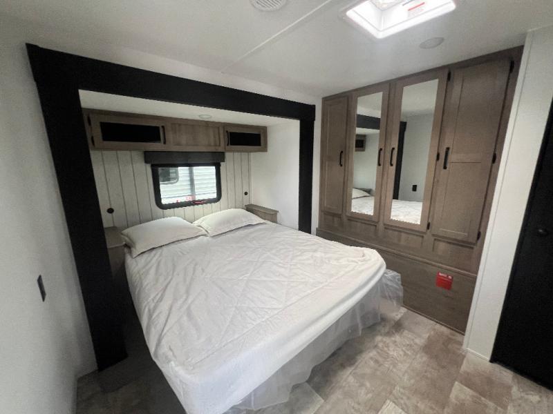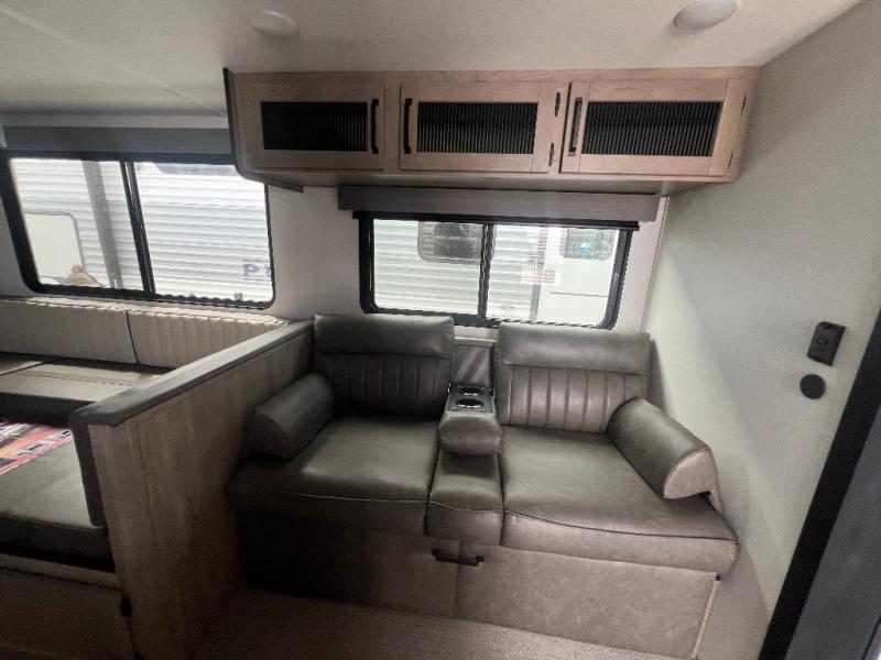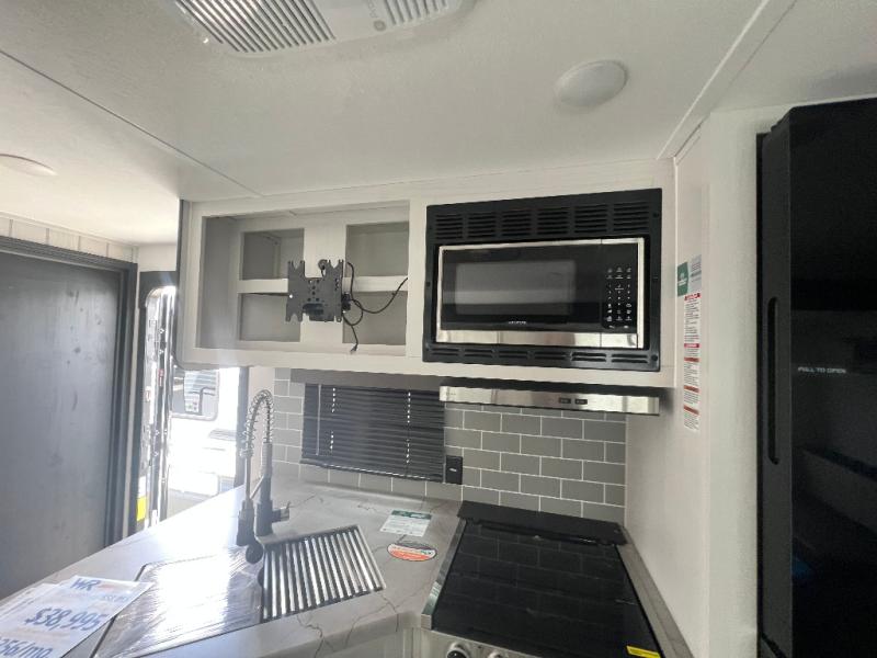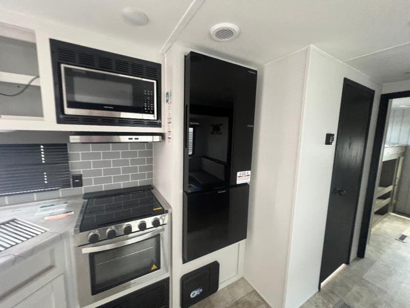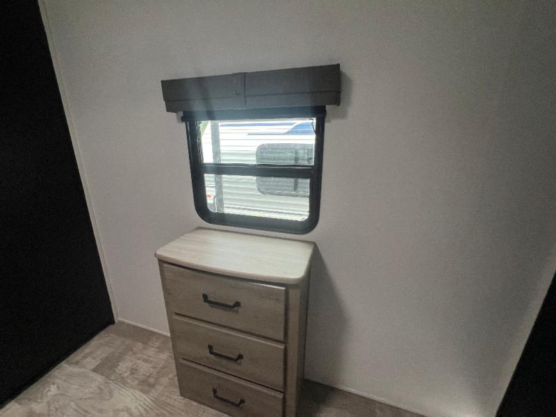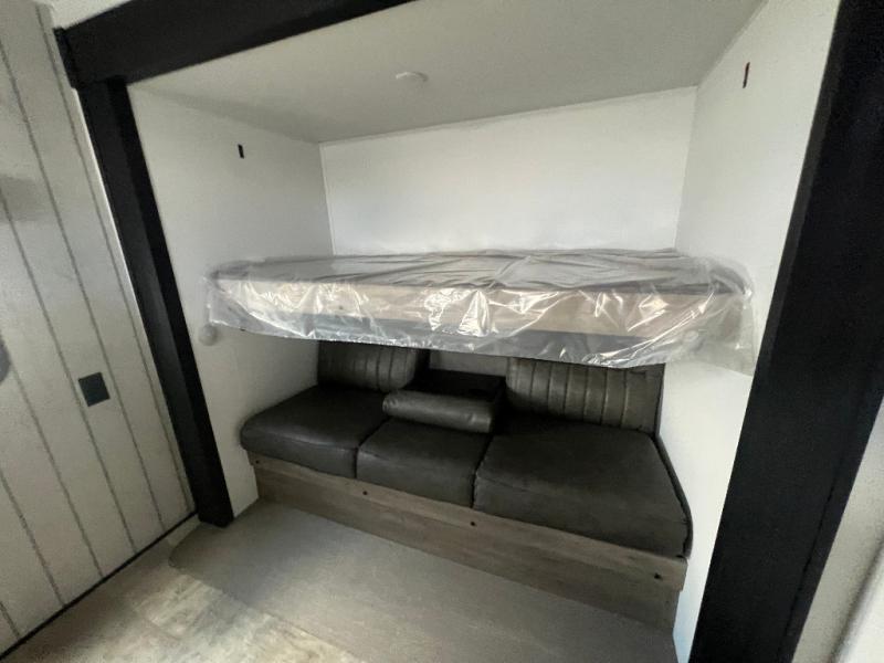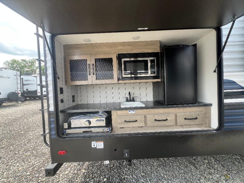 The whole family will love camping in this travel trailer! The kids will have their own privacy with the rear private bunkhouse which has a 32" x 69" bunk above a jiffy sofa slide and a 38" x 76" bunk above an entertainment center to keep them occupied on those rainy days. And you will have your own privacy with the front private bedroom that has a queen bed slide across from a dresser and a front closet. There is even a second closet with washer and dryer prep if you choose to add those appliances. Everyone can stay clean in the full bathroom with the 34" x 34" radius shower and their bellies full with the full kitchen. And you can choose between two outside kitchen options for even more convenience!