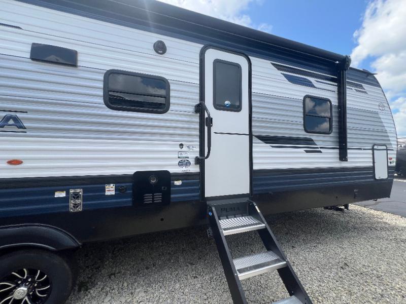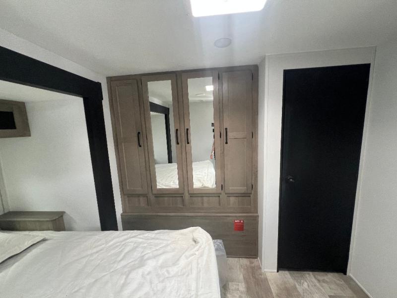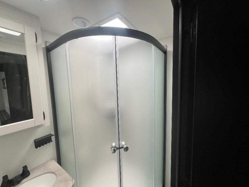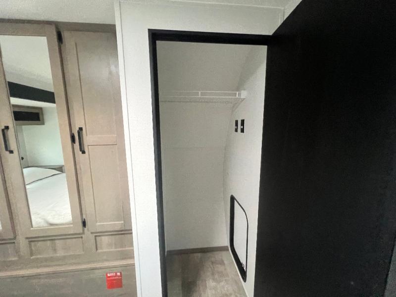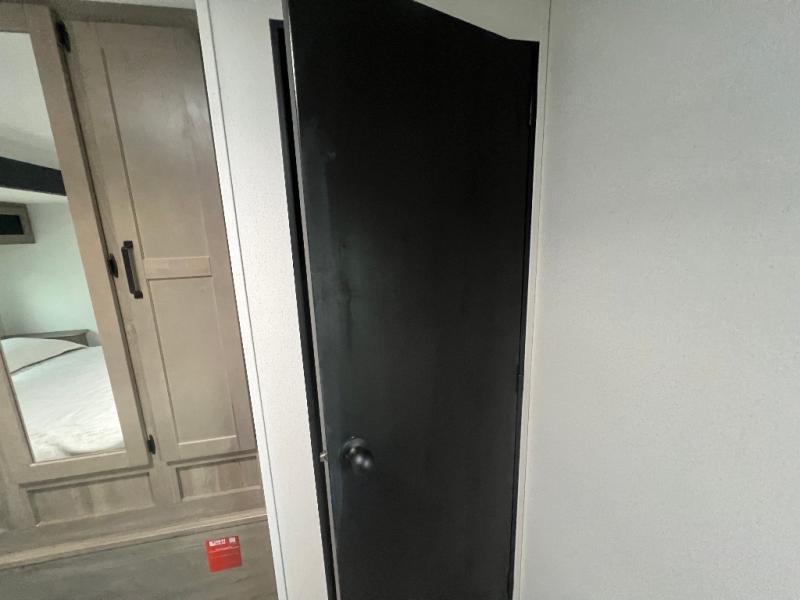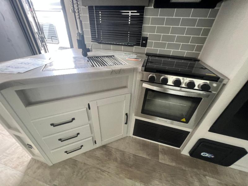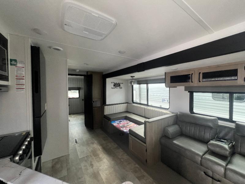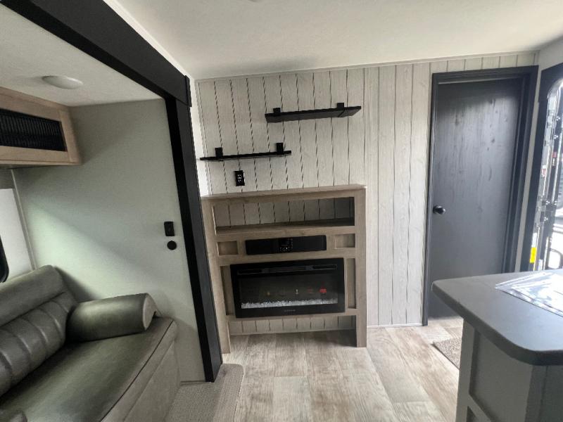 The whole family will love camping in this travel trailer! The kids will have their own privacy with the rear private bunkhouse which has a 32" x 69" bunk above a jiffy sofa slide and a 38" x 76" bunk above an entertainment center to keep them occupied on those rainy days. And you will have your own privacy with the front private bedroom that has a queen bed slide across from a dresser and a front closet. There is even a second closet with washer and dryer prep if you choose to add those appliances. Everyone can stay clean in the full bathroom with the 34" x 34" radius shower and their bellies full with the full kitchen. And you can choose between two outside kitchen options for even more convenience!
