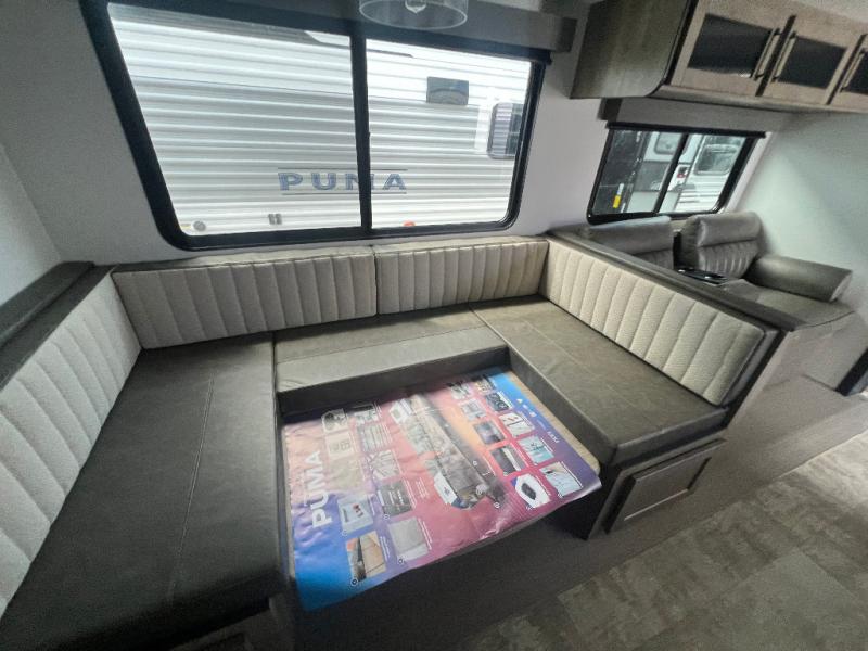 If you're looking for family-fun adventures then you need one of these Palomino Puma fifth wheels or travel trailers! They are built rugged, easy to tow, and jam packed with features. The Darco wrapped underbelly will protect your units vitals and the AlphaPly roofing membrane covers it. They also have new aluminum wheels and a powder coated steel I-beam frame. Inside, the Congoleum linoleum will be easy to keep clean, and the night roller shades will provide privacy when it's time to turn in. You'll also enjoy an electric awning with an LED light strip plus an AM/FM/Bluetooth stereo and two outside speakers to keep the party going!