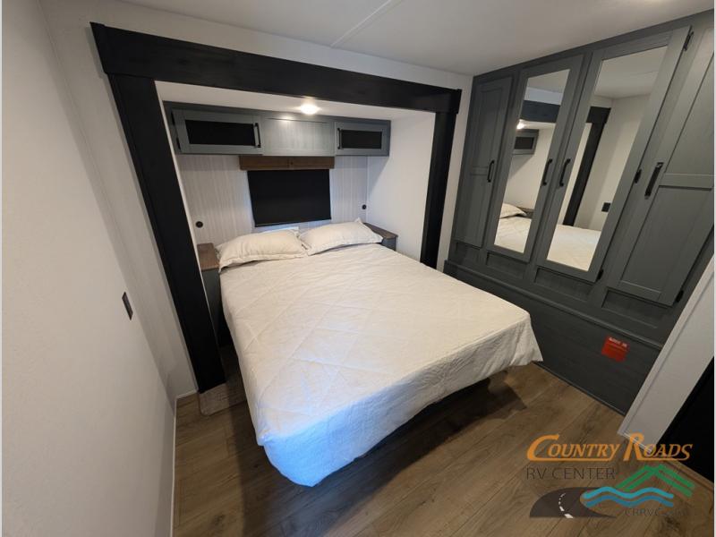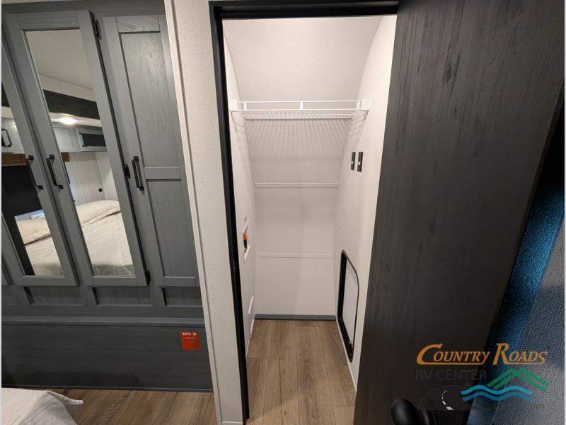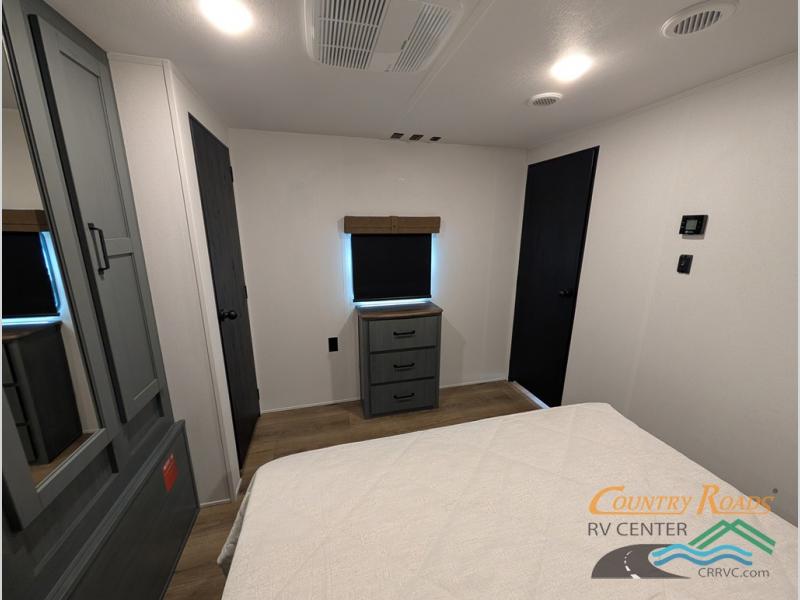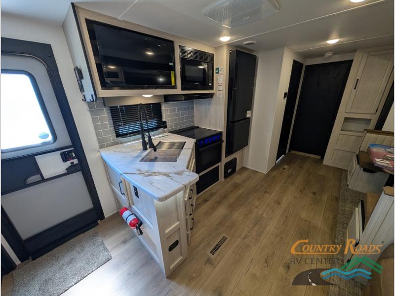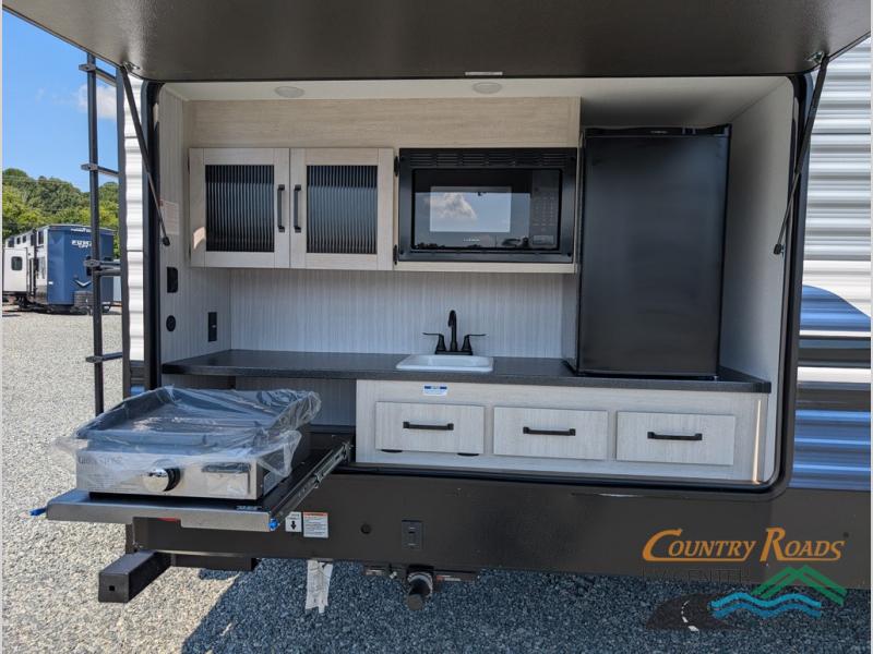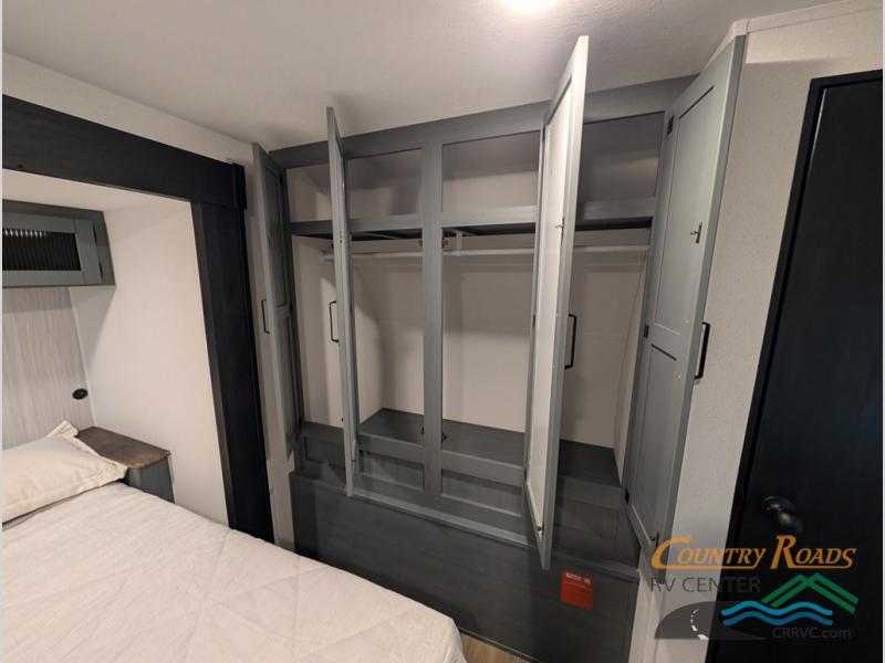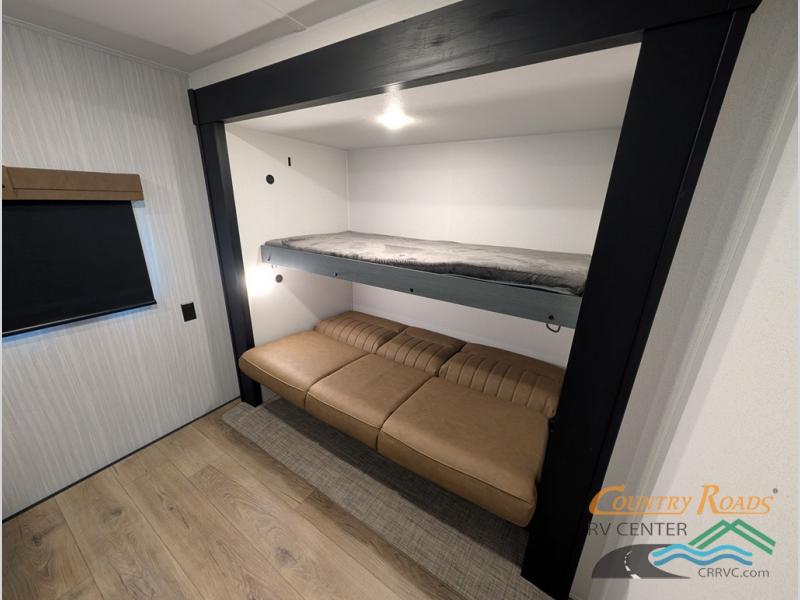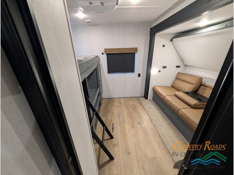 The whole family will love camping in this travel trailer! The kids will have their own privacy with the rear private bunkhouse which has a 32" x 69" bunk above a jiffy sofa slide and a 38" x 76" bunk above an entertainment center to keep them occupied on those rainy days. And you will have your own privacy with the front private bedroom that has a queen bed slide across from a dresser and a front closet. There is even a second closet with washer and dryer prep if you choose to add those appliances. Everyone can stay clean in the full bathroom with the 34" x 34" radius shower and their bellies full with the full kitchen. And you can choose between two outside kitchen options for even more convenience!