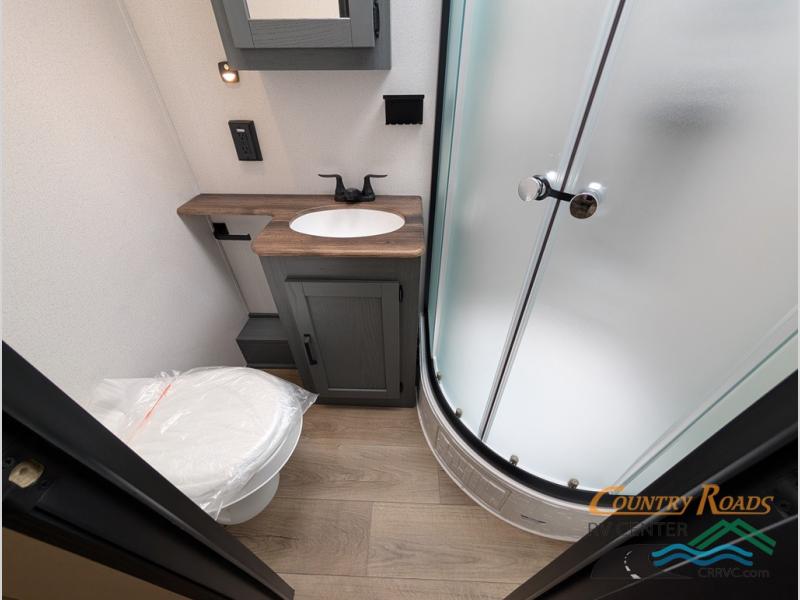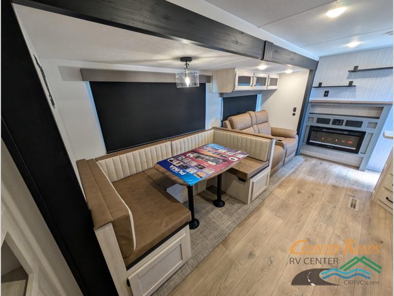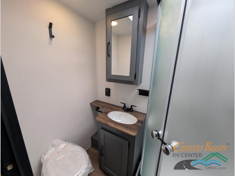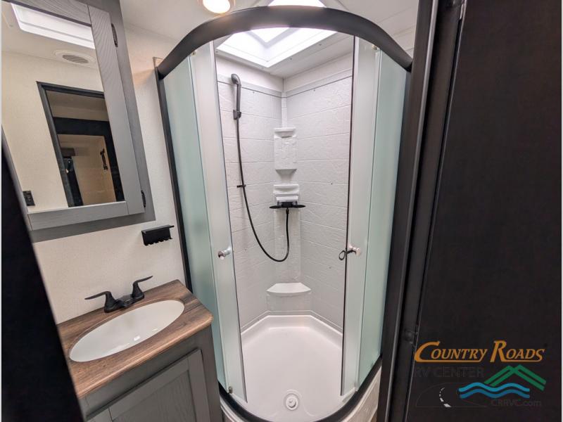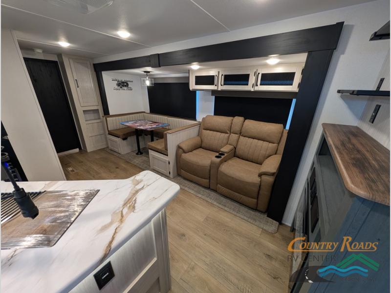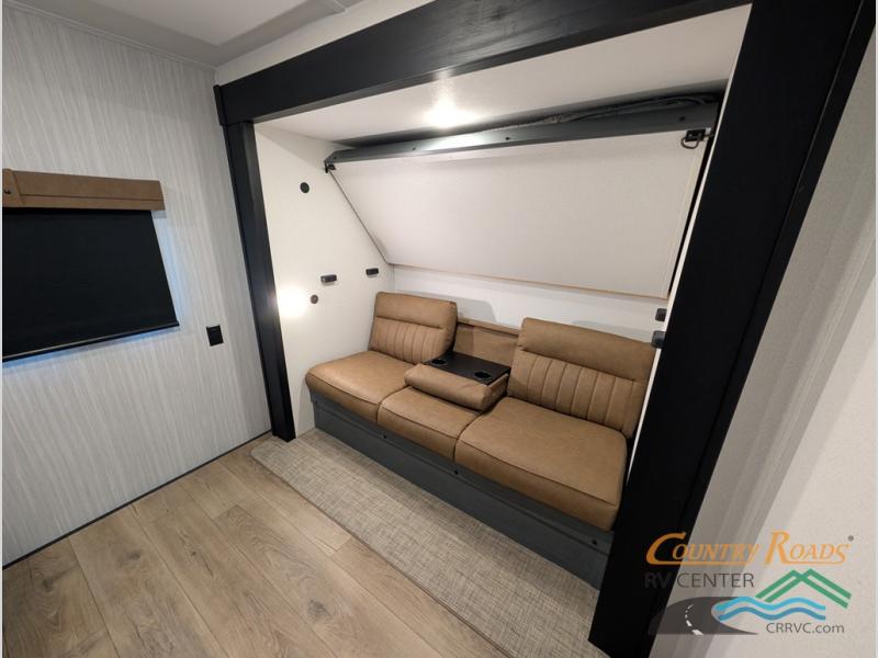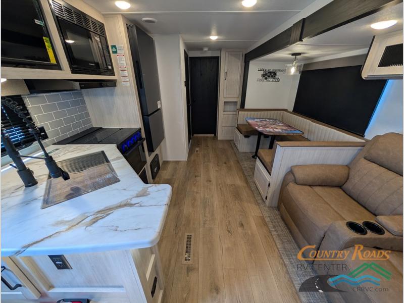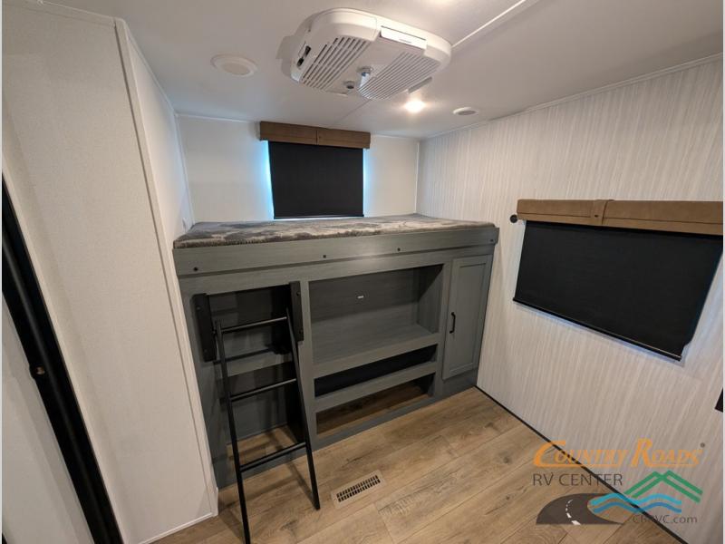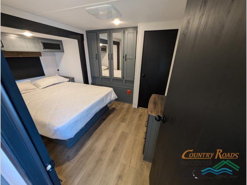 The whole family will love camping in this travel trailer! The kids will have their own privacy with the rear private bunkhouse which has a 32" x 69" bunk above a jiffy sofa slide and a 38" x 76" bunk above an entertainment center to keep them occupied on those rainy days. And you will have your own privacy with the front private bedroom that has a queen bed slide across from a dresser and a front closet. There is even a second closet with washer and dryer prep if you choose to add those appliances. Everyone can stay clean in the full bathroom with the 34" x 34" radius shower and their bellies full with the full kitchen. And you can choose between two outside kitchen options for even more convenience!