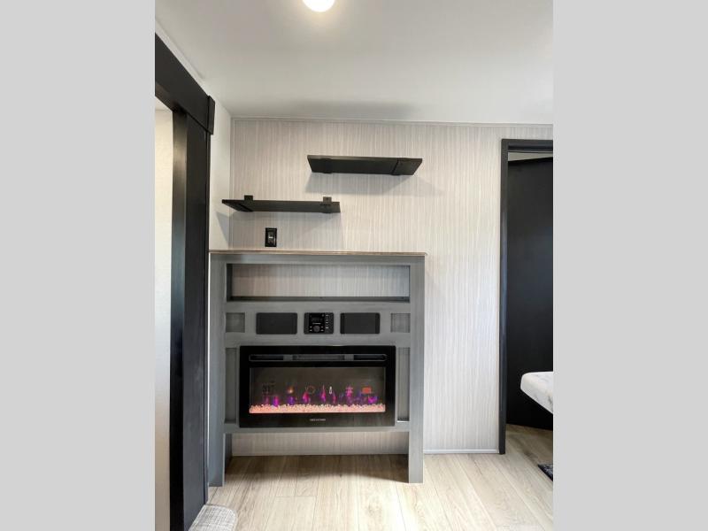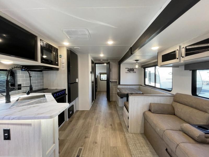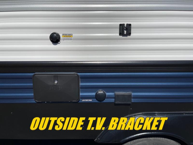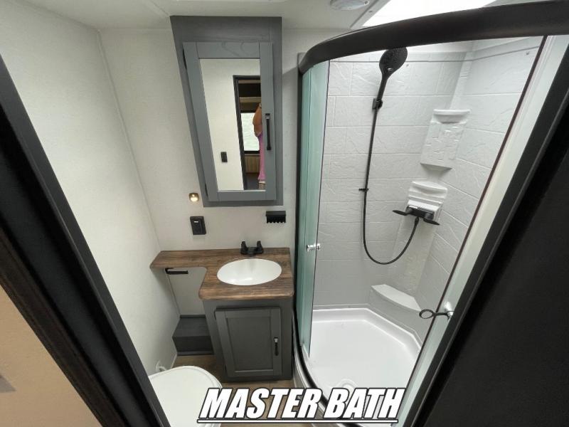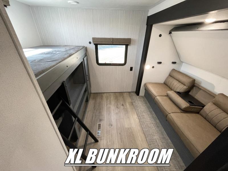 The whole family will love camping in this travel trailer! The kids will have their own privacy with the rear private bunkhouse which has a 32" x 69" bunk above a jiffy sofa slide and a 38" x 76" bunk above an entertainment center to keep them occupied on those rainy days. And you will have your own privacy with the front private bedroom that has a queen bed slide across from a dresser and a front closet. There is even a second closet with washer and dryer prep if you choose to add those appliances. Everyone can stay clean in the full bathroom with the 34" x 34" radius shower and their bellies full with the full kitchen. And you can choose between two outside kitchen options for even more convenience!