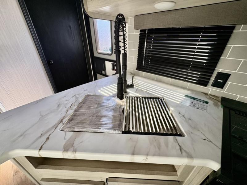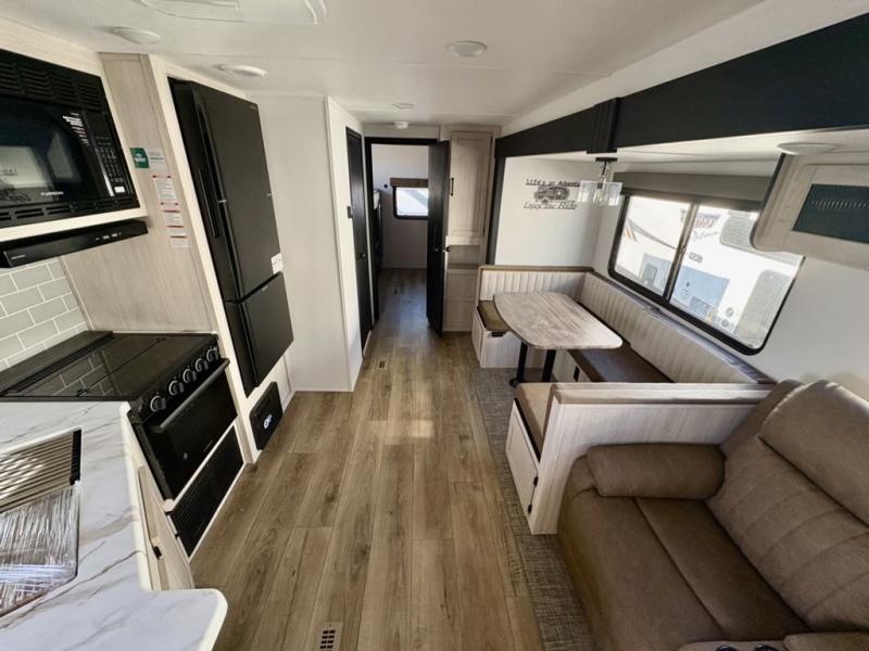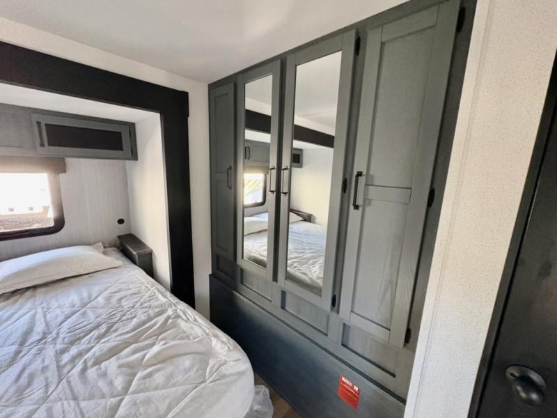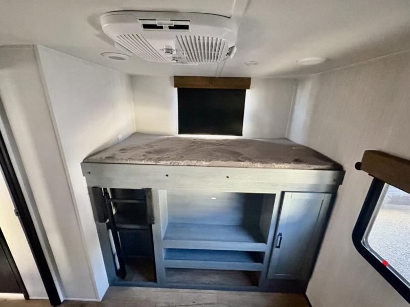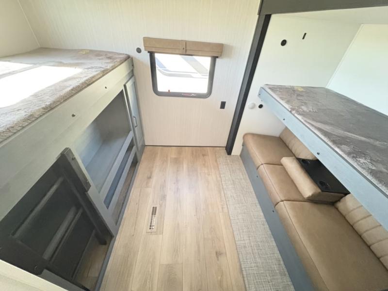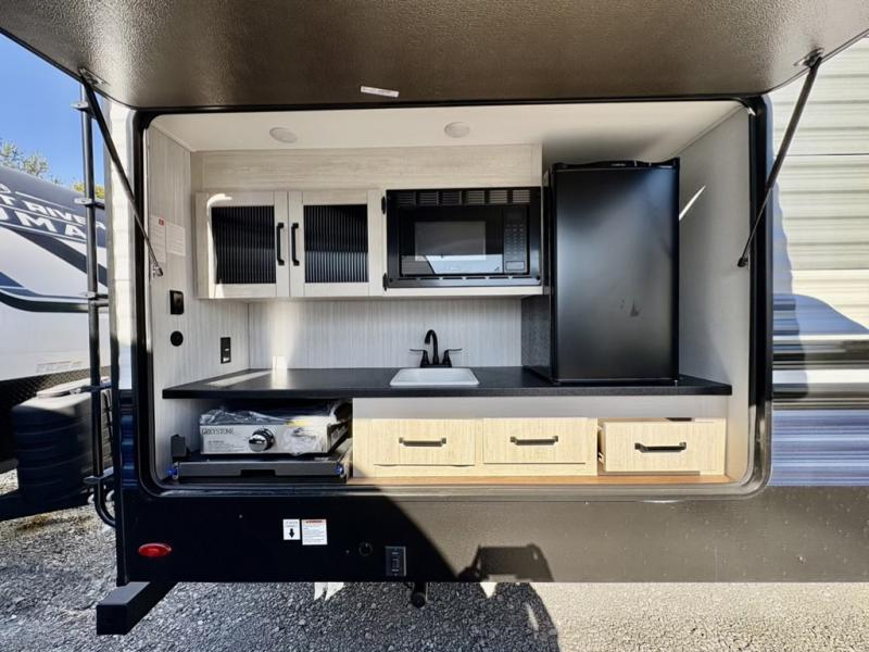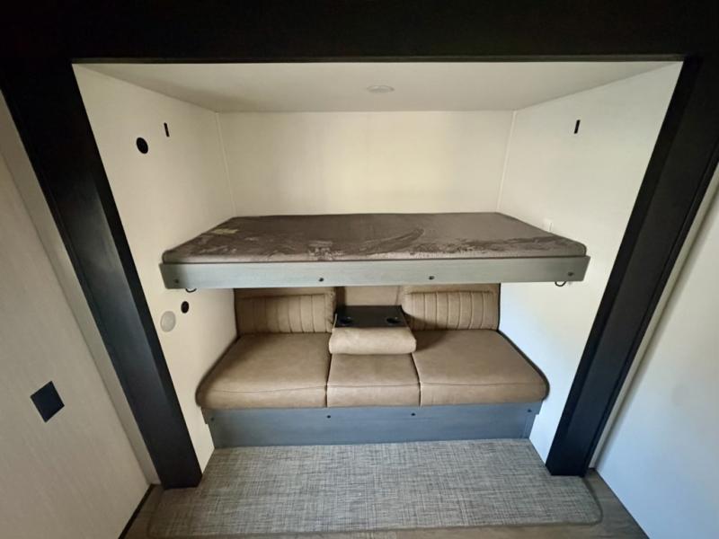 The whole family will love camping in this travel trailer! The kids will have their own privacy with the rear private bunkhouse which has a 32" x 69" bunk above a jiffy sofa slide and a 38" x 76" bunk above an entertainment center to keep them occupied on those rainy days. And you will have your own privacy with the front private bedroom that has a queen bed slide across from a dresser and a front closet. There is even a second closet with washer and dryer prep if you choose to add those appliances. Everyone can stay clean in the full bathroom with the 34" x 34" radius shower and their bellies full with the full kitchen. And you can choose between two outside kitchen options for even more convenience!