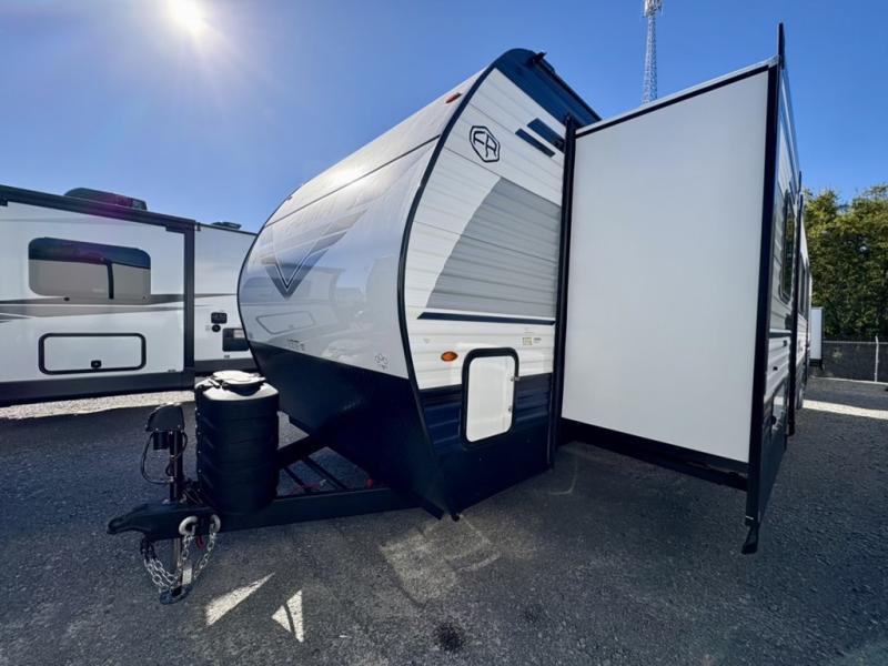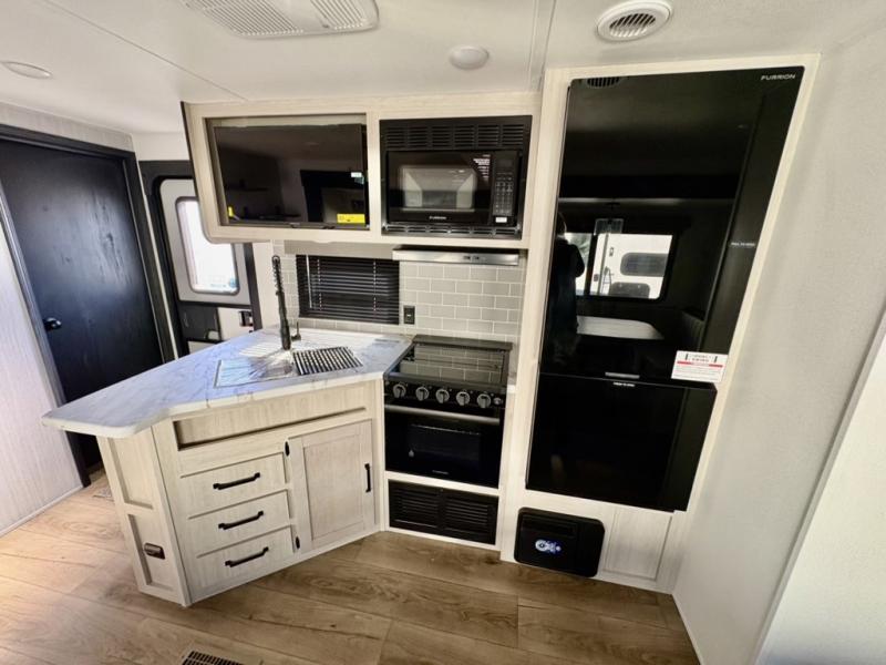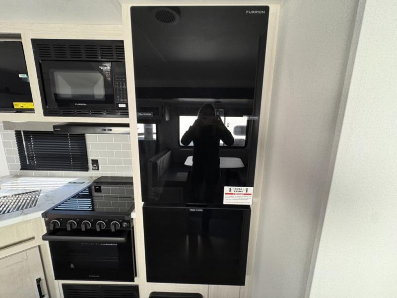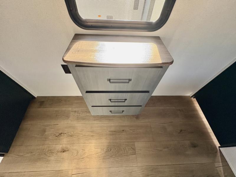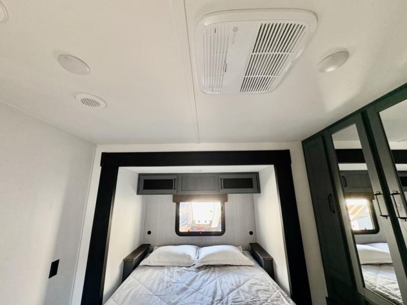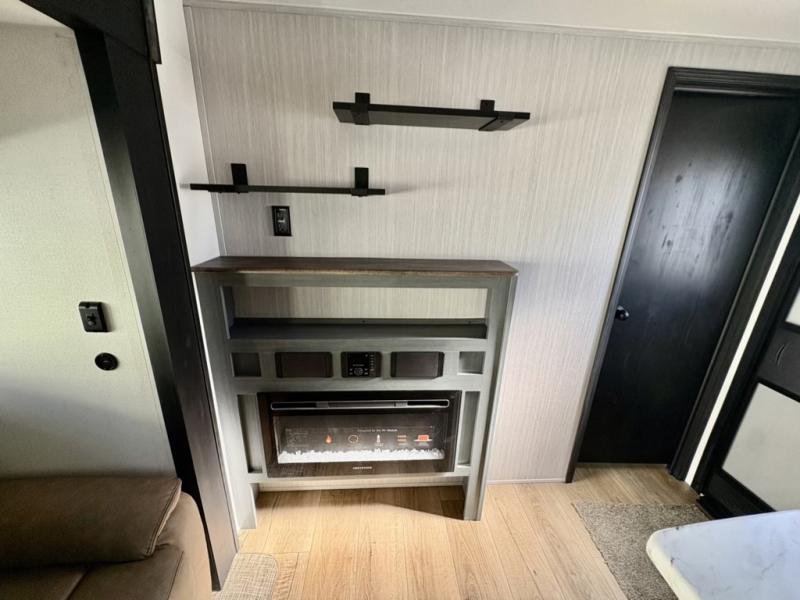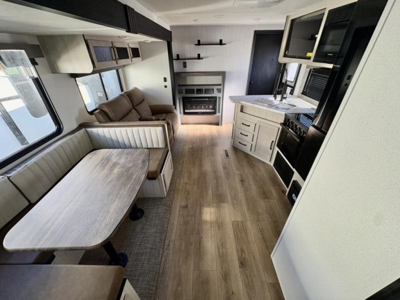 The whole family will love camping in this travel trailer! The kids will have their own privacy with the rear private bunkhouse which has a 32" x 69" bunk above a jiffy sofa slide and a 38" x 76" bunk above an entertainment center to keep them occupied on those rainy days. And you will have your own privacy with the front private bedroom that has a queen bed slide across from a dresser and a front closet. There is even a second closet with washer and dryer prep if you choose to add those appliances. Everyone can stay clean in the full bathroom with the 34" x 34" radius shower and their bellies full with the full kitchen. And you can choose between two outside kitchen options for even more convenience!