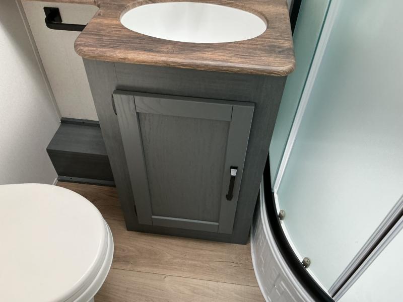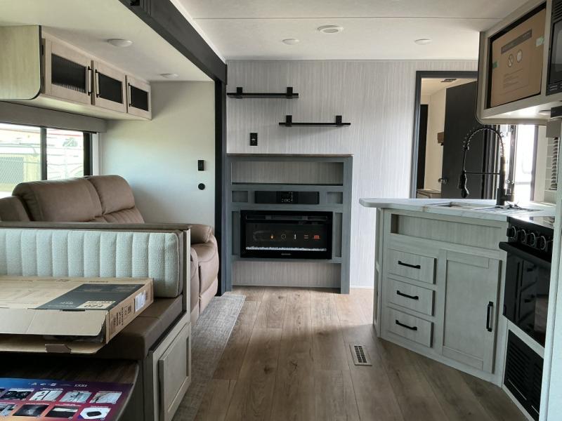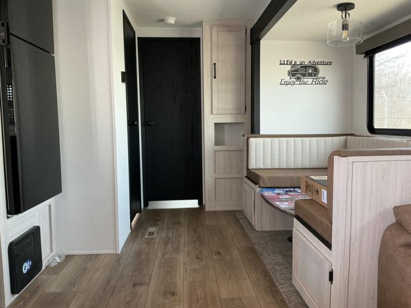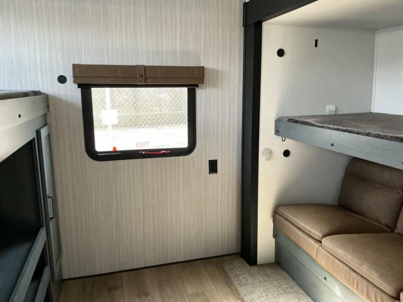 The whole family will love camping in this travel trailer! The kids will have their own privacy with the rear private bunkhouse which has a 32" x 69" bunk above a jiffy sofa slide and a 38" x 76" bunk above an entertainment center to keep them occupied on those rainy days. And you will have your own privacy with the front private bedroom that has a queen bed slide across from a dresser and a front closet. There is even a second closet with washer and dryer prep if you choose to add those appliances. Everyone can stay clean in the full bathroom with the 34" x 34" radius shower and their bellies full with the full kitchen. And you can choose between two outside kitchen options for even more convenience!