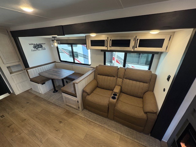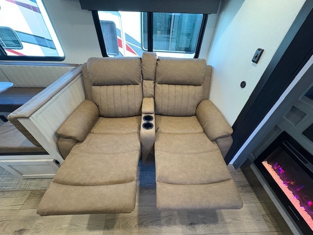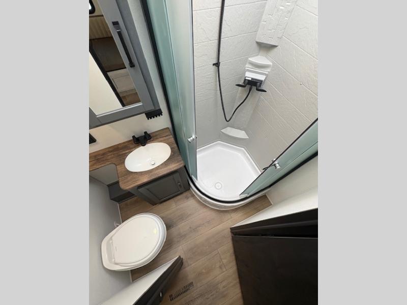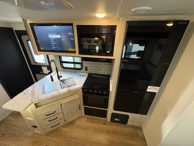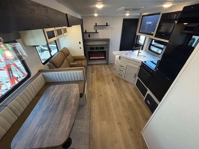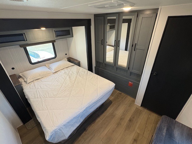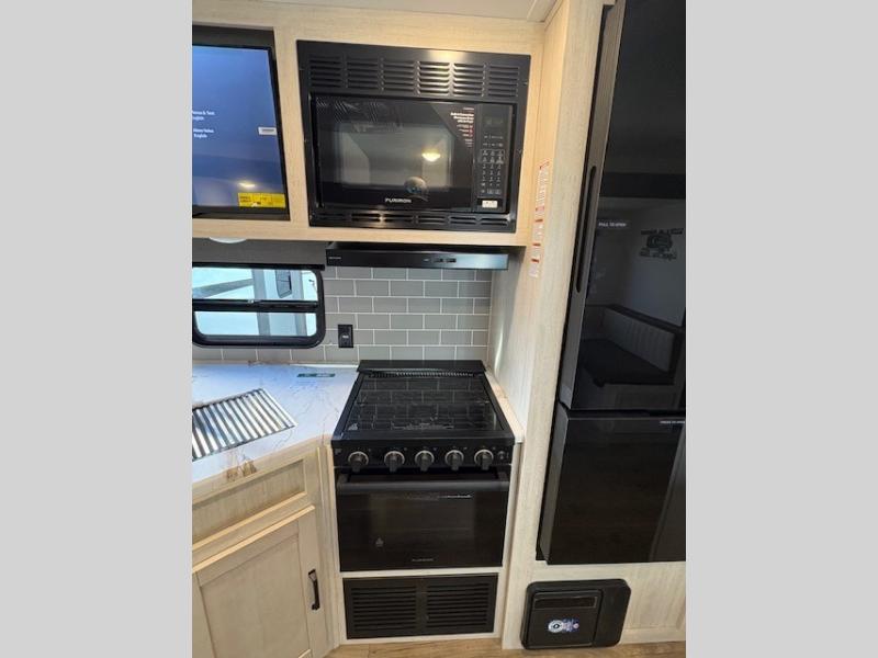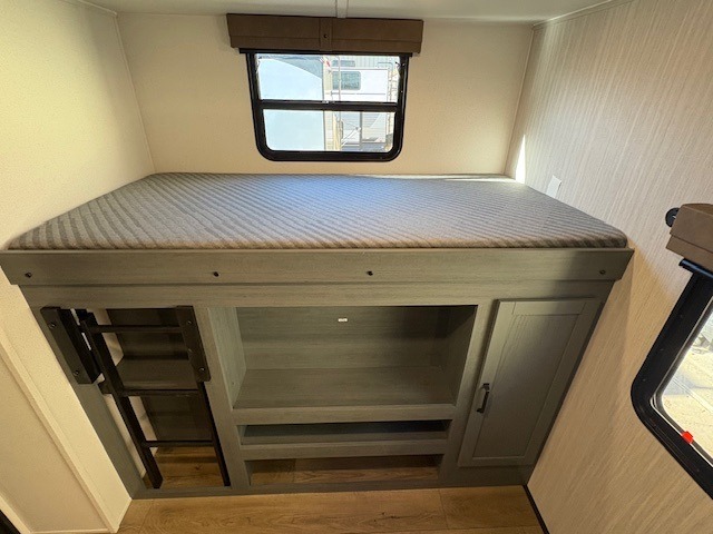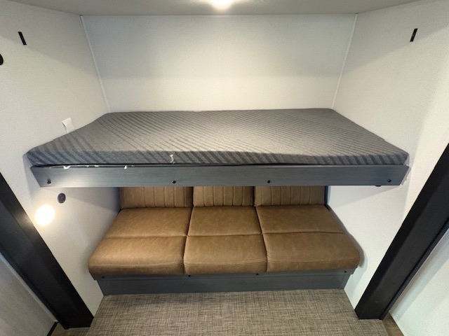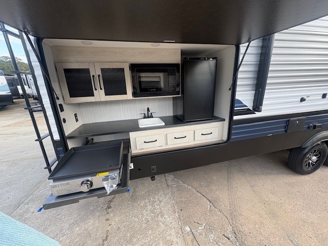 The whole family will love camping in this travel trailer! The kids will have their own privacy with the rear private bunkhouse which has a 32" x 69" bunk above a jiffy sofa slide and a 38" x 76" bunk above an entertainment center to keep them occupied on those rainy days. And you will have your own privacy with the front private bedroom that has a queen bed slide across from a dresser and a front closet. There is even a second closet with washer and dryer prep if you choose to add those appliances. Everyone can stay clean in the full bathroom with the 34" x 34" radius shower and their bellies full with the full kitchen. And you can choose between two outside kitchen options for even more convenience!