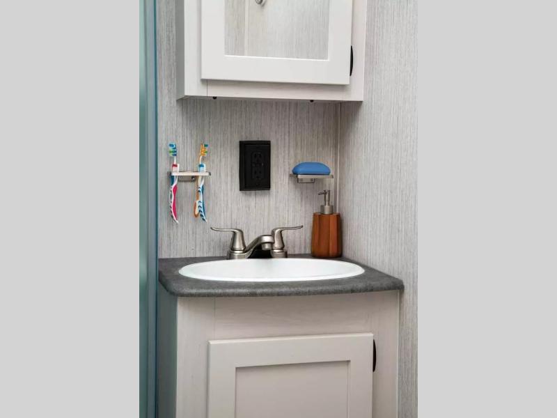 The whole family will love camping in this travel trailer! The kids will have their own privacy with the rear private bunkhouse which has a 32" x 69" bunk above a jiffy sofa slide and a 38" x 76" bunk above an entertainment center to keep them occupied on those rainy days. And you will have your own privacy with the front private bedroom that has a queen bed slide across from a dresser and a front closet. There is even a second closet with washer and dryer prep if you choose to add those appliances. Everyone can stay clean in the full bathroom with the 34" x 34" radius shower and their bellies full with the full kitchen. And you can choose between two outside kitchen options for even more convenience!