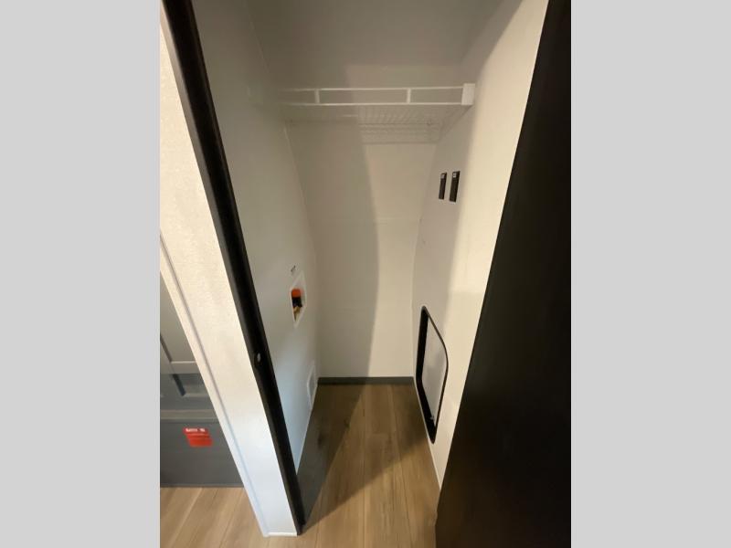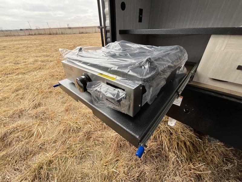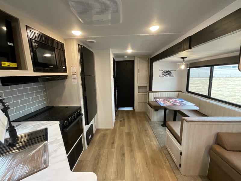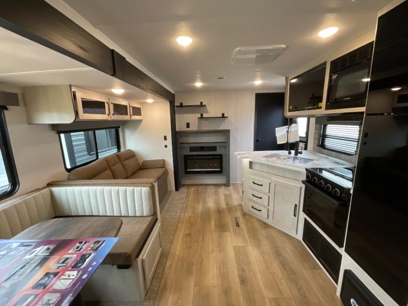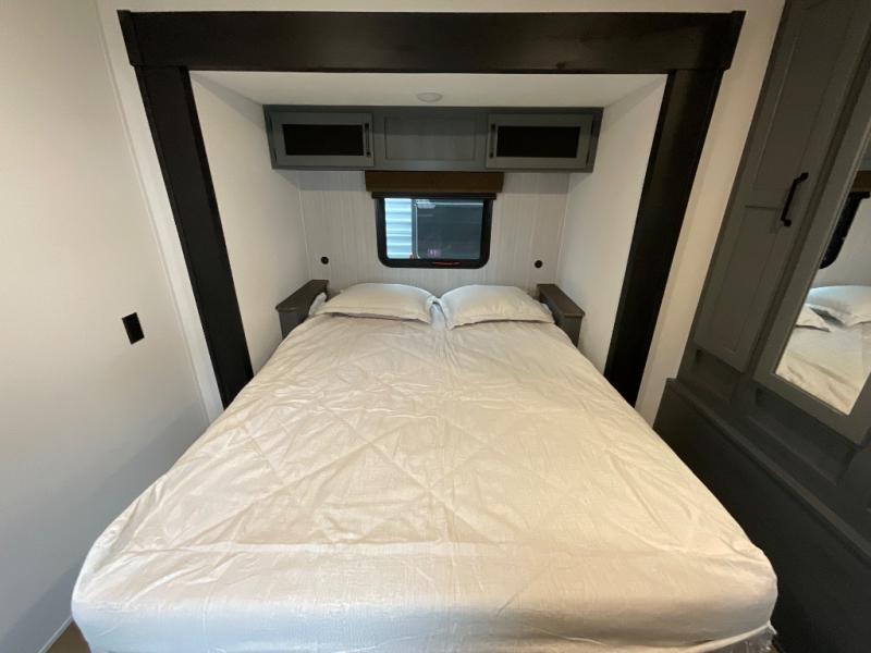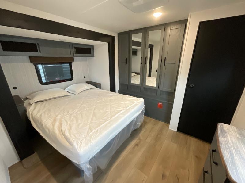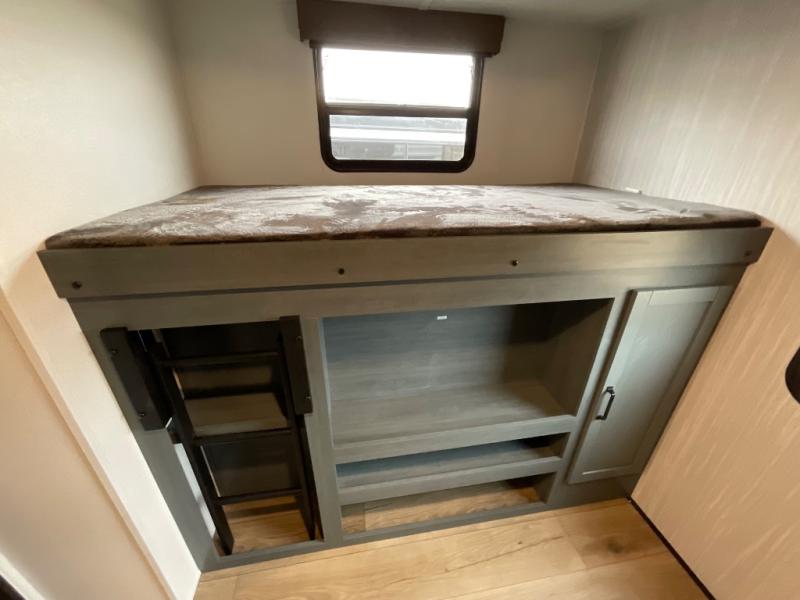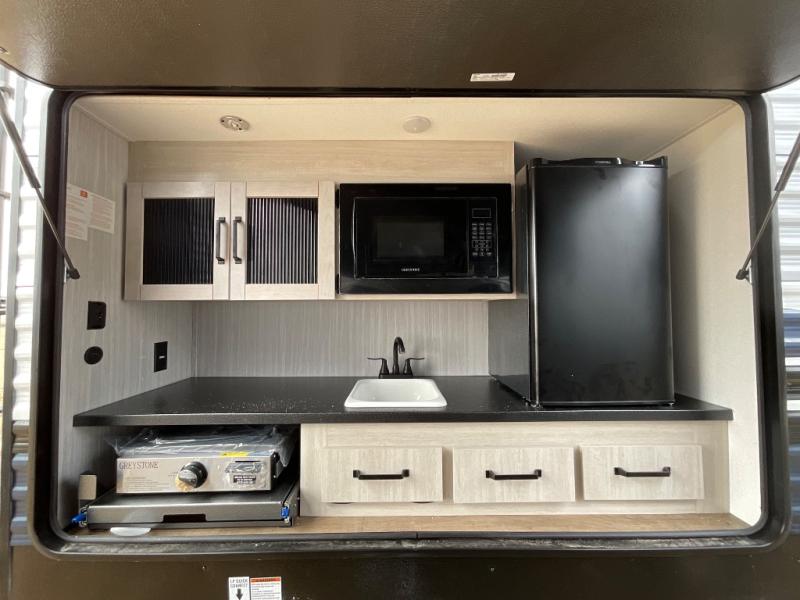 The whole family will love camping in this travel trailer! The kids will have their own privacy with the rear private bunkhouse which has a 32" x 69" bunk above a jiffy sofa slide and a 38" x 76" bunk above an entertainment center to keep them occupied on those rainy days. And you will have your own privacy with the front private bedroom that has a queen bed slide across from a dresser and a front closet. There is even a second closet with washer and dryer prep if you choose to add those appliances. Everyone can stay clean in the full bathroom with the 34" x 34" radius shower and their bellies full with the full kitchen. And you can choose between two outside kitchen options for even more convenience!