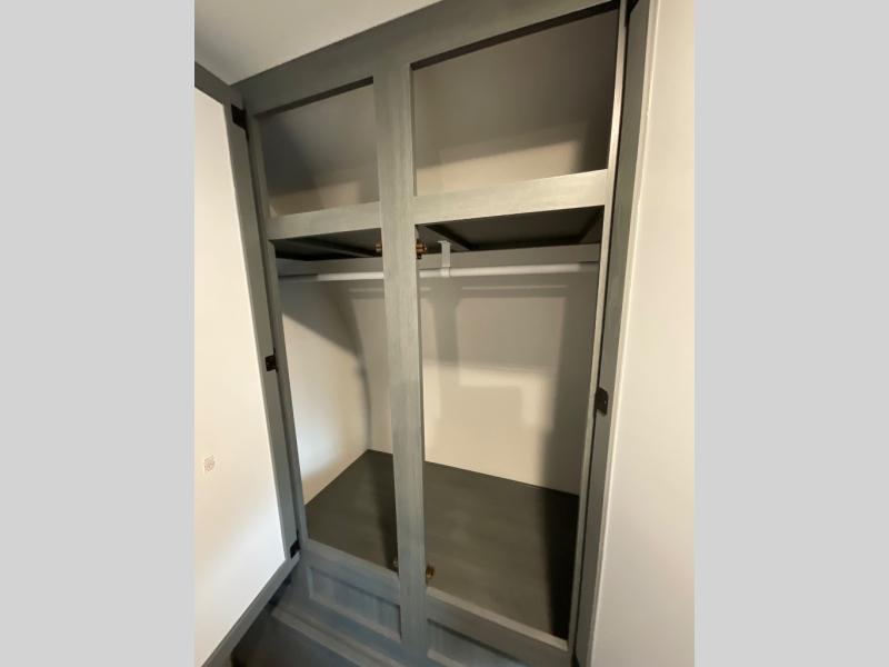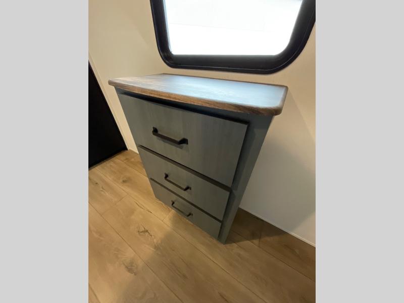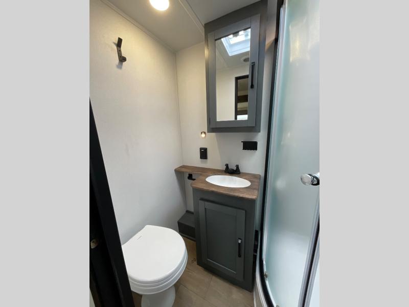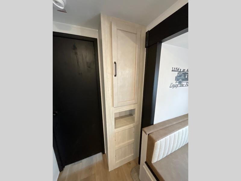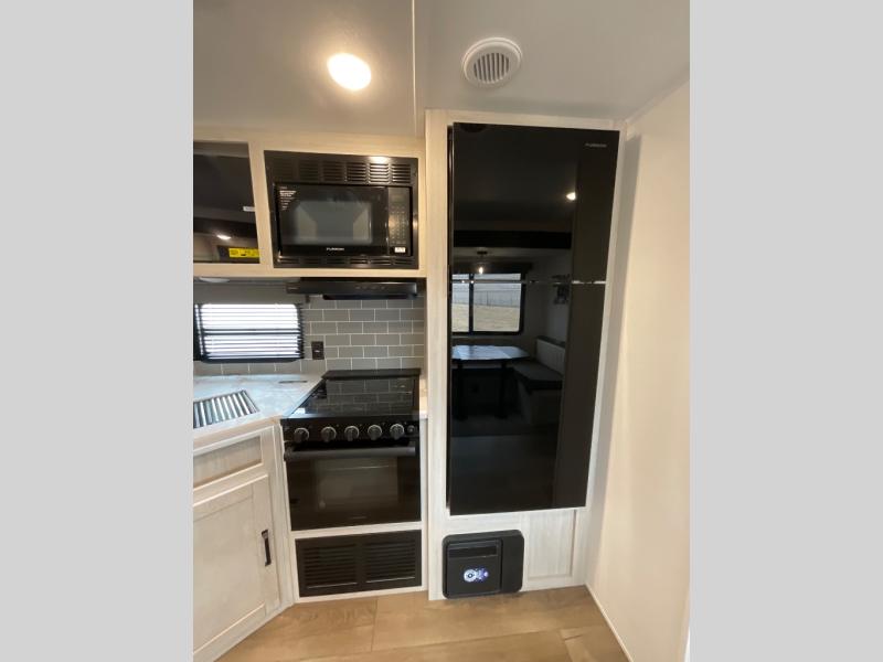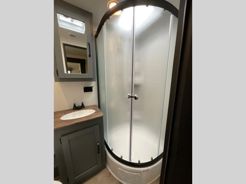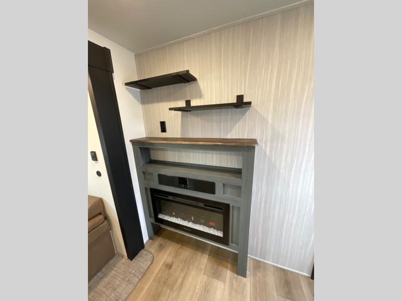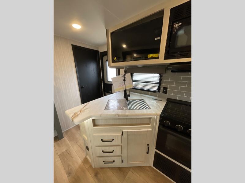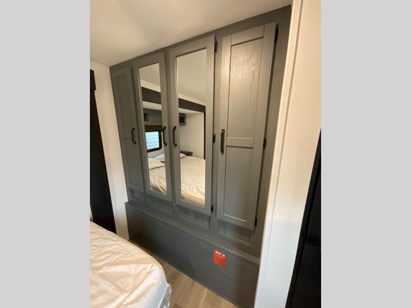 The whole family will love camping in this travel trailer! The kids will have their own privacy with the rear private bunkhouse which has a 32" x 69" bunk above a jiffy sofa slide and a 38" x 76" bunk above an entertainment center to keep them occupied on those rainy days. And you will have your own privacy with the front private bedroom that has a queen bed slide across from a dresser and a front closet. There is even a second closet with washer and dryer prep if you choose to add those appliances. Everyone can stay clean in the full bathroom with the 34" x 34" radius shower and their bellies full with the full kitchen. And you can choose between two outside kitchen options for even more convenience!