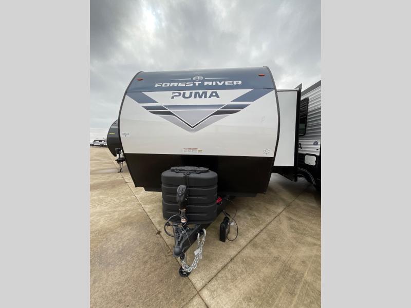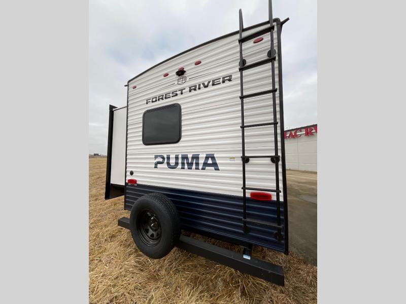 If you're looking for family-fun adventures, then you need one of these Forest River Puma travel trailers! They are built rugged, easy to tow, and jam packed with features. The Darco wrapped underbelly will help protect your unit, and the roof and side mount solar prep gives you the option to add off-grid power. Inside, the Congoleum linoleum will be easy to keep clean, and the night roller shades will provide privacy when it's time to turn in. You'll also enjoy an electric awning with an LED light strip plus an AM/FM/Bluetooth stereo and two outside speakers to keep the party going!