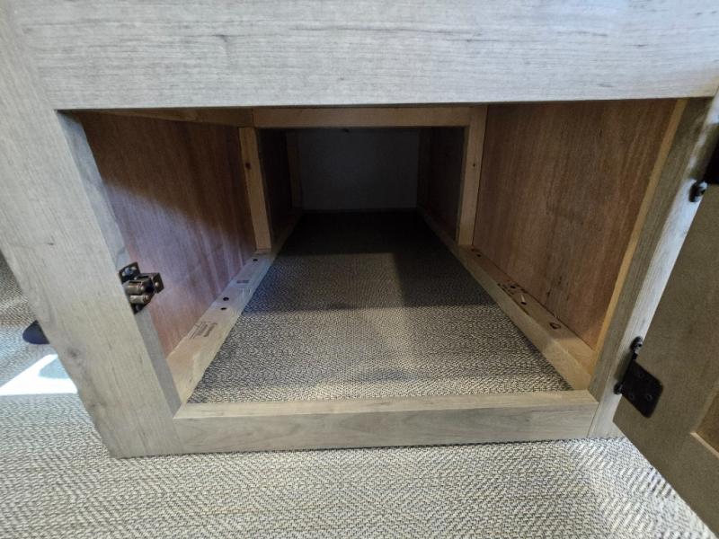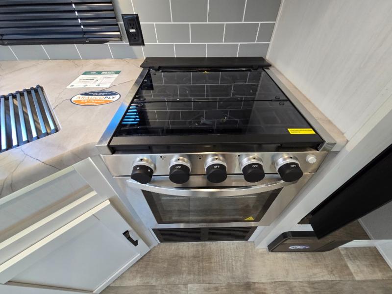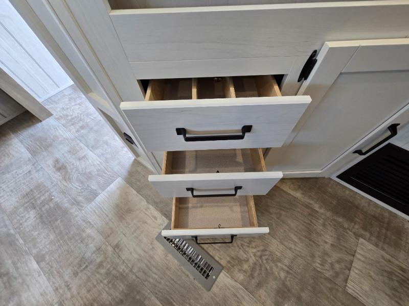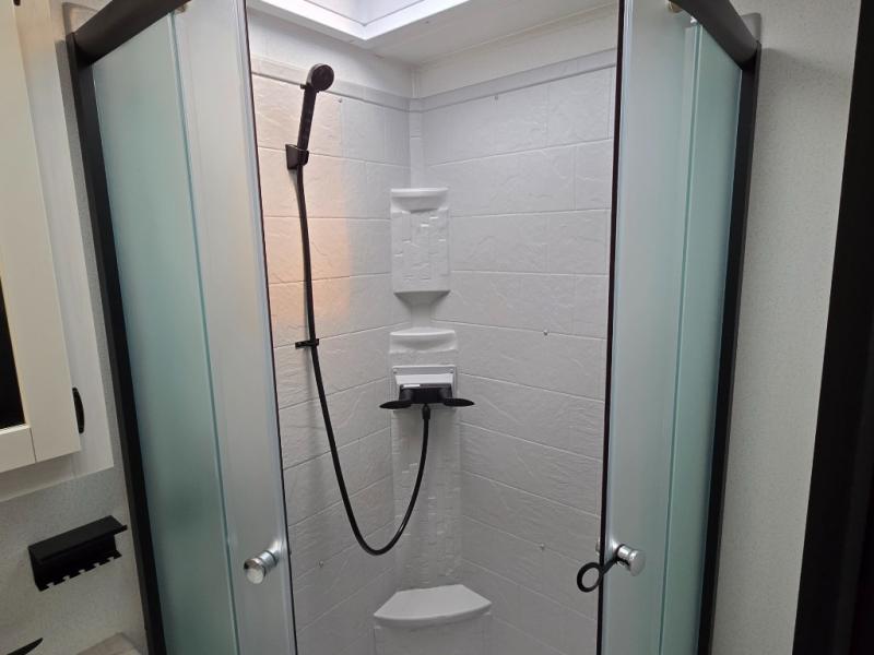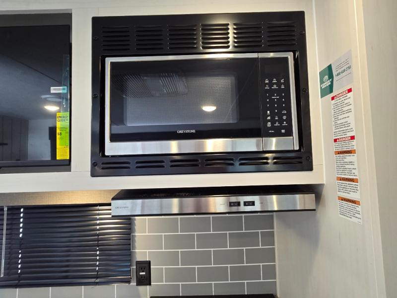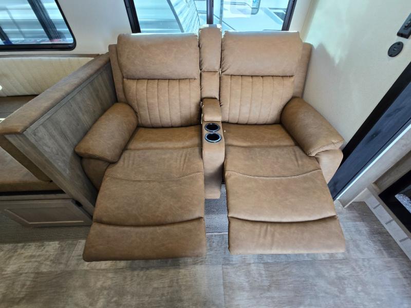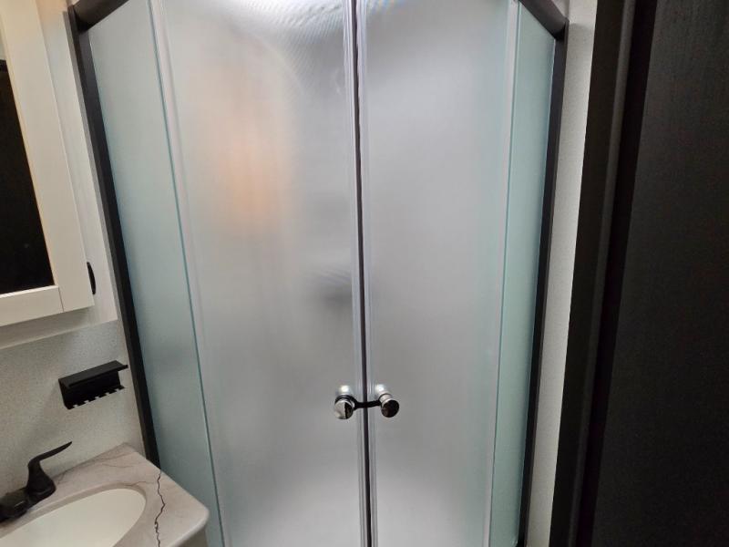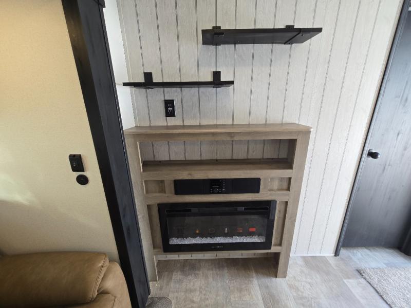 The centrally located kitchen comes fully equipped for mealtime, while the U-shaped dinette offers the perfect spot for family meals or game night. Kick back on the sofa and enjoy movie nights by the entertainment center with fireplace. The 34" x 34" radius shower in the full bath and outside shower ensure everyone stays fresh and clean.