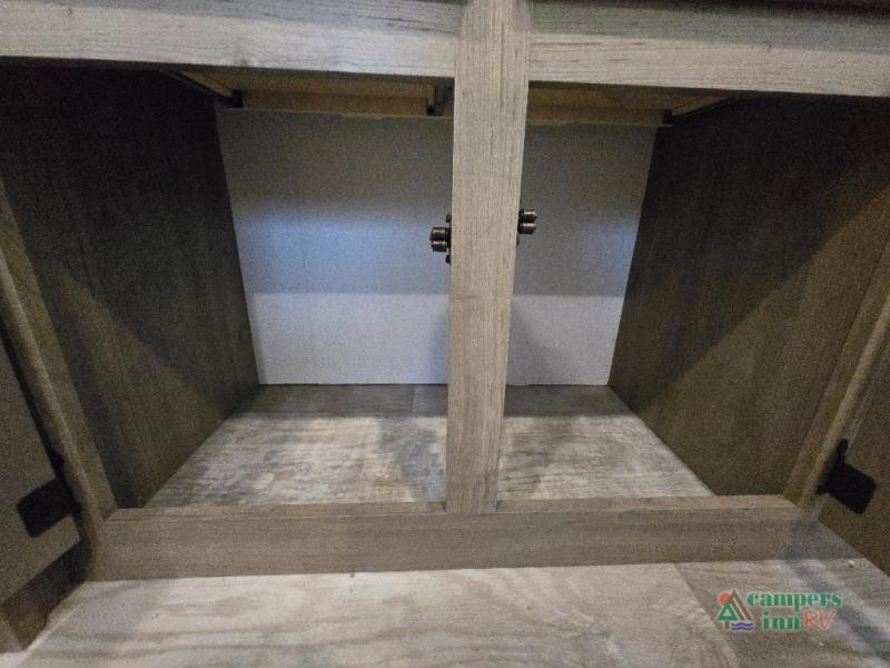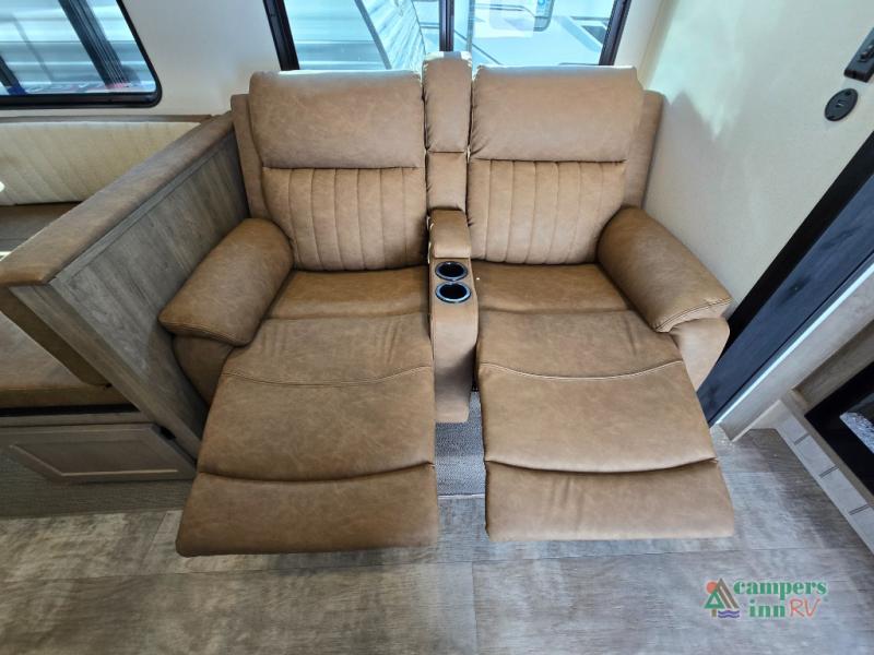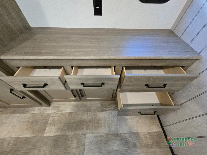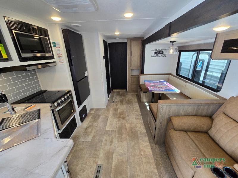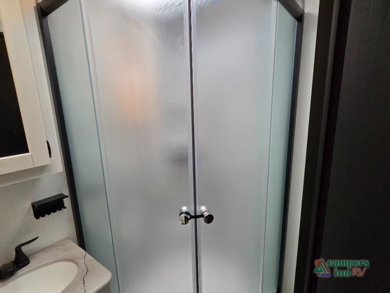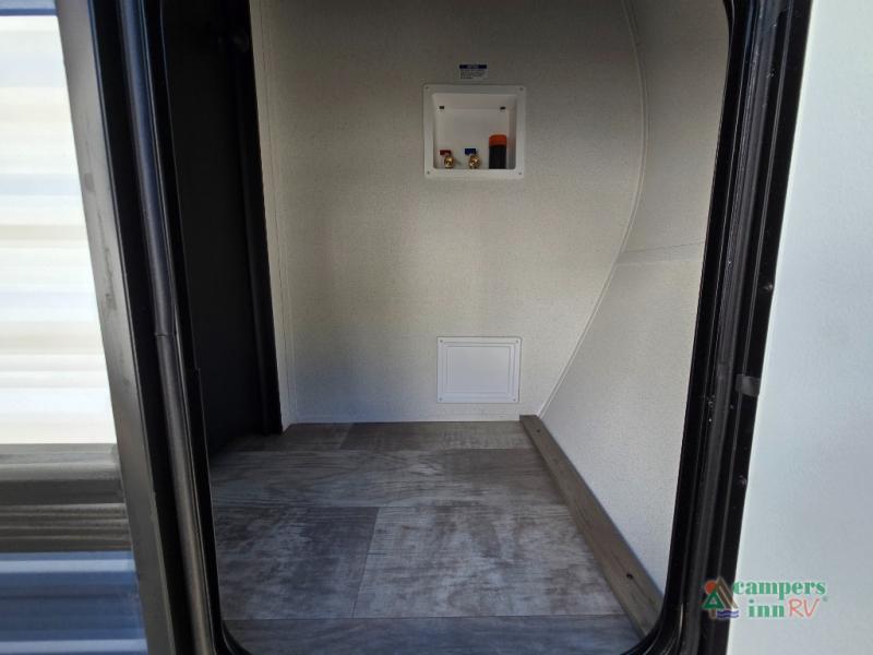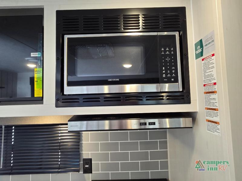 Enjoy your own privacy with two bedrooms in this travel trailer! The front private bedroom has a queen bed slide across from a dresser and a front closet with another closet with washer and dryer prep. The rear private bedroom has a 60" x 74" queen bed slide, a dresser, and a closet. Everyone can stay clean in the full bathroom with the 34" x 34" radius shower and their bellies full with a full kitchen. Enjoy your meals at the U-shaped dinette then relax on the sofa while watching your favorite movies with the entertainment center and fireplace.