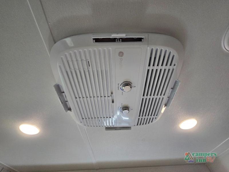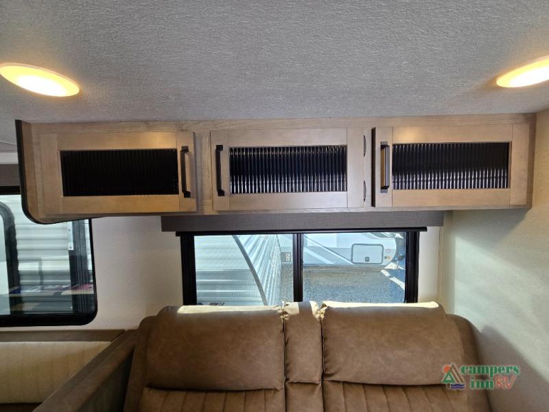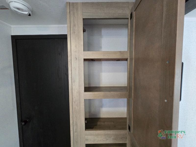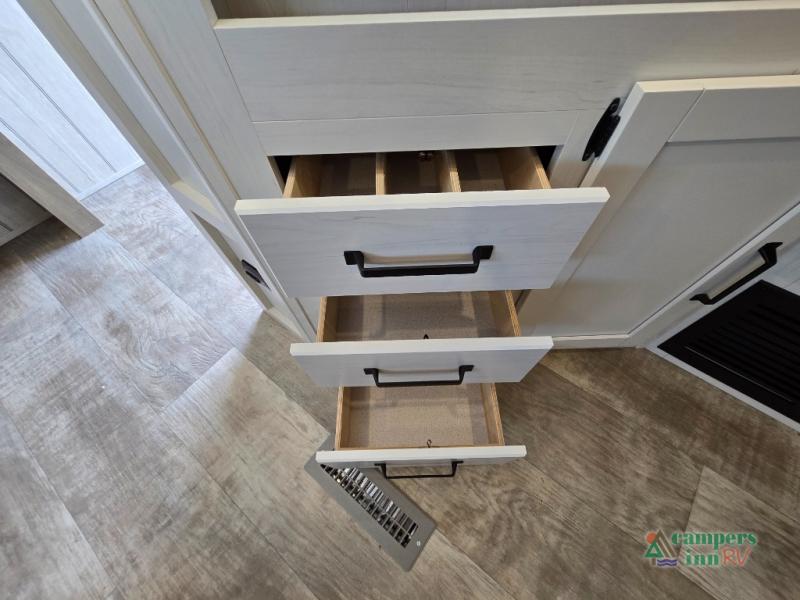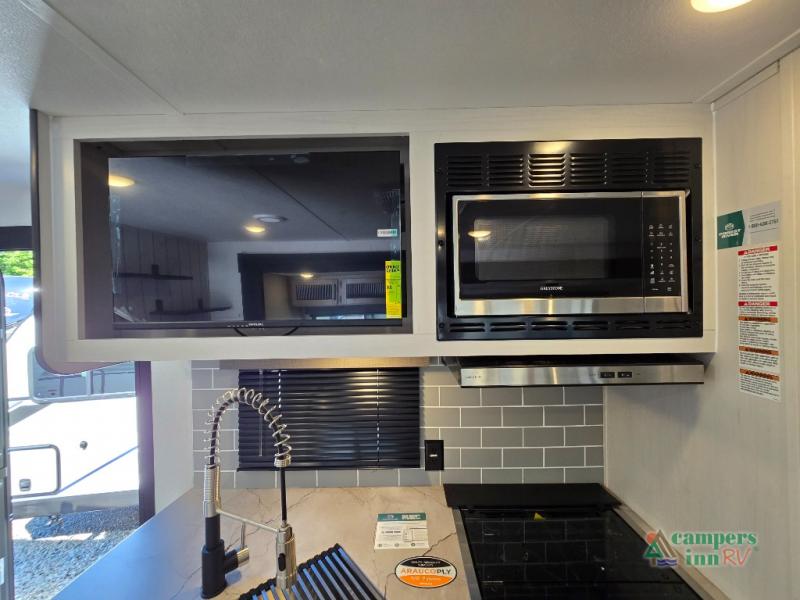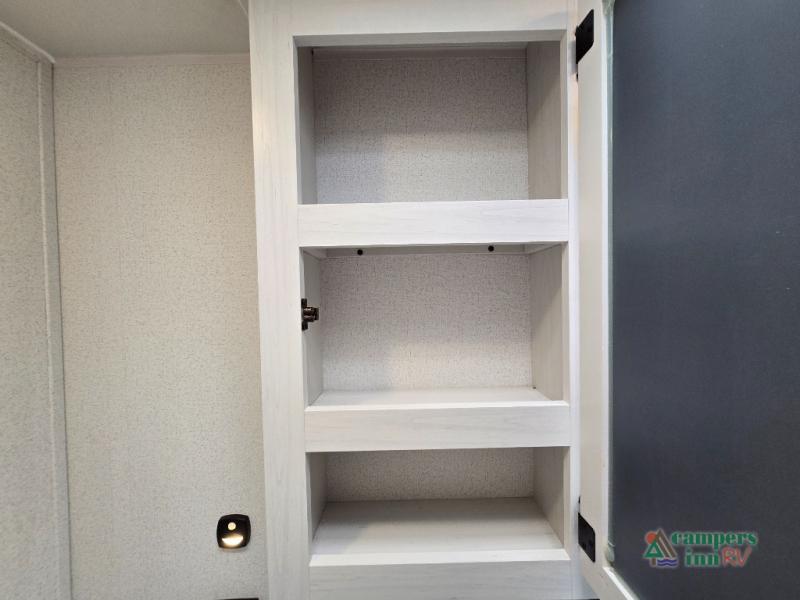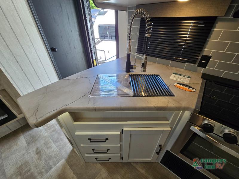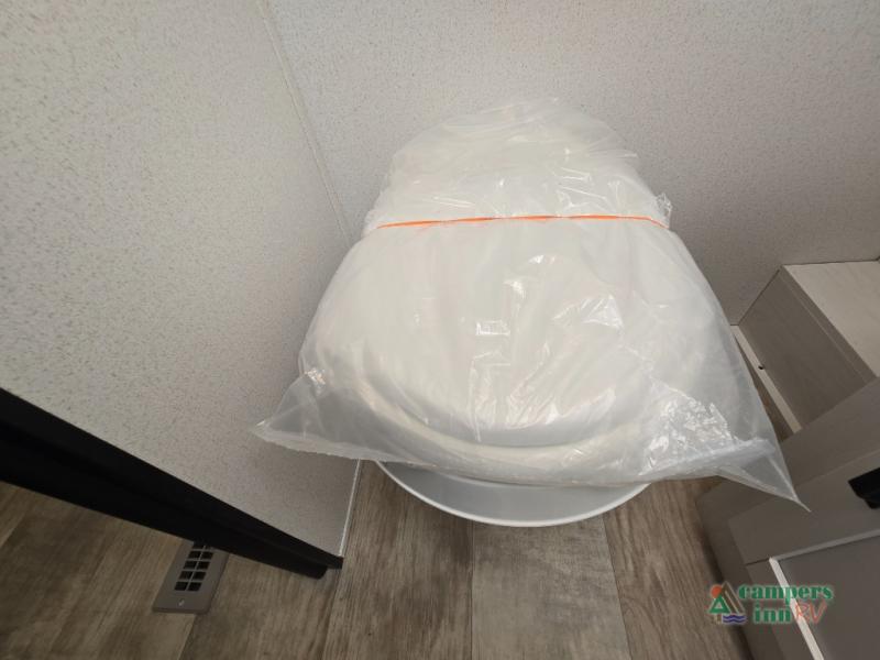 Enjoy your own privacy with two bedrooms in this travel trailer! The front private bedroom has a queen bed slide across from a dresser and a front closet with another closet with washer and dryer prep. The rear private bedroom has a 60" x 74" queen bed slide, a dresser, and a closet. Everyone can stay clean in the full bathroom with the 34" x 34" radius shower and their bellies full with a full kitchen. Enjoy your meals at the U-shaped dinette then relax on the sofa while watching your favorite movies with the entertainment center and fireplace.