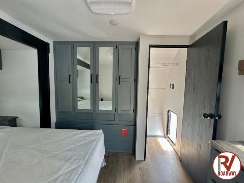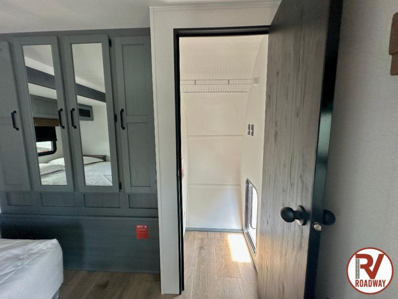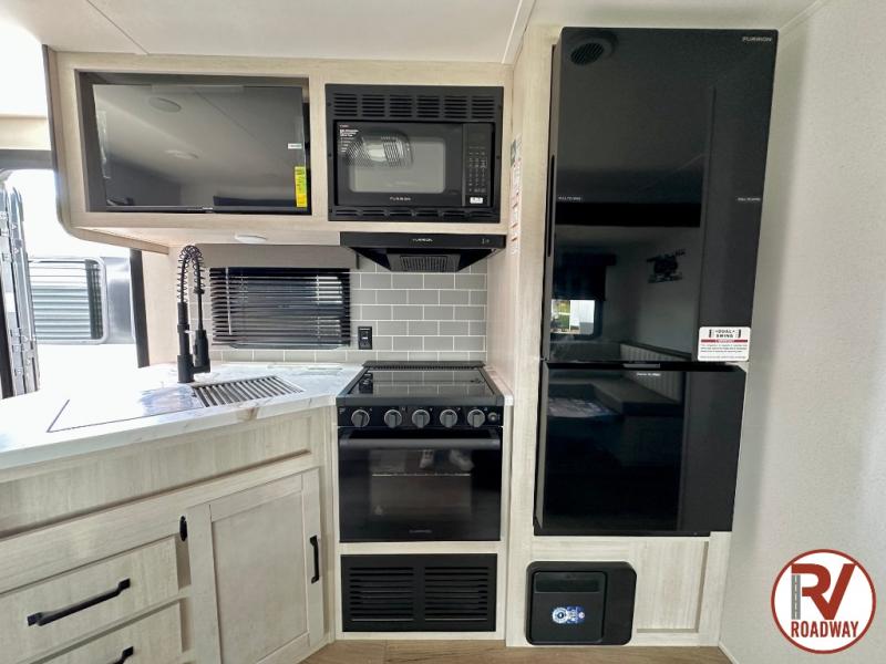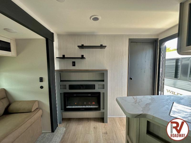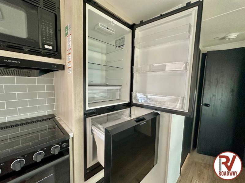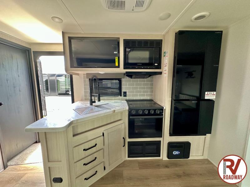 Enjoy your own privacy with two bedrooms in this travel trailer! The front private bedroom has a queen bed slide across from a dresser and a front closet with another closet with washer and dryer prep. The rear private bedroom has a 60" x 74" queen bed slide, a dresser, and a closet. Everyone can stay clean in the full bathroom with the 34" x 34" radius shower and their bellies full with a full kitchen. Enjoy your meals at the U-shaped dinette then relax on the sofa while watching your favorite movies with the entertainment center and fireplace.