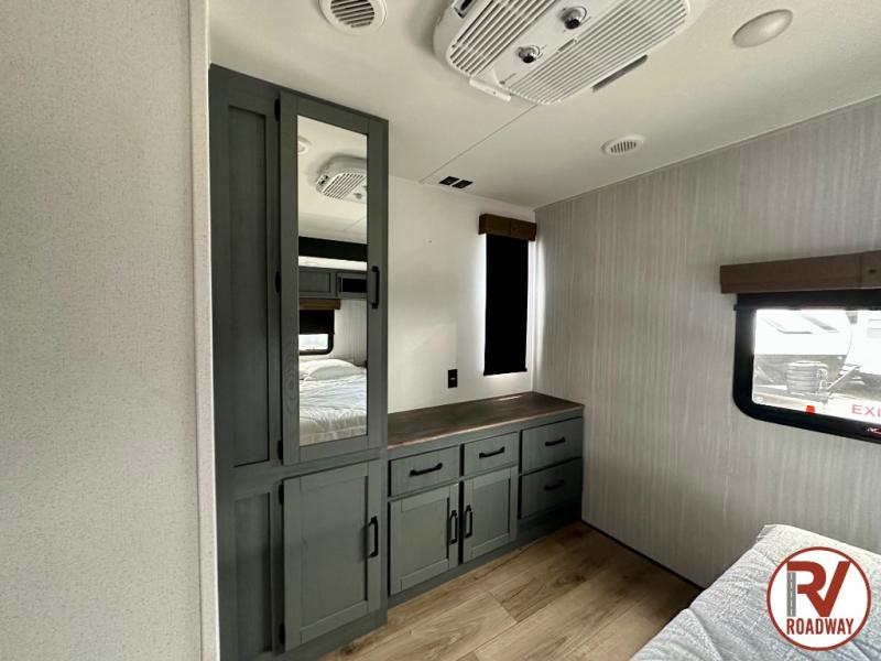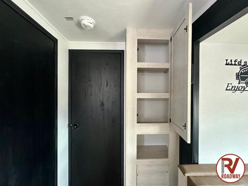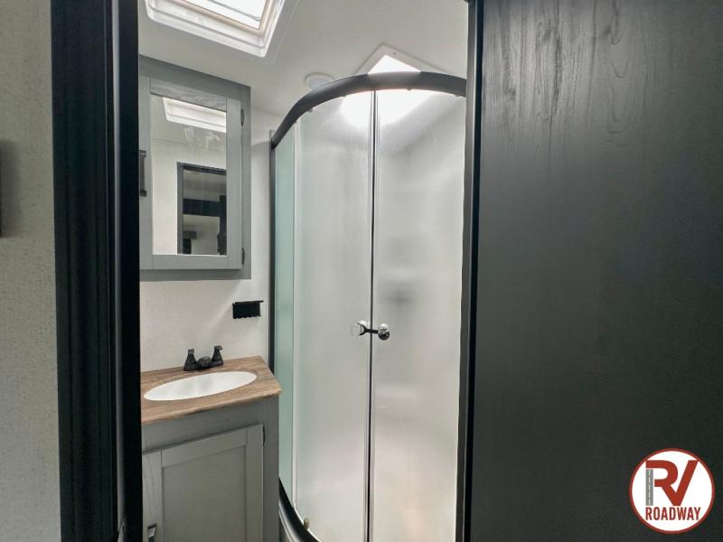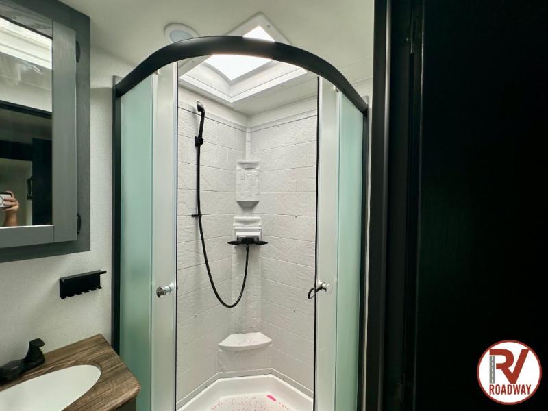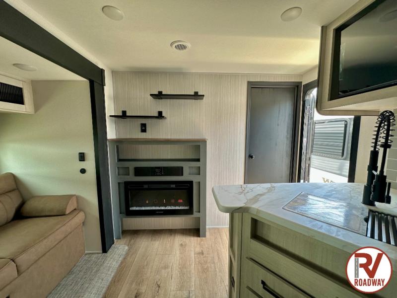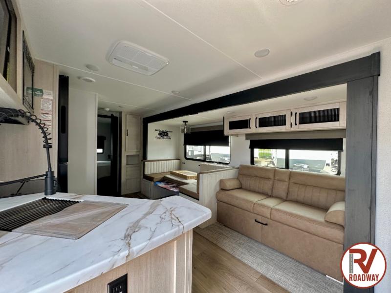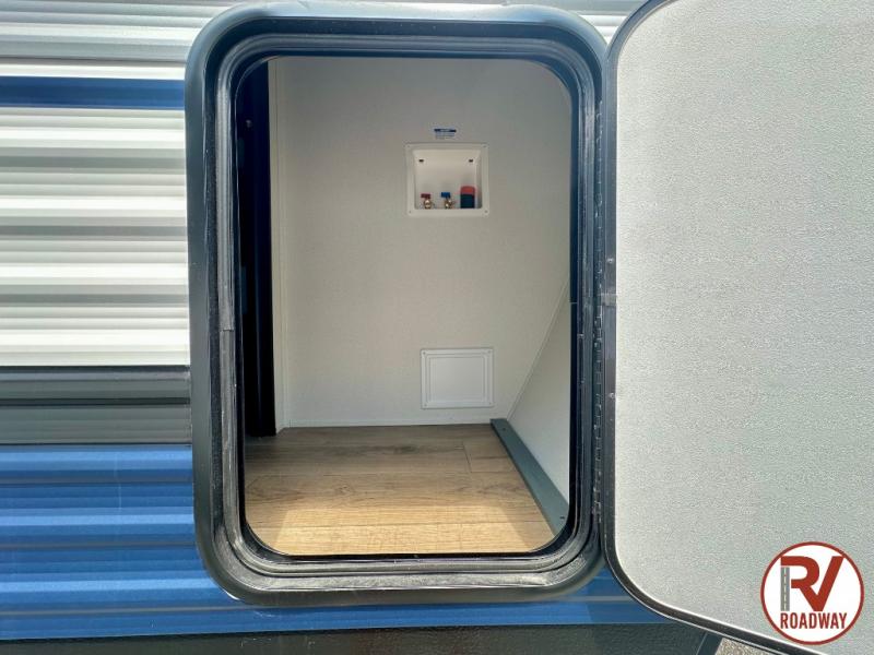 Enjoy your own privacy with two bedrooms in this travel trailer! The front private bedroom has a queen bed slide across from a dresser and a front closet with another closet with washer and dryer prep. The rear private bedroom has a 60" x 74" queen bed slide, a dresser, and a closet. Everyone can stay clean in the full bathroom with the 34" x 34" radius shower and their bellies full with a full kitchen. Enjoy your meals at the U-shaped dinette then relax on the sofa while watching your favorite movies with the entertainment center and fireplace.